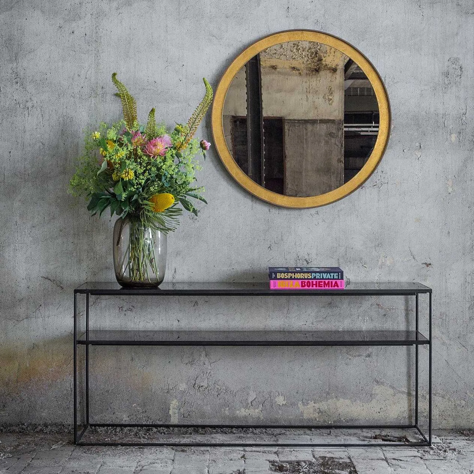 - Heavy aged mirror top, black metal frame.