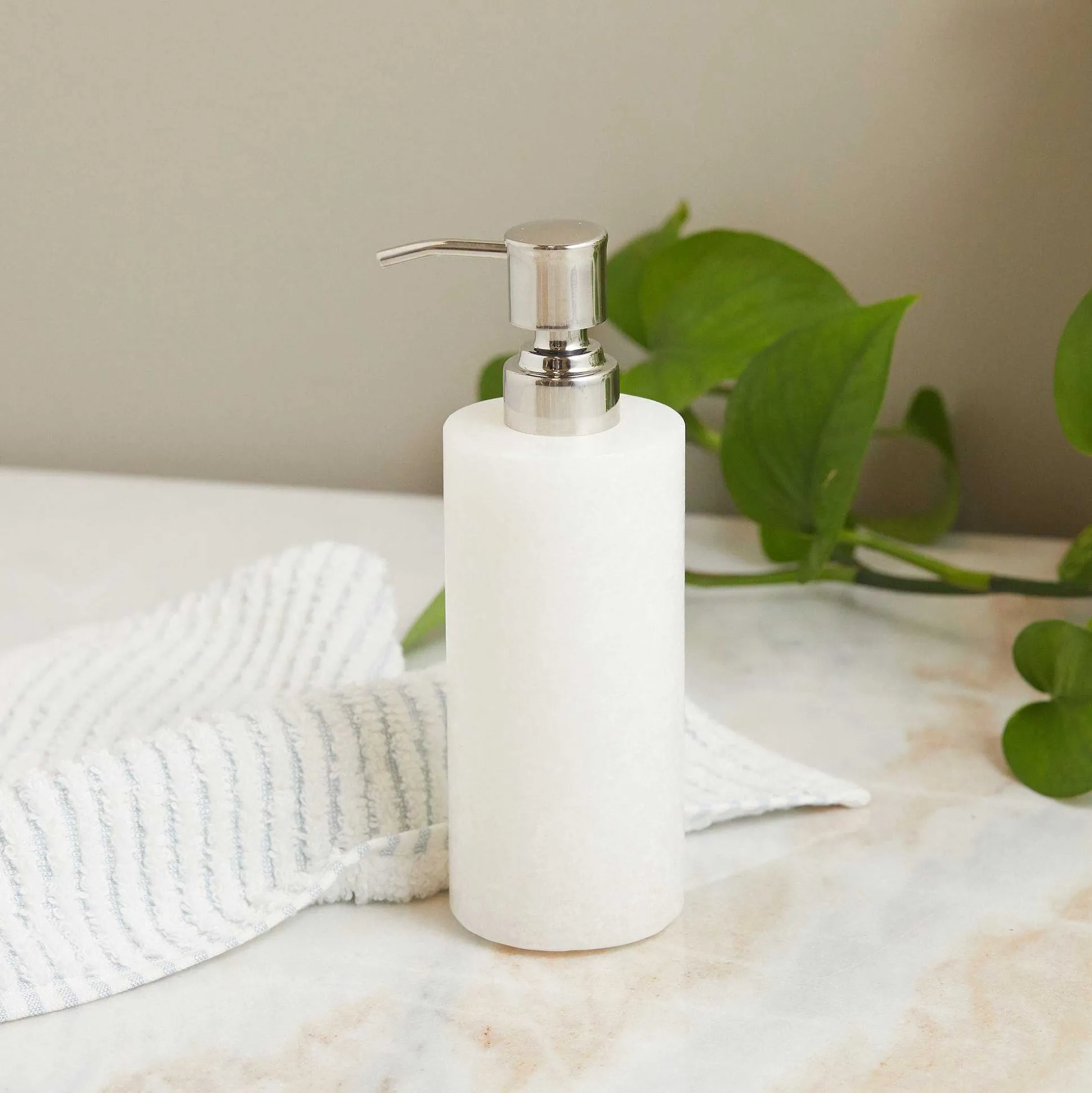 Crafted from luxuriant alabaster, the naturally marbled veining of each distinct collection piece brings artful elegance to the bathroom.