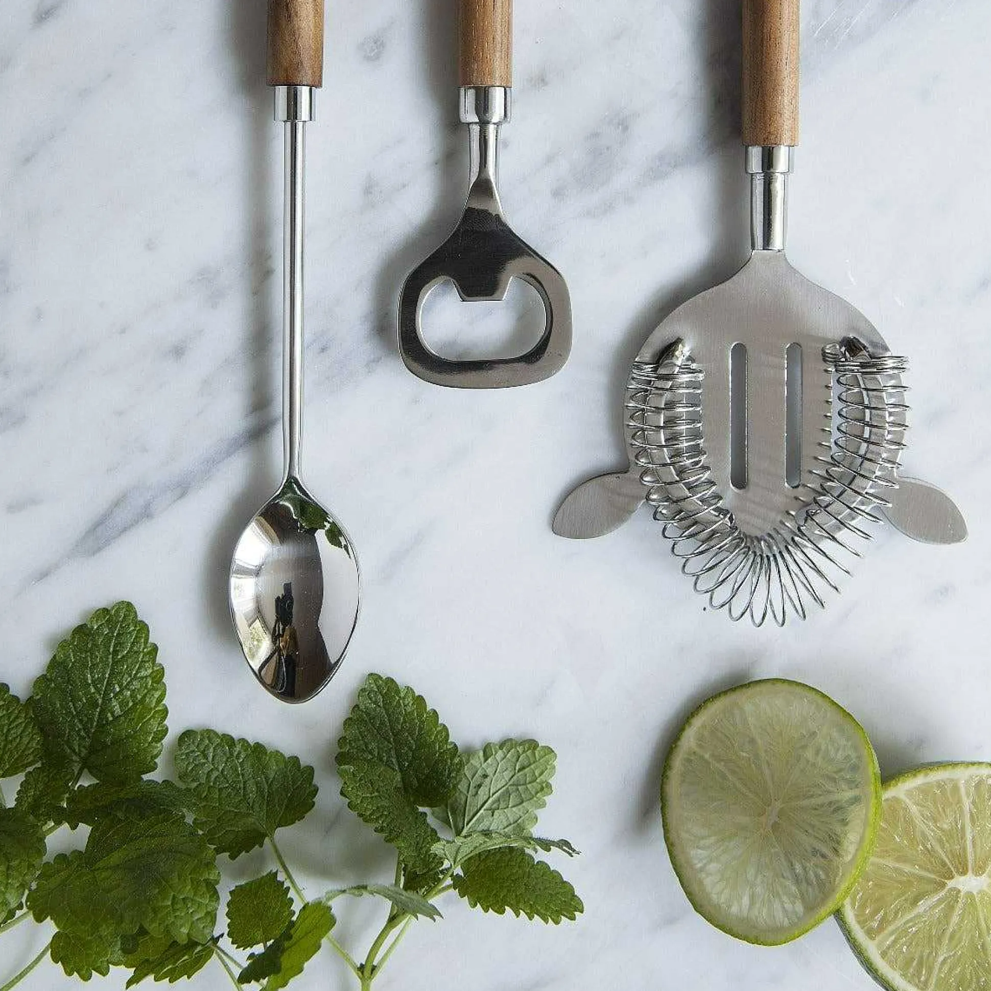 Keep calm and enjoy happy hour with these must-have bar tools. Sleek and sturdy in design, our Almora Bar Set includes a strainer, bottle opener, and a mixing spoon. Masterfully mix even the most precise of cocktails with curved teak handles for extra support, sustainably harvested and crafted by hand in Thailand.