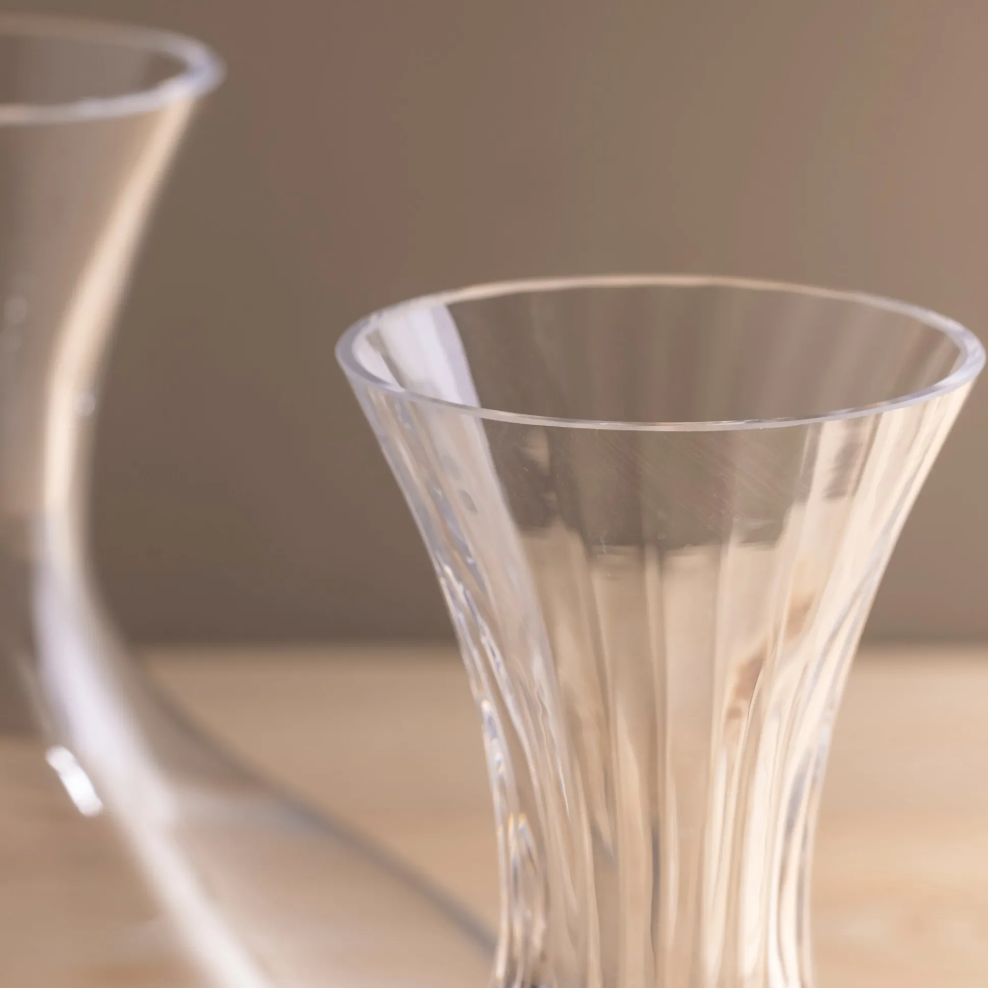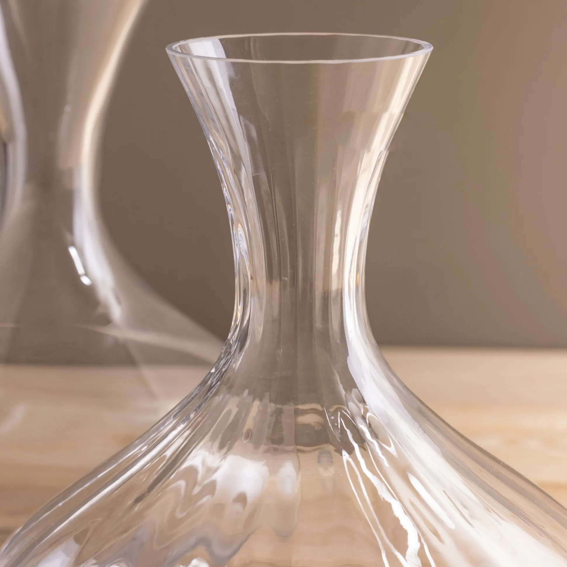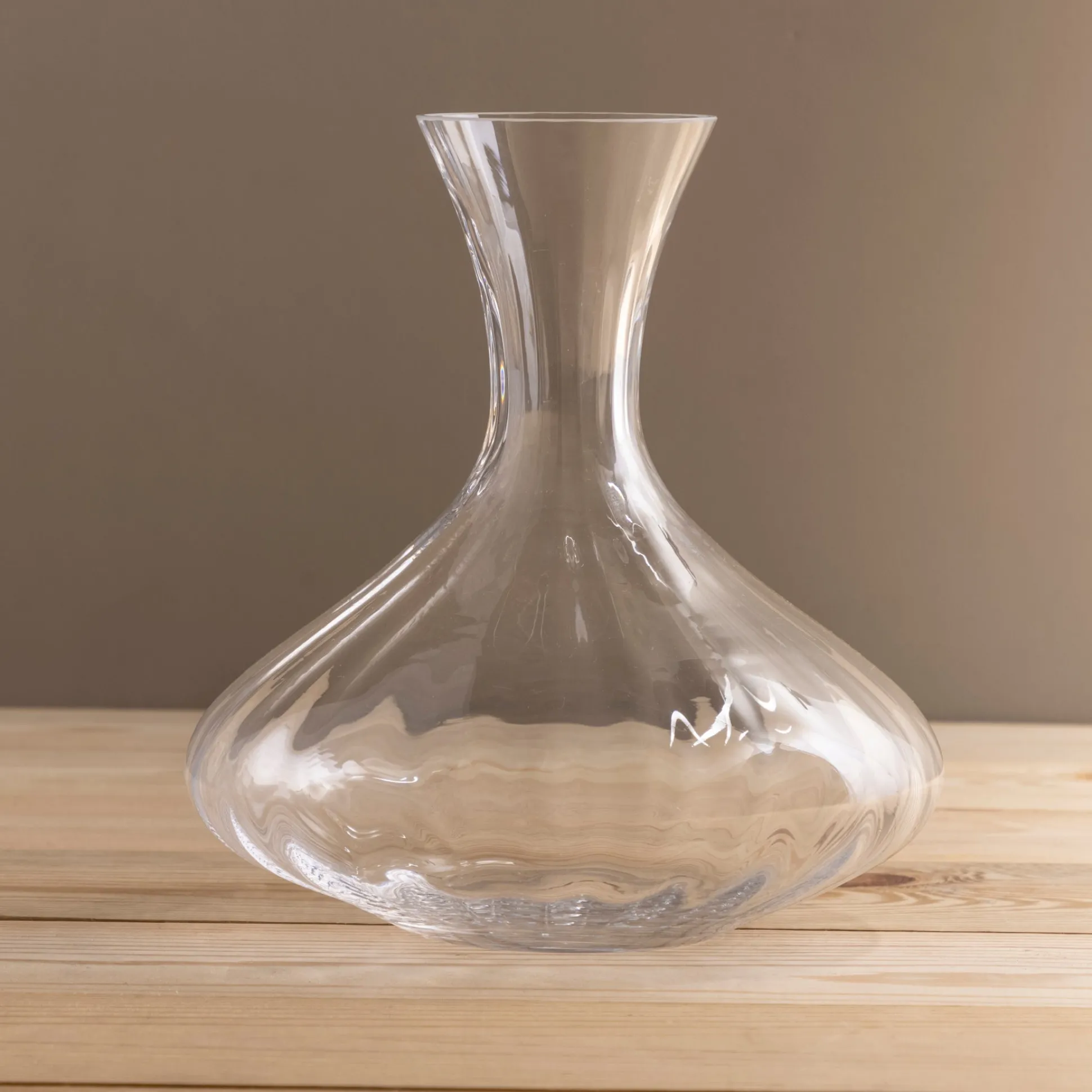 A classic wine carafe with a finely fluted finish, mouth blown by skilled glassblowers. The wide body allows for decanted wine to breathe. The subtle texture catches and reflects the light.