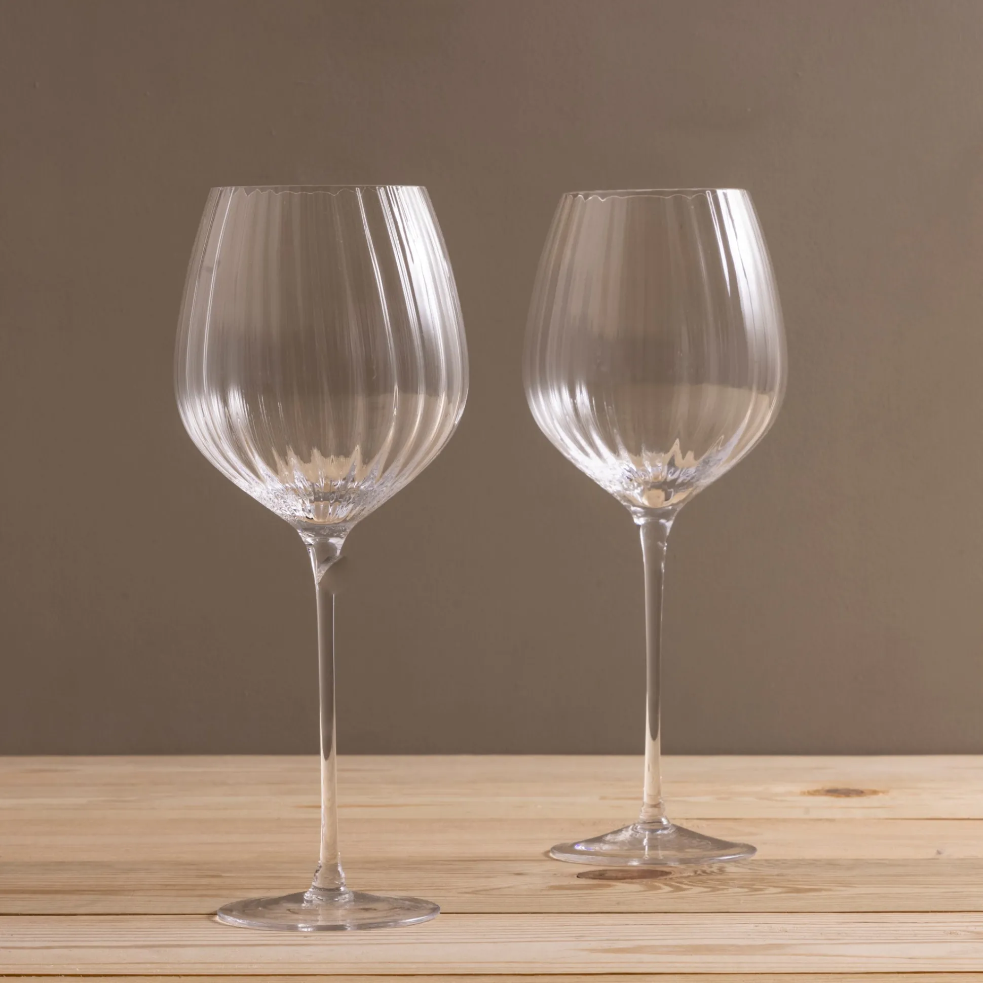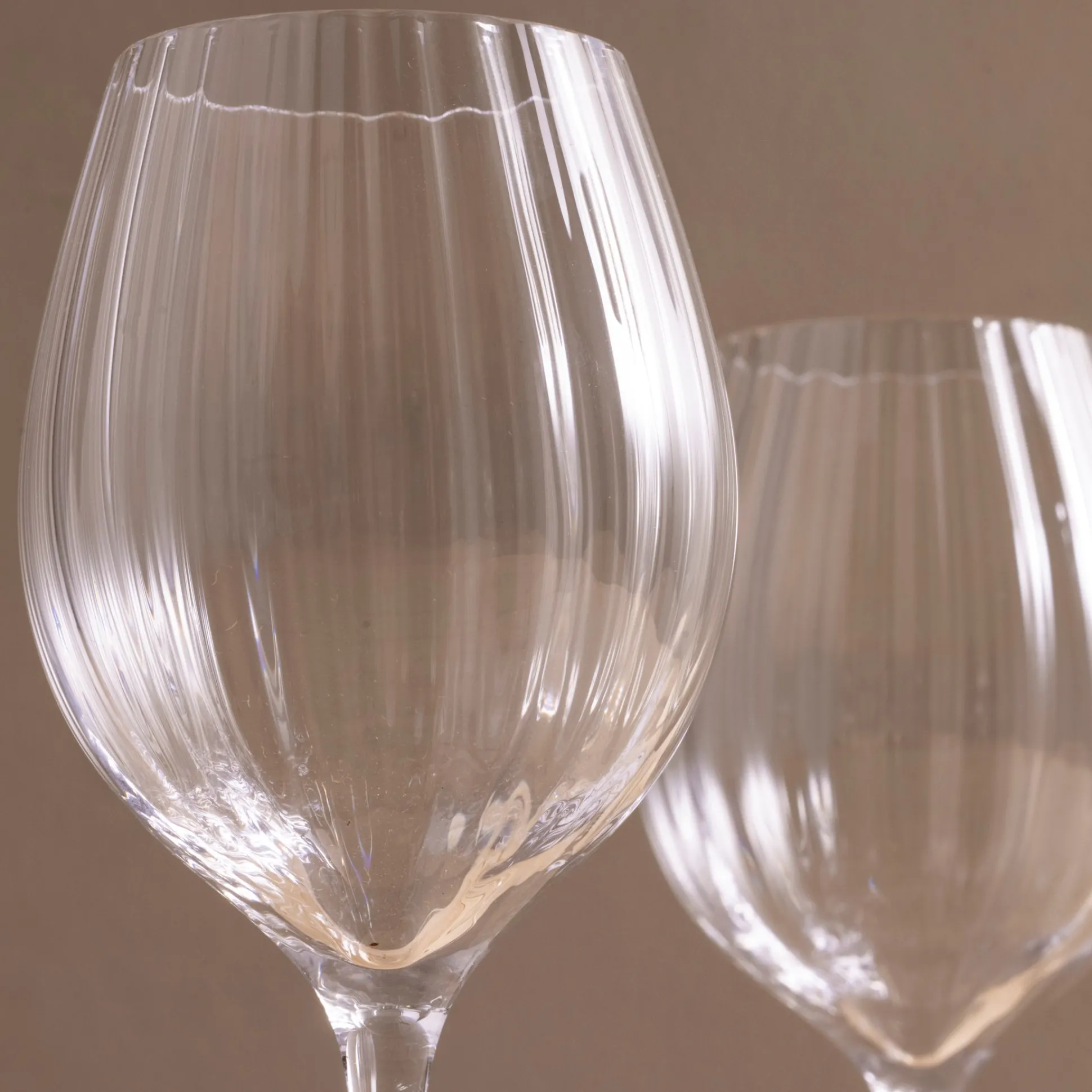 Set of four delicately pleated wine glasses with slim tulip-shaped bowls. The subtle texture catches and reflects the light.