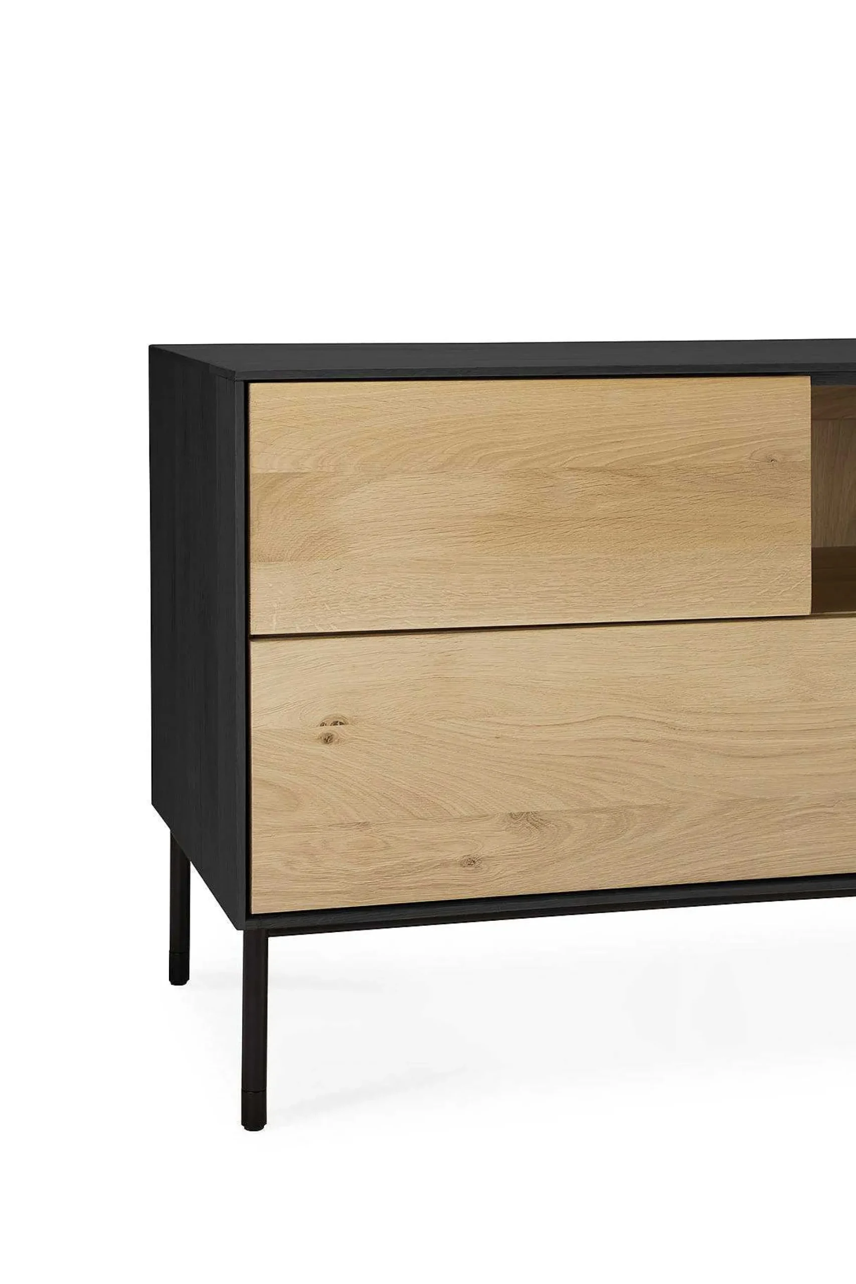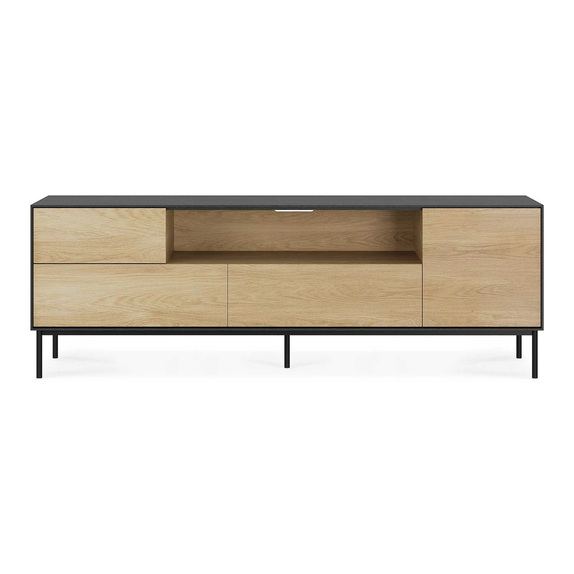 - The Blackbird TV cupboard features 1 push open door, 1 flip-down door and 2 push open drawers.