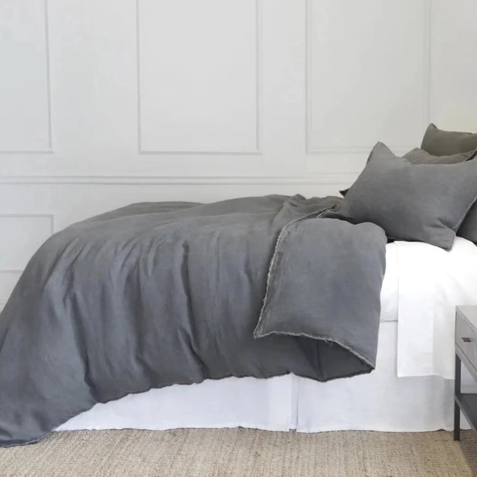 This collection is youthful and casual with subtle frayed edges. Made of 100% linen, the duvet cover and shams are finished with simple tie closures.
