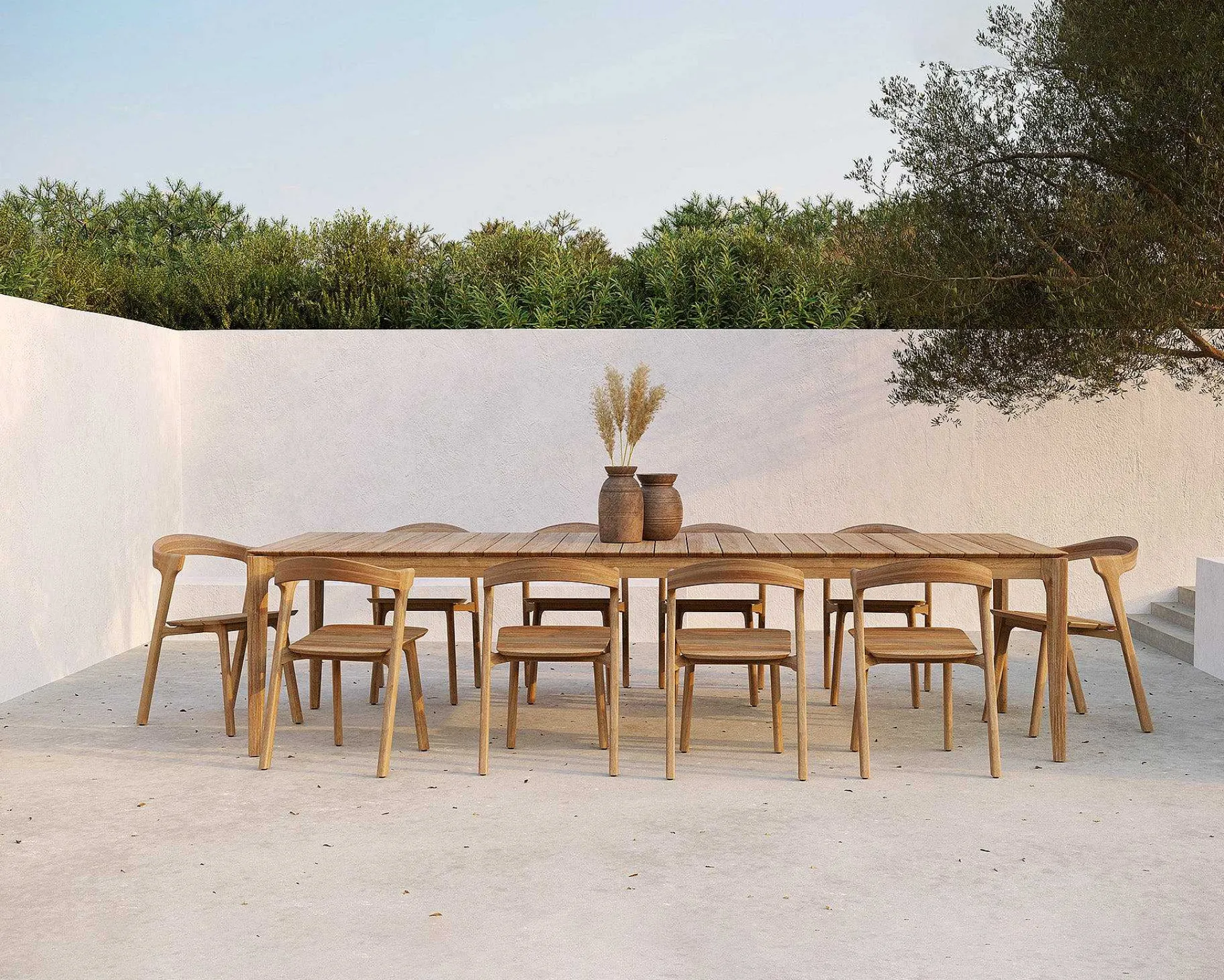 The Bok collection combines sculptural elegance and contemporary crafting into a graceful and airy form. Just like its matching chair, the Bok dining table is another signature design. Its airy shape yet rock-solid construction make this piece a timeless and remarkable design to enjoy for all the years to come, while the adapted grooved tabletop in solid teak makes outdoor life a simple pleasure.