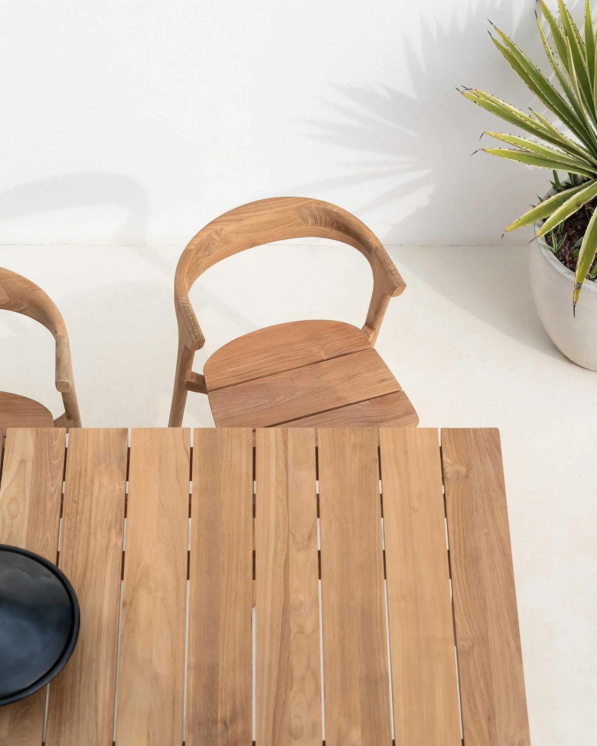 The Bok collection combines sculptural elegance and contemporary crafting into a graceful and airy form. Just like its matching chair, the Bok dining table is another signature design. Its airy shape yet rock-solid construction make this piece a timeless and remarkable design to enjoy for all the years to come, while the adapted grooved tabletop in solid teak makes outdoor life a simple pleasure.