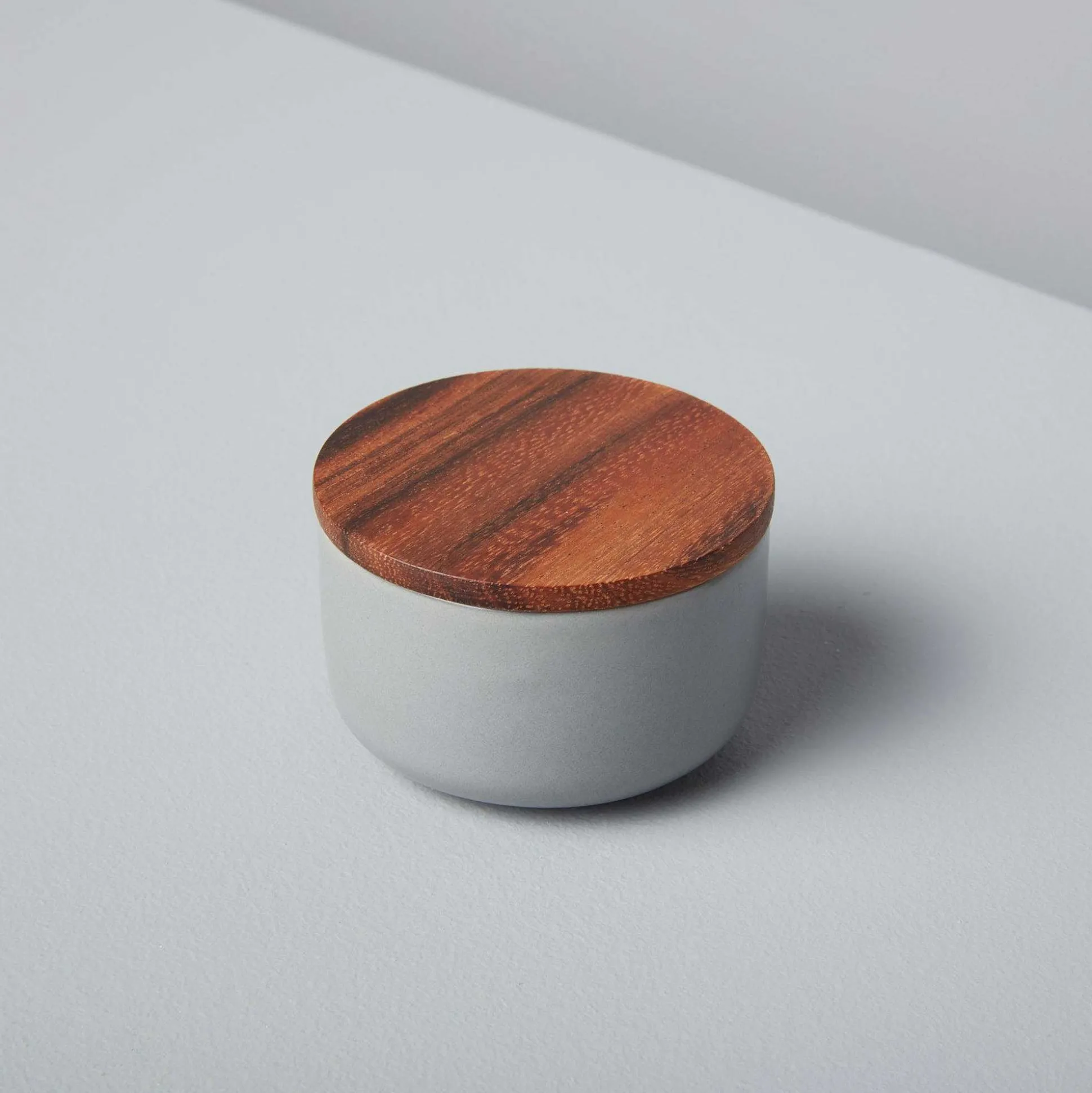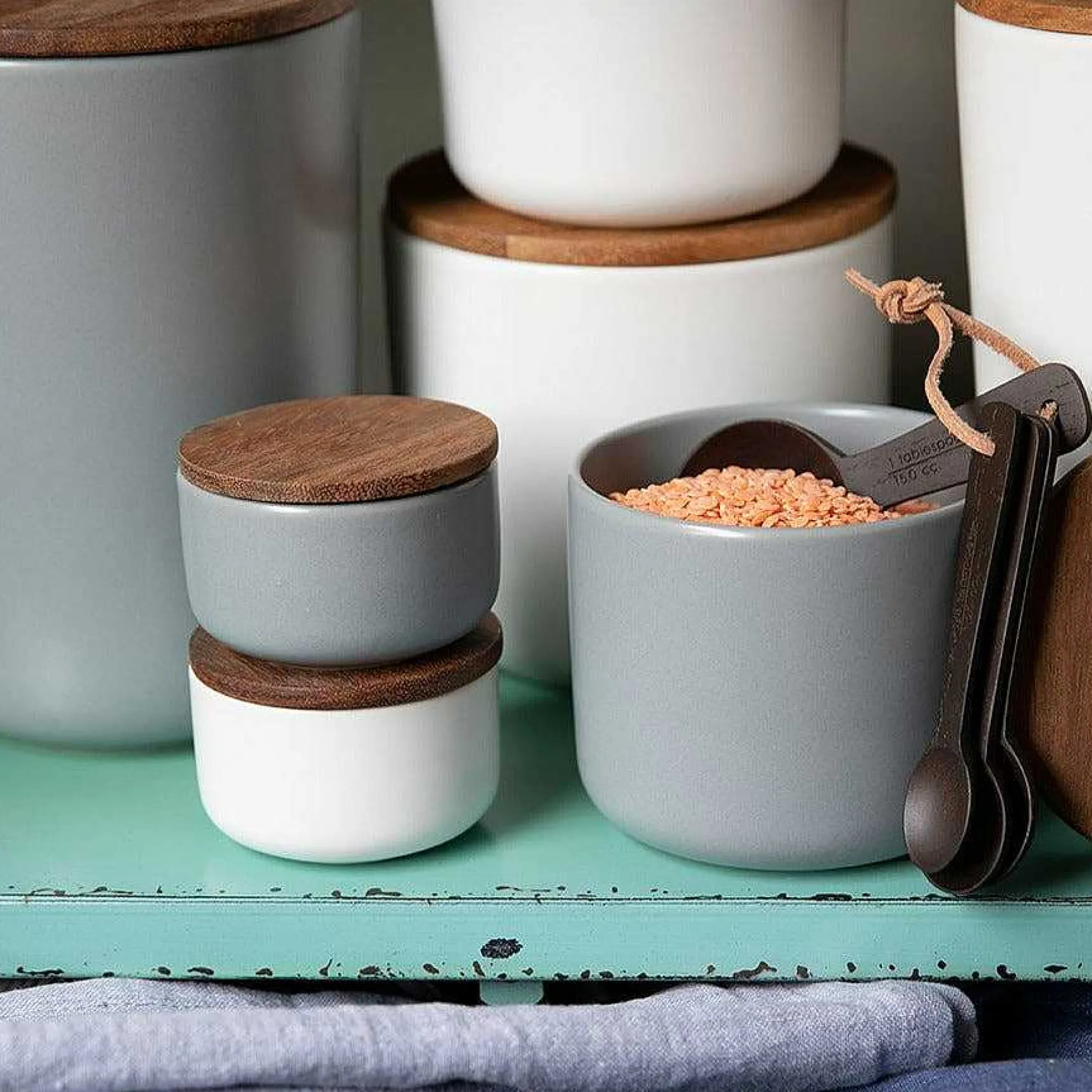 Store your goods in style with these small stoneware canisters, accented with an Acacia wood lid to keep your items fresh. Compact stoneware pieces are perfect as a feature in your kitchen, keeping anything from pasta and grains to your favorite sweet snacks, even fuzzy cotton balls in the bathroom.