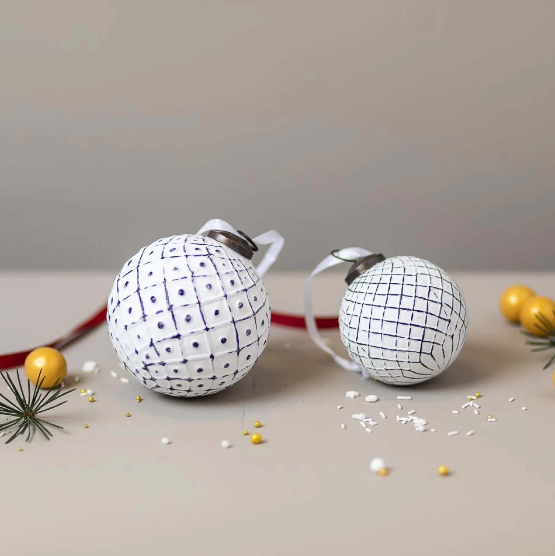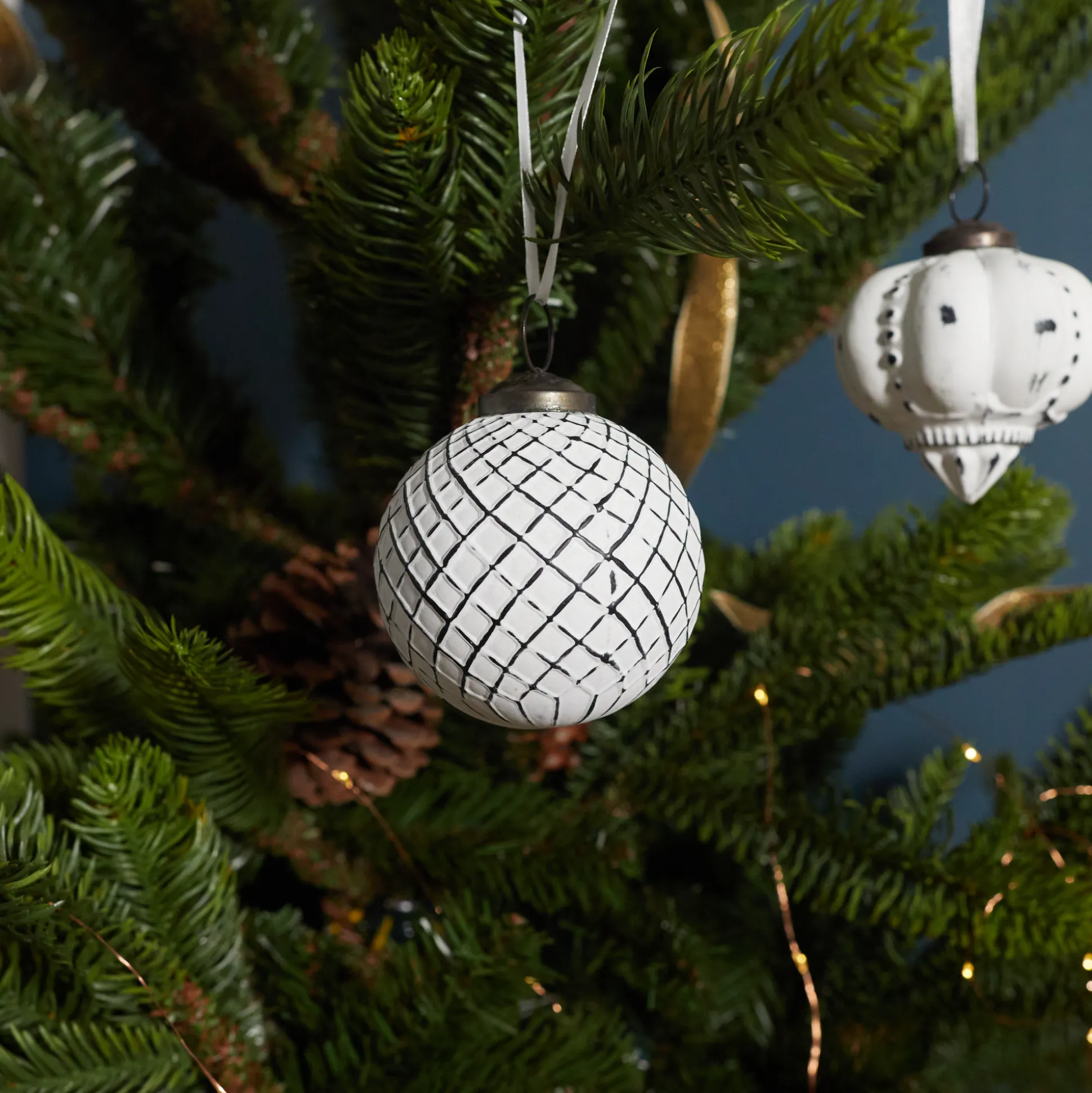 These holiday baubles look as if they’ve been dusted with the season’s first snow. Made of mouth blown glass (with 15% recycled content), these substantial ornaments are the antidote to cheap lightweight plastic. The textures and hand applied whitewash give each piece its own unique look.