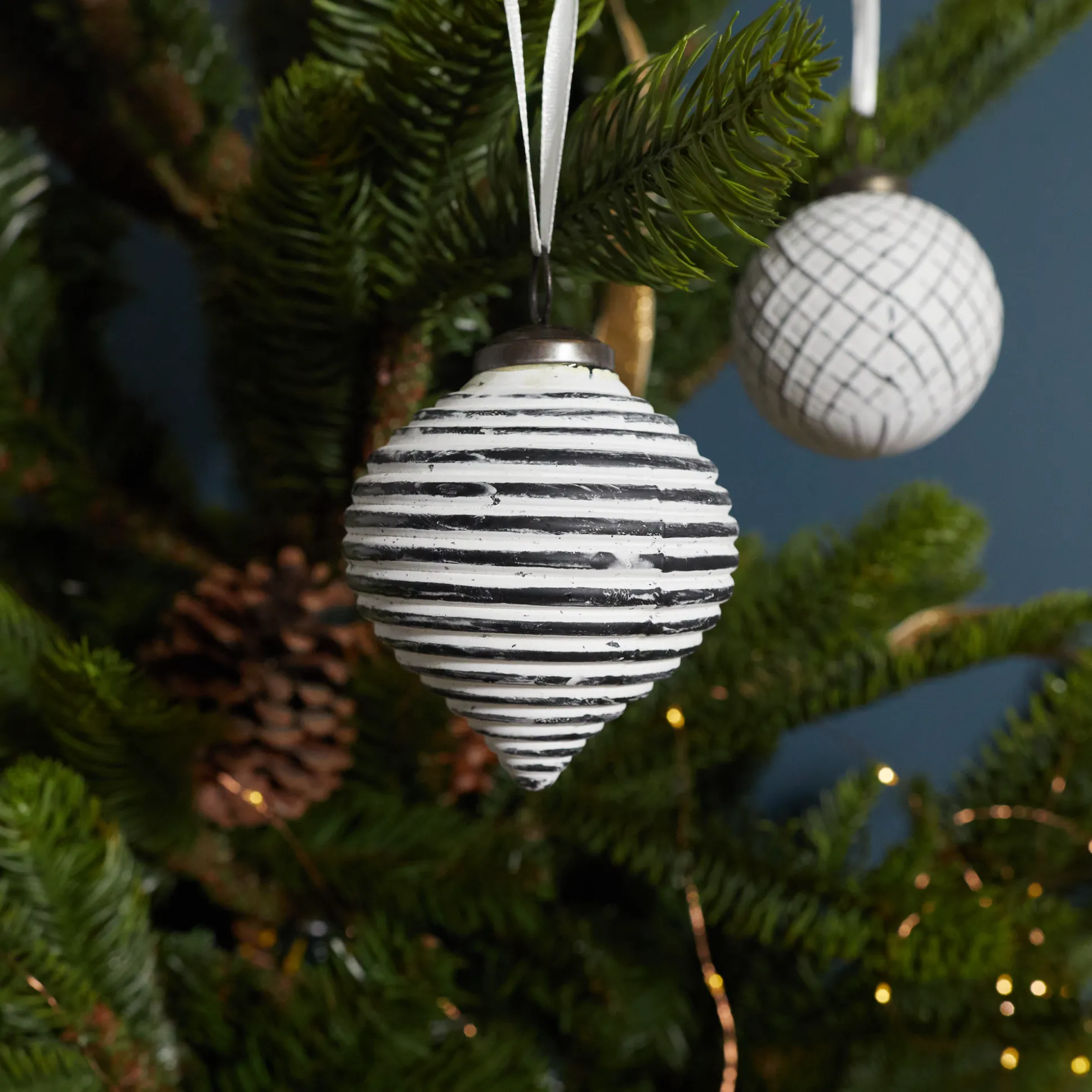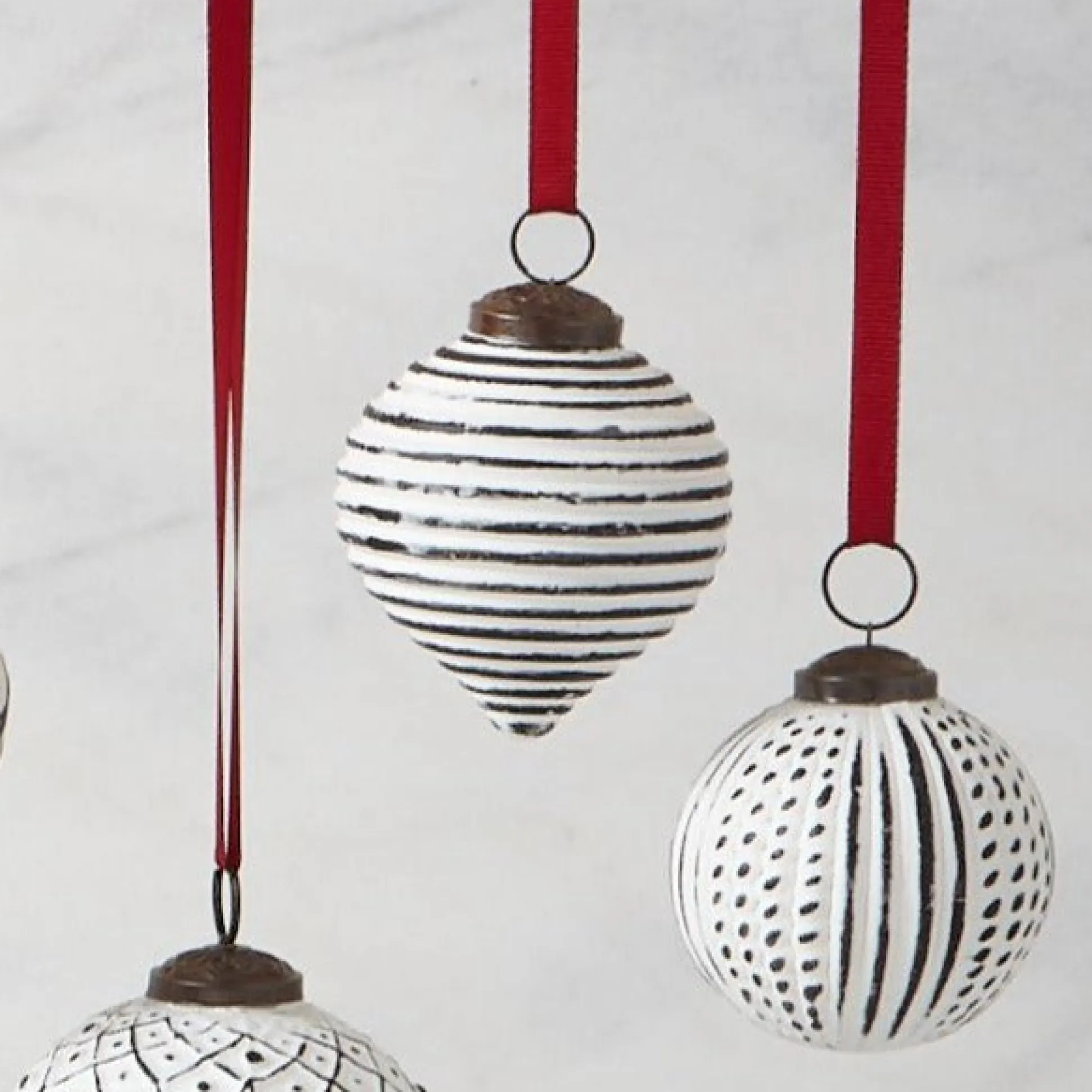 These holiday baubles look as if they’ve been dusted with the season’s first snow. Made of mouth blown glass (with 15% recycled content), these substantial ornaments are the antidote to cheap lightweight plastic. The textures and hand applied whitewash give each piece its own unique look.