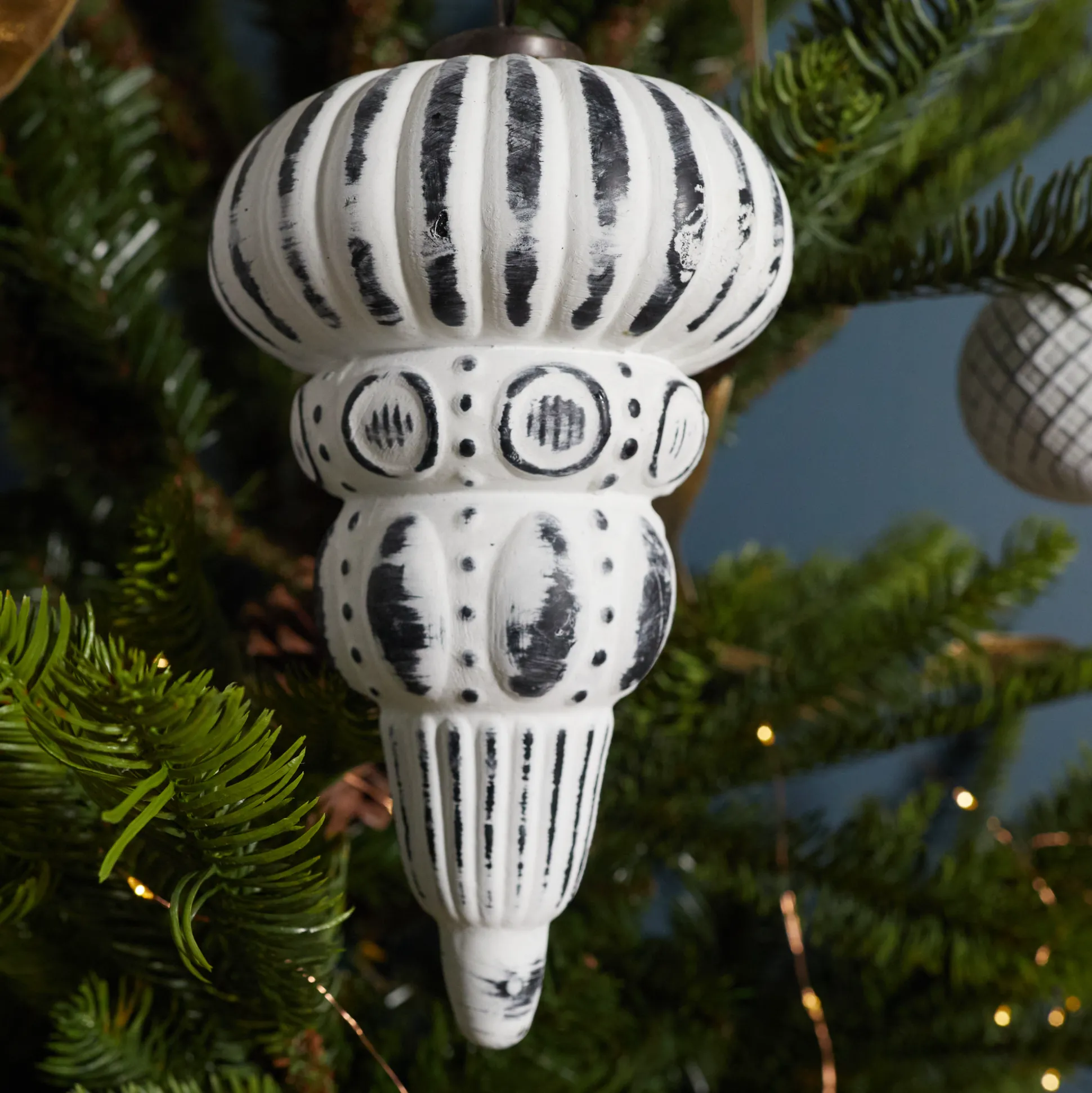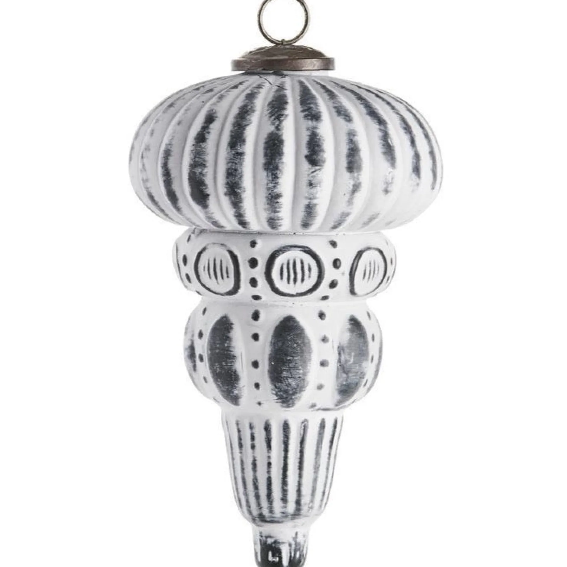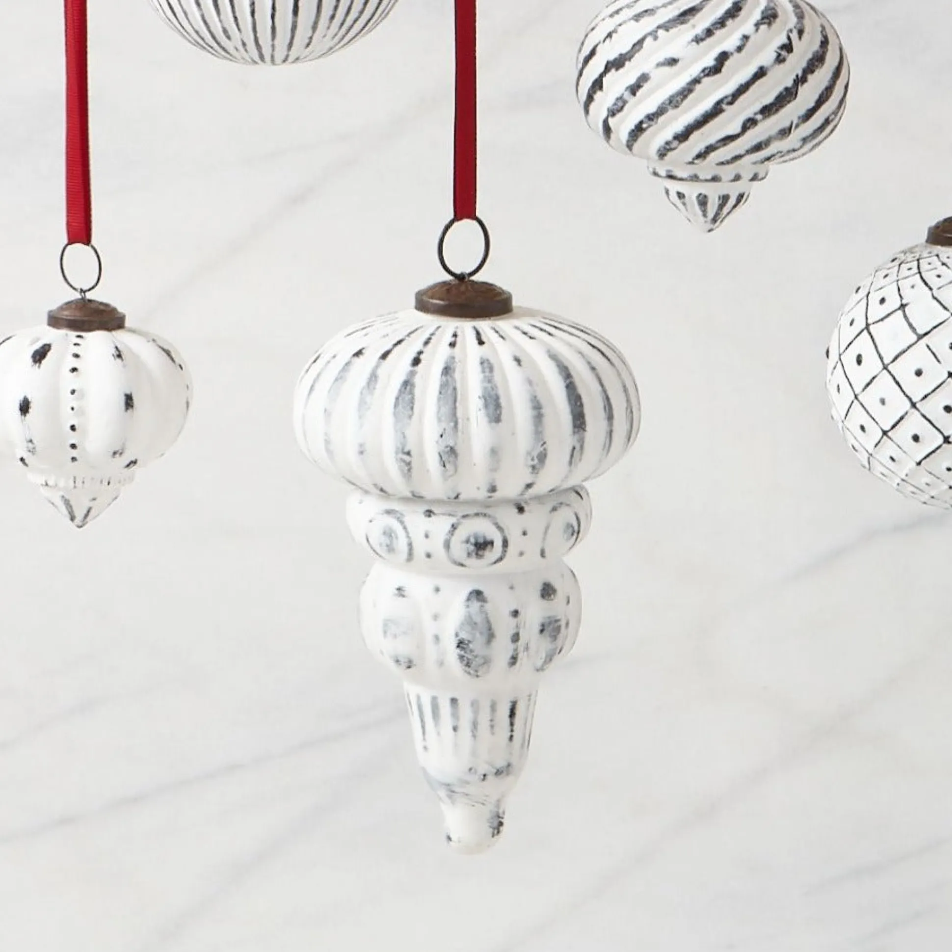 These holiday baubles look as if they’ve been dusted with the season’s first snow. Made of mouth blown glass (with 15% recycled content), these substantial ornaments are the antidote to cheap lightweight plastic. The textures and hand applied whitewash give each piece its own unique look.