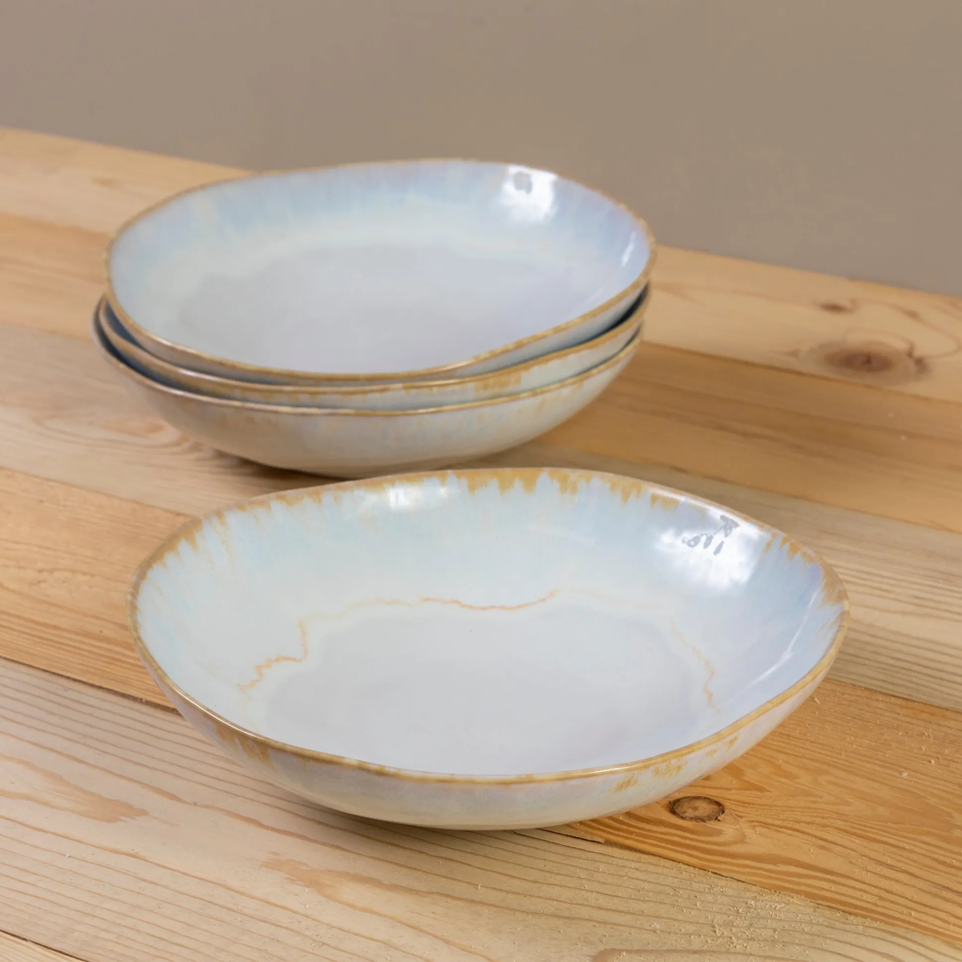 The warm breeze that blows from the east and cascades along the Algarve coast with fruity aromas and the fresh flavors of Ria Formosa was the inspiration for this collection. The blended white and blue glazes and organic shapes transport us to the intricate landscape of lagoons, canals, salt works, and sandy beaches stretching across deserted islands. This collection adds light to every gathering and turns any table into a memorable experience.