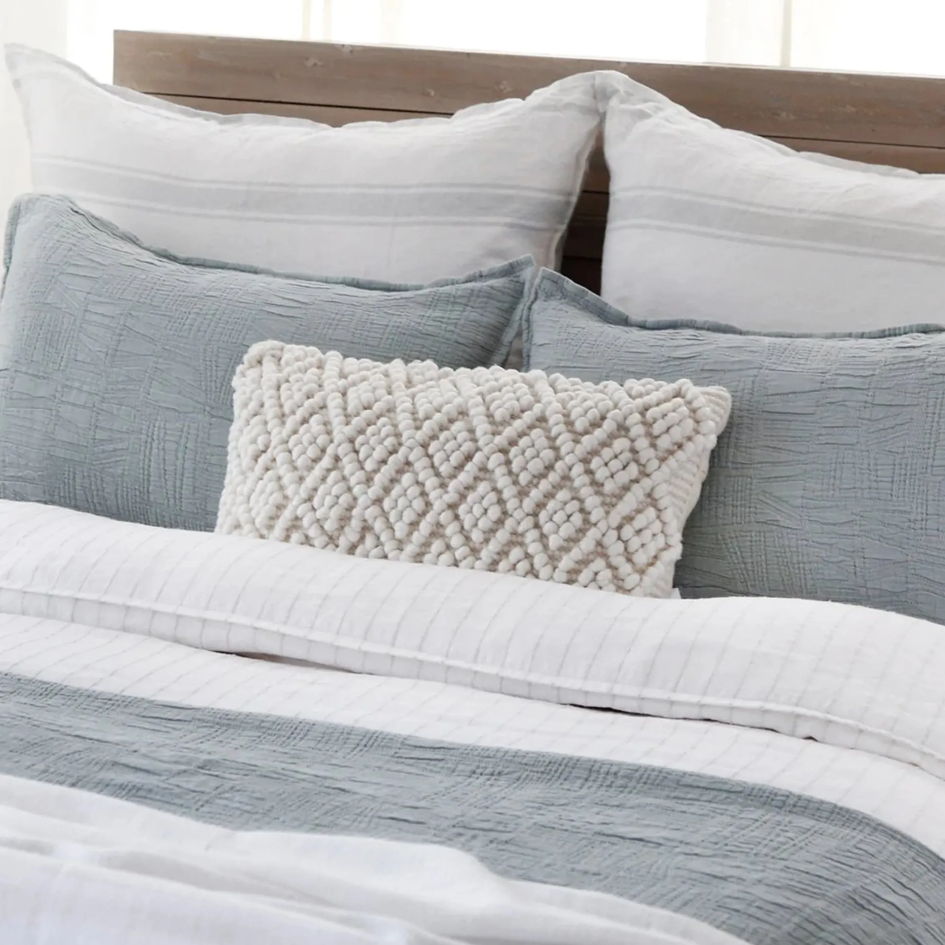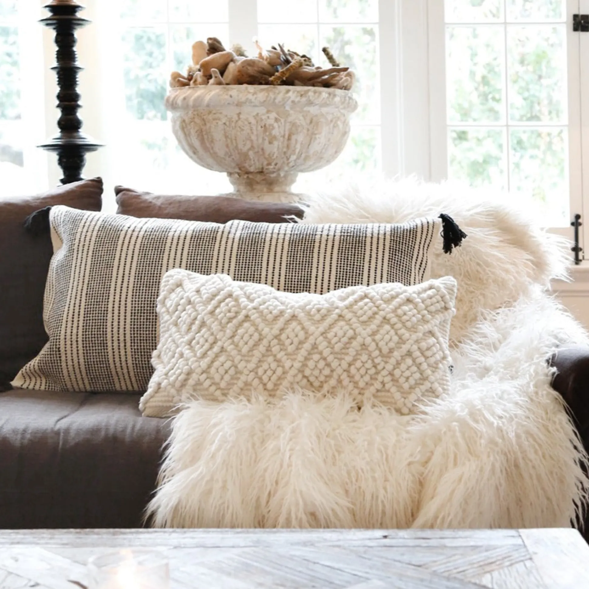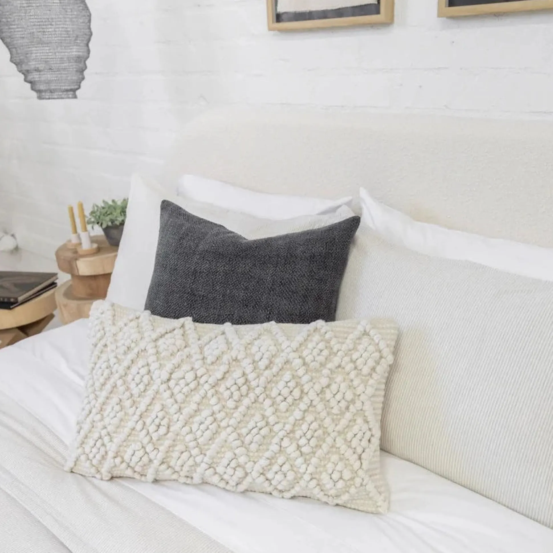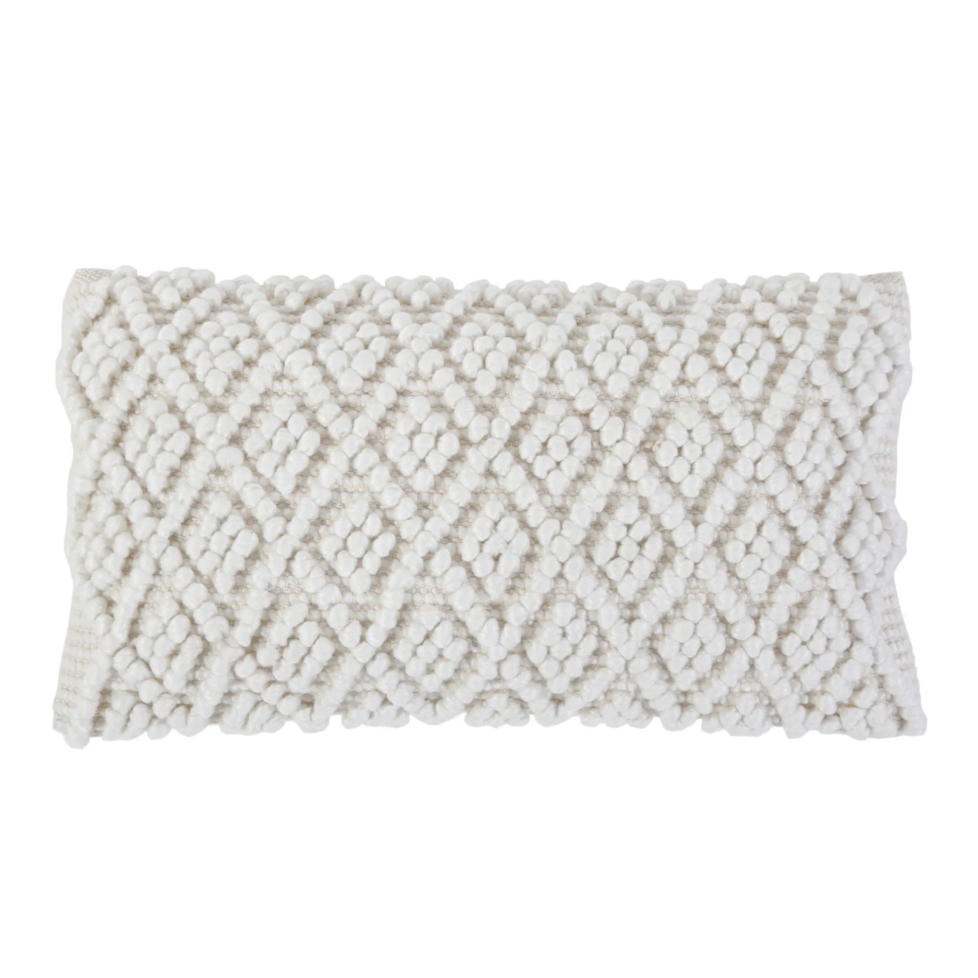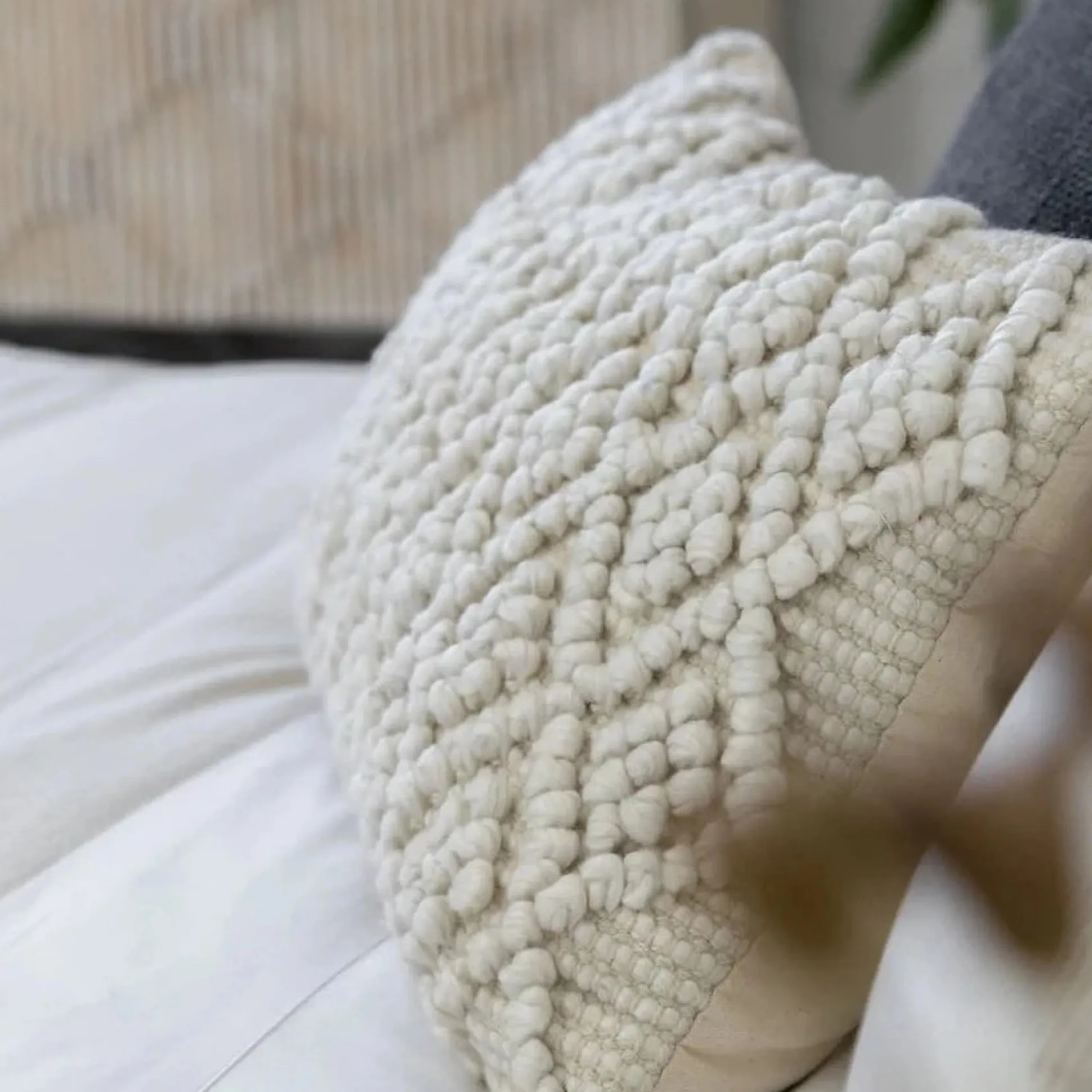 The Coco is a handwoven pillow loomed with soft ivory looped nubs in diamond patterns.
