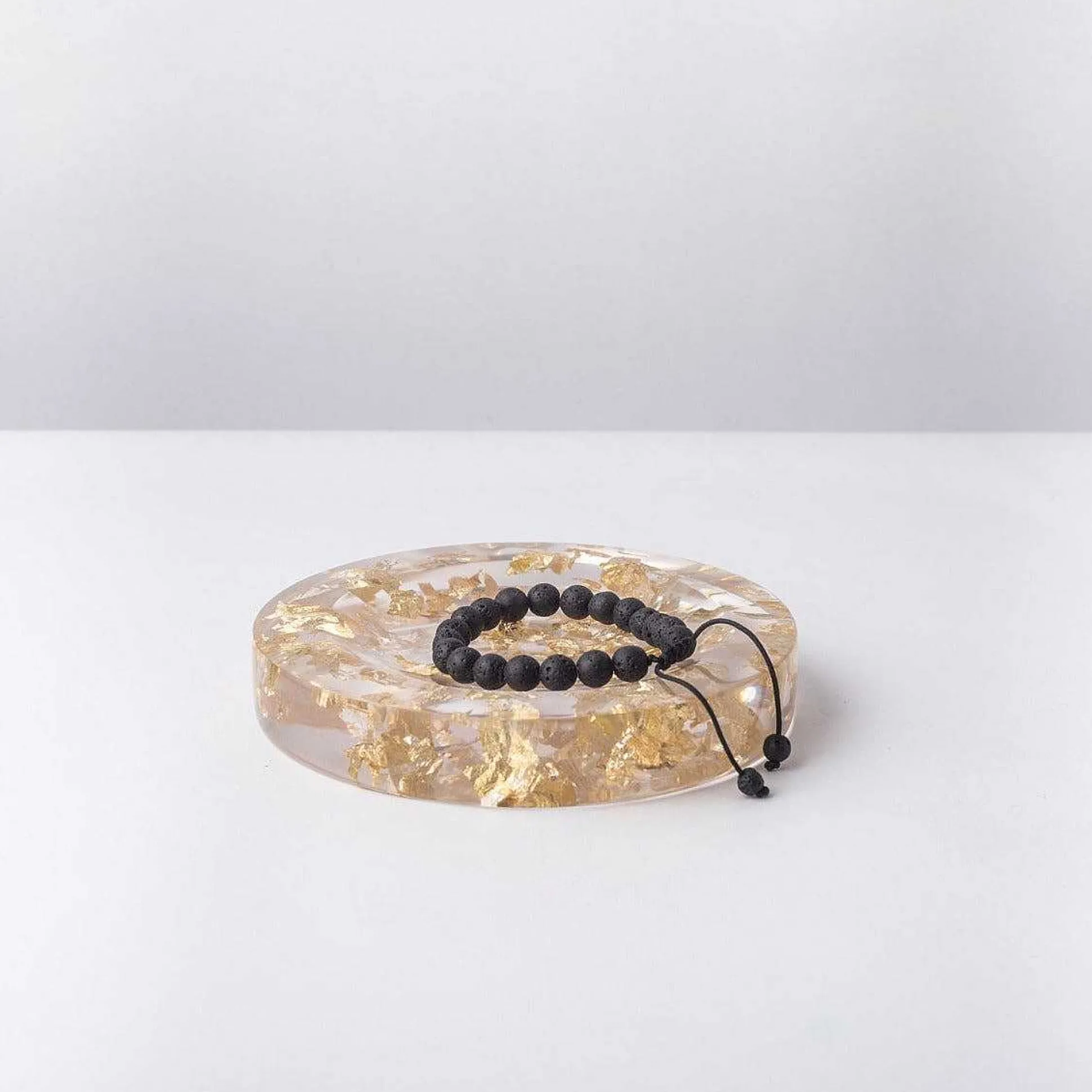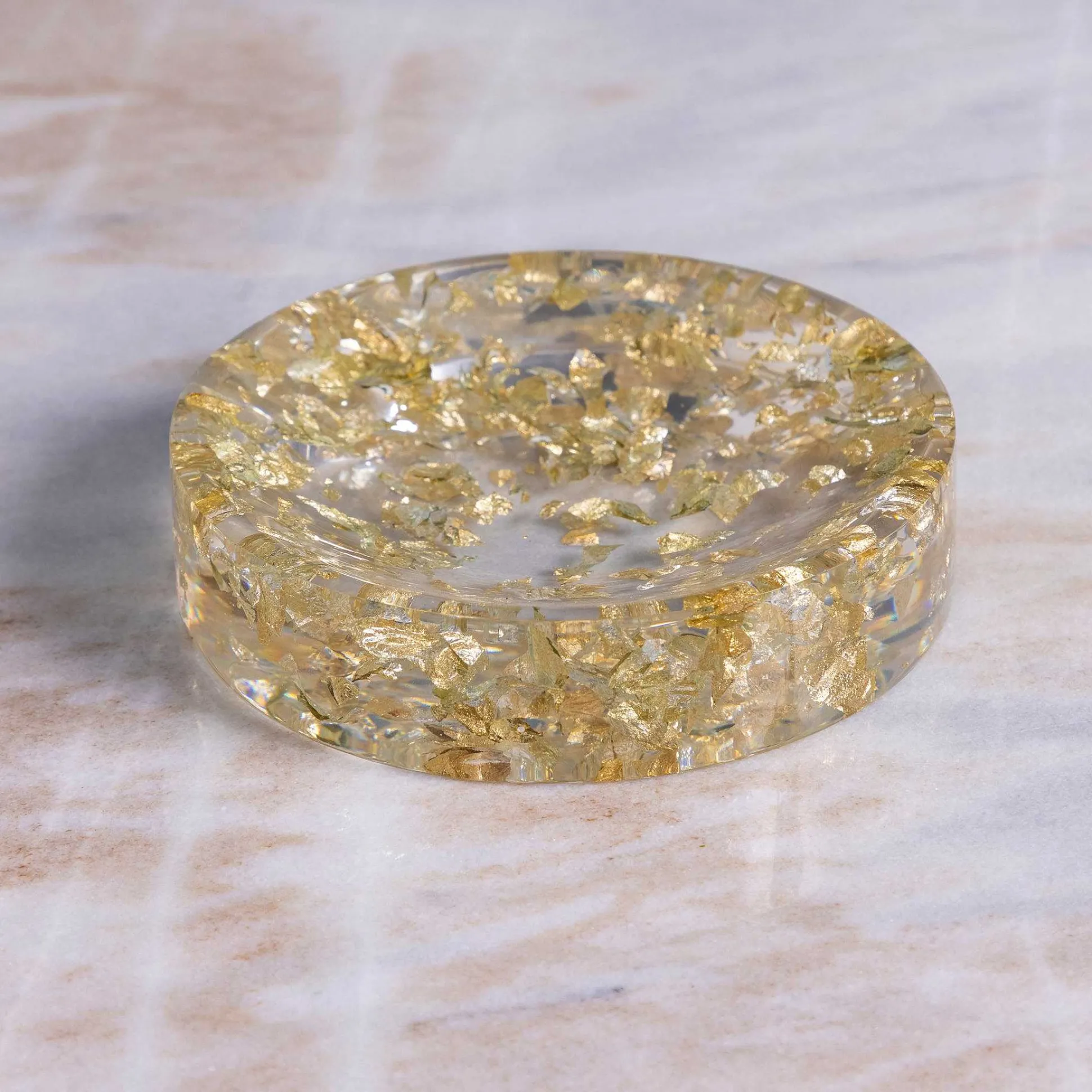 A glamorous catch all made of gold leaf encased in crystal resin. A perfect jewelry dish. Pairs seamlessly with the our Dorado boxes.