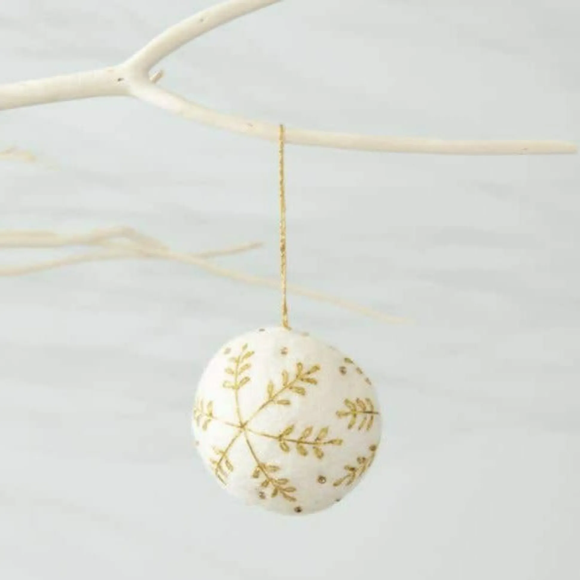 Gleaming gold snowflakes and dainty dotted accents decorate the sumptuous Eria Ornament, bringing a touch of festive grandeur to holiday decorations with Scandi style flair. Resting on a creamy felt base, the scintillating stitchery oozes sophistication and glitters enticingly in the luminous light of Christmas tree lights.