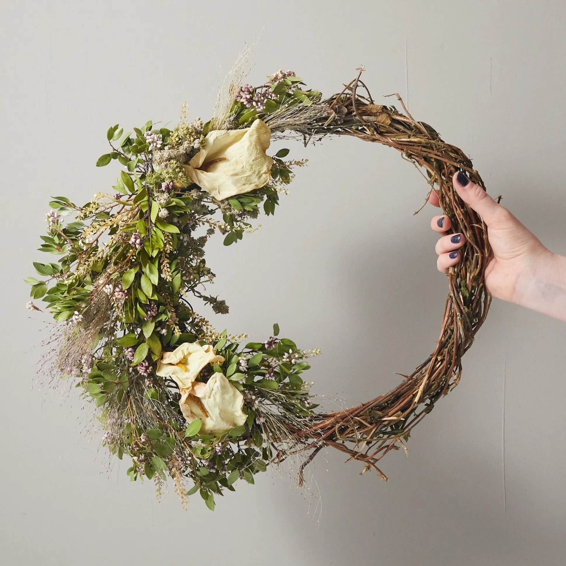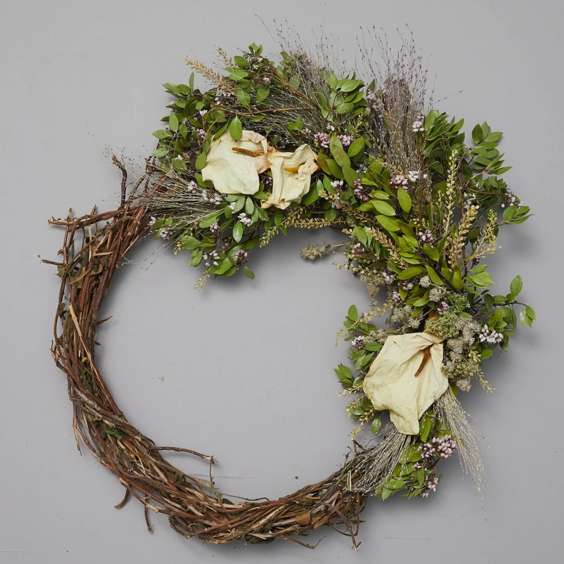 A gathering of dried manzanita, calla lilies and other dried flora are brought together to create this whimsical wreath that can be enjoyed year round. The wreath base is handwoven using dried honeysuckle vines.