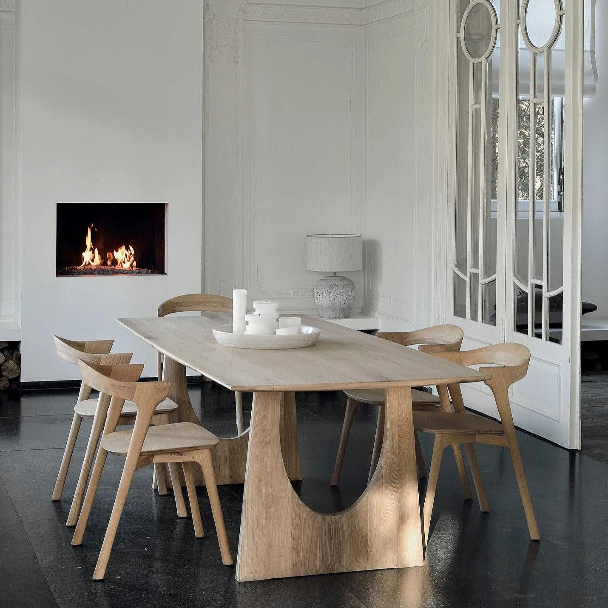 With enriched shapes and unexpected details, the Geometric solid oak dining table is a statement item, equally at home in the dining room or workspace. Luxury comes with its length, which is offset by softened edges and natural lines. Interesting shapes are in play to add volume and practical comfort.