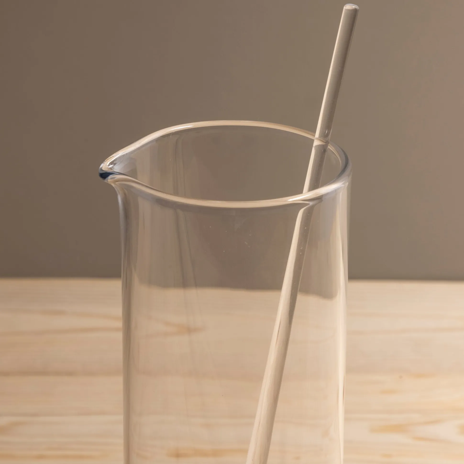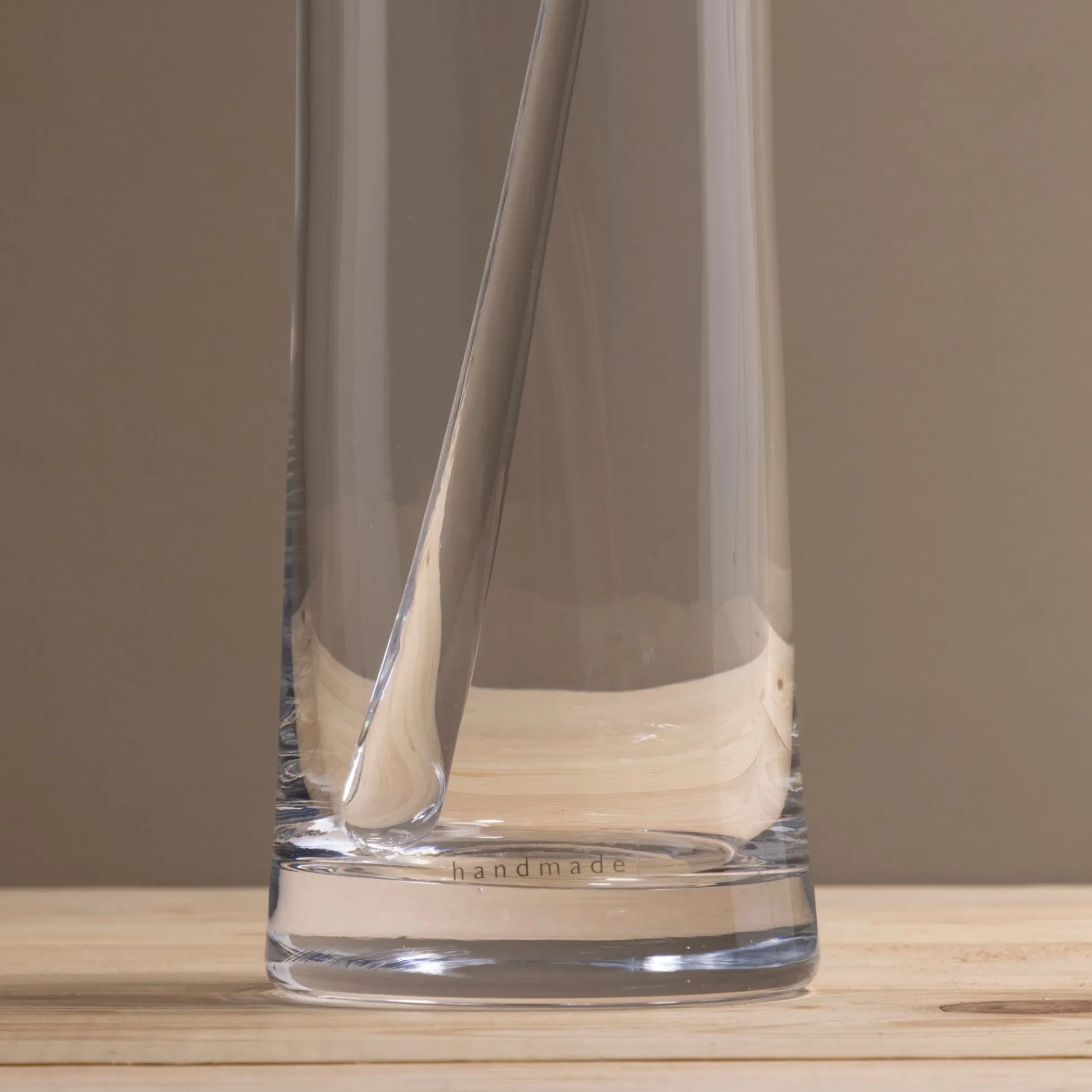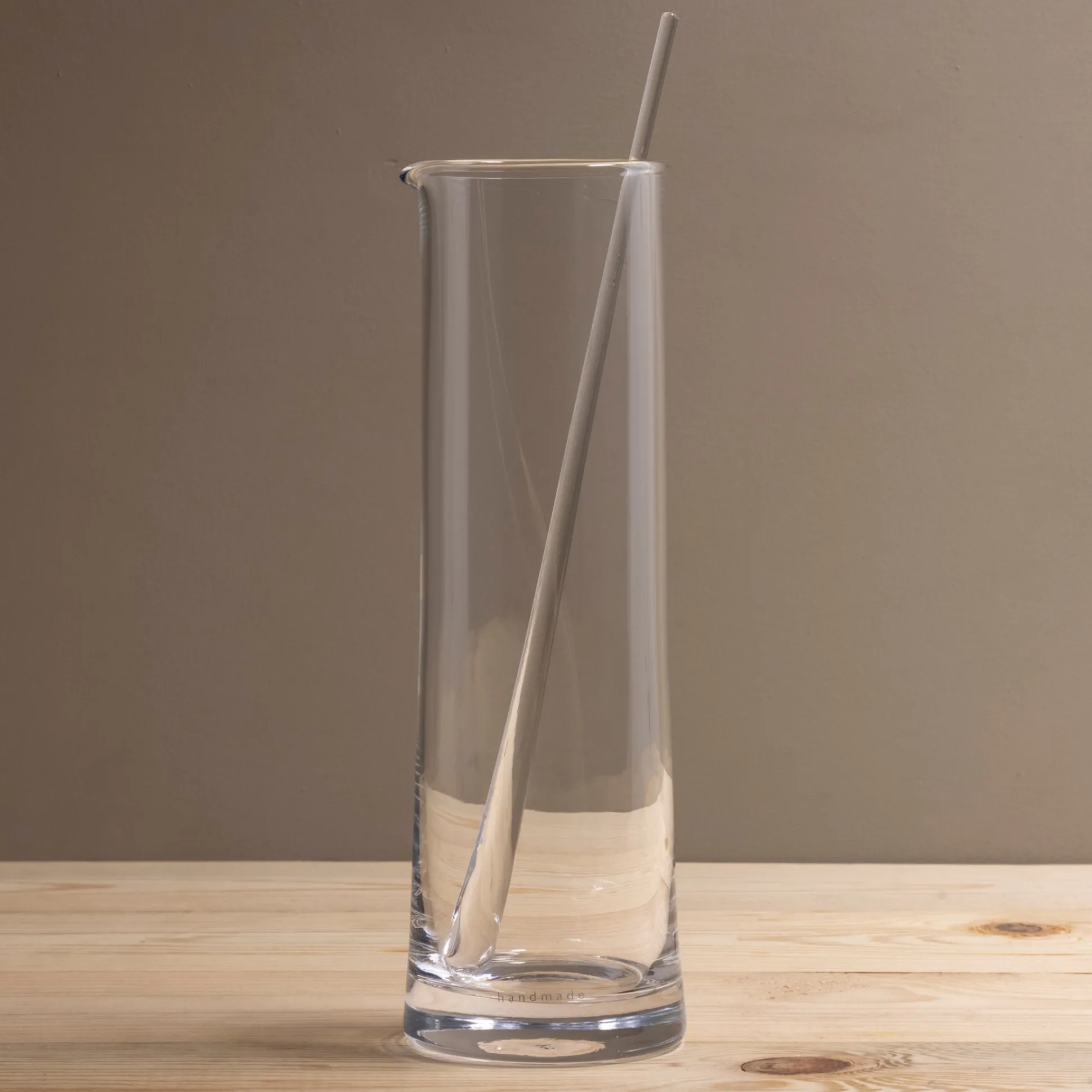 Mouth blown by skilled glassblowers to create a contemporary cocktail jug with a subtly-flared body and weighty base. The rim is scissor cut to achieve a smooth soft finish and the spout is formed by hand using a wooden tool. The accompanying stirrer is freely drawn by hand from molten glass making each one unique and is designed for mixing drinks and ice.