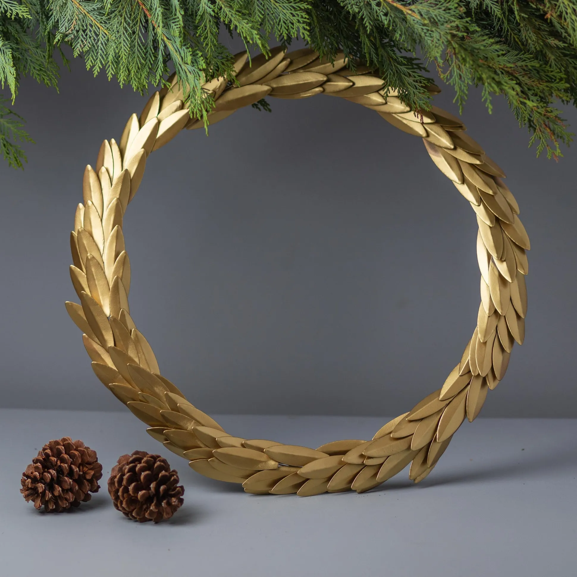 Deck the halls with our glimmering Gold Laurel Wreath. Make memories year after year with this hanging treasure. Each is ethically made in small batches by skilled artisans in India. Pair with your holiday favorites or combine with our gold stencil ornament collection to complete the look!
