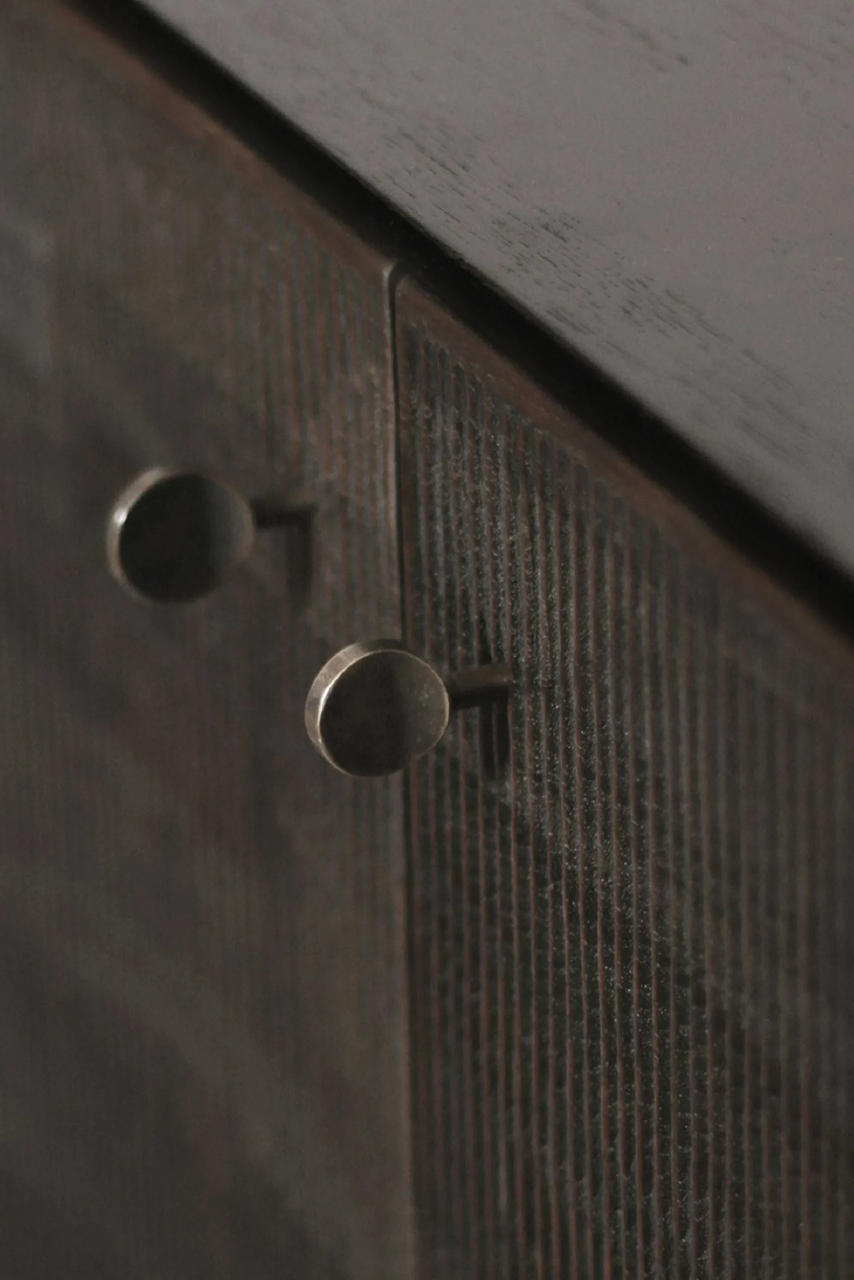The Grooves sideboard is soulful to say the least. Every single line you see is hand carved, making each piece truly unique. Small imperfections are part of the story, even more so: they enhance Grooves’ character. The result is a slightly different surface every time, each with its own rhythm and dynamics. The beautiful dark tinted teak continues on the inside, where shelves and drawers will hold your most cherished objects.