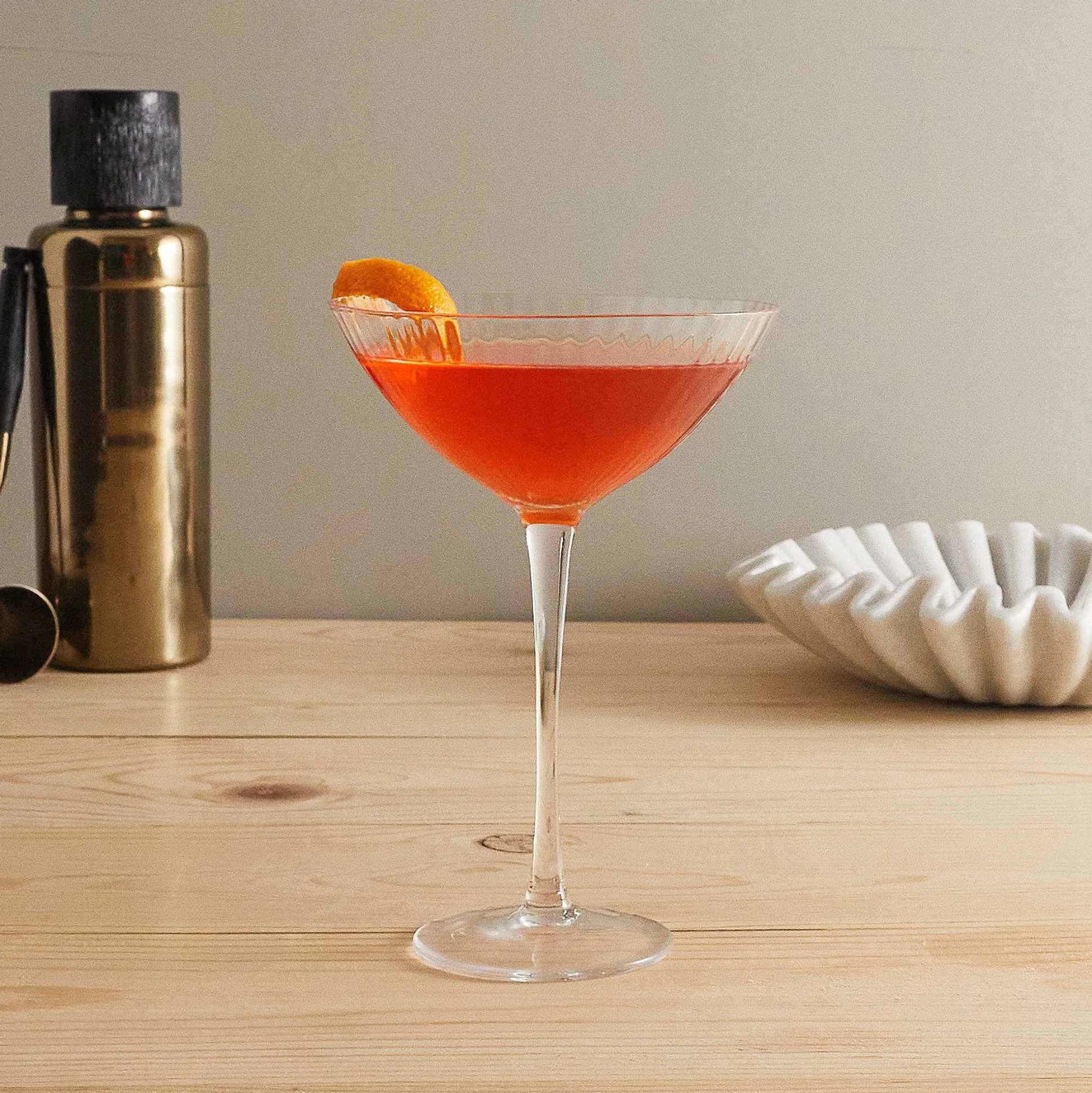 The Hayworth collection is all glamour and is an optical showstopper at the bar! Designed with an Art Deco influence, these chic bar glasses have a luxurious ribbed finish. This chic coupe is a unique way to present an old classic with a new twist.