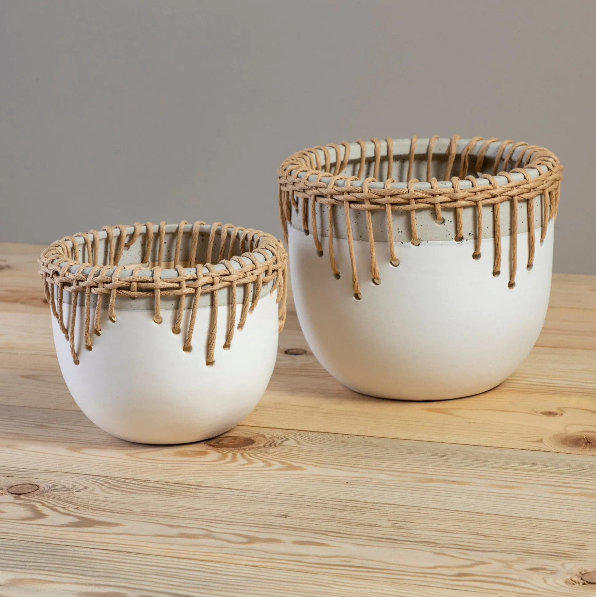 With a two tone neutral base, the Hideaway Pot’s woven rattan detailing around the top and rim feels globally inspired.