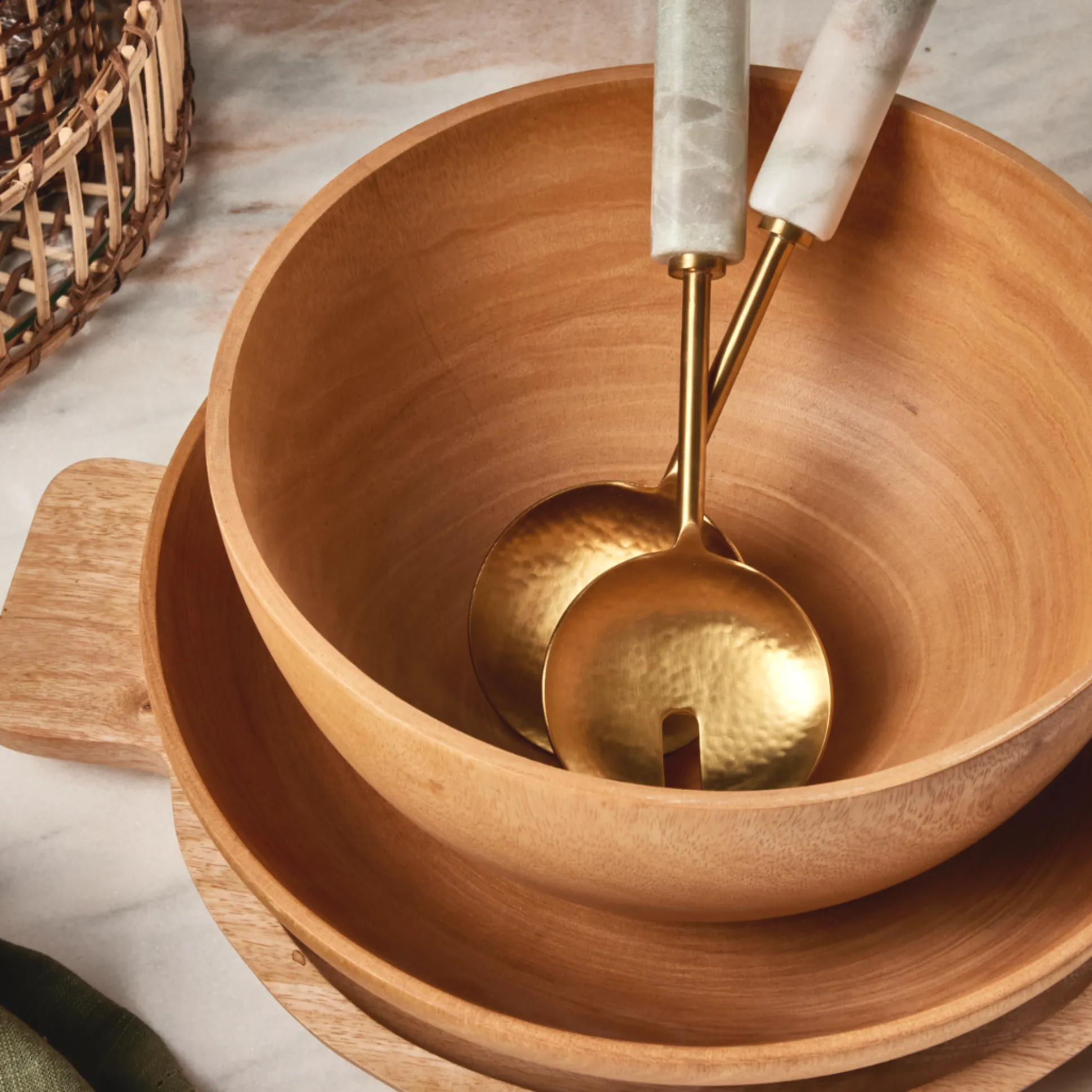 Serve your favorite breadsticks, side salads, and more in sleek style with our Kiln Mango Wood Shallow Bowl. This organic masterpiece is handcrafted from beautifully aged mango wood, naturally infused with its own set of natural striations and subtle highlights.