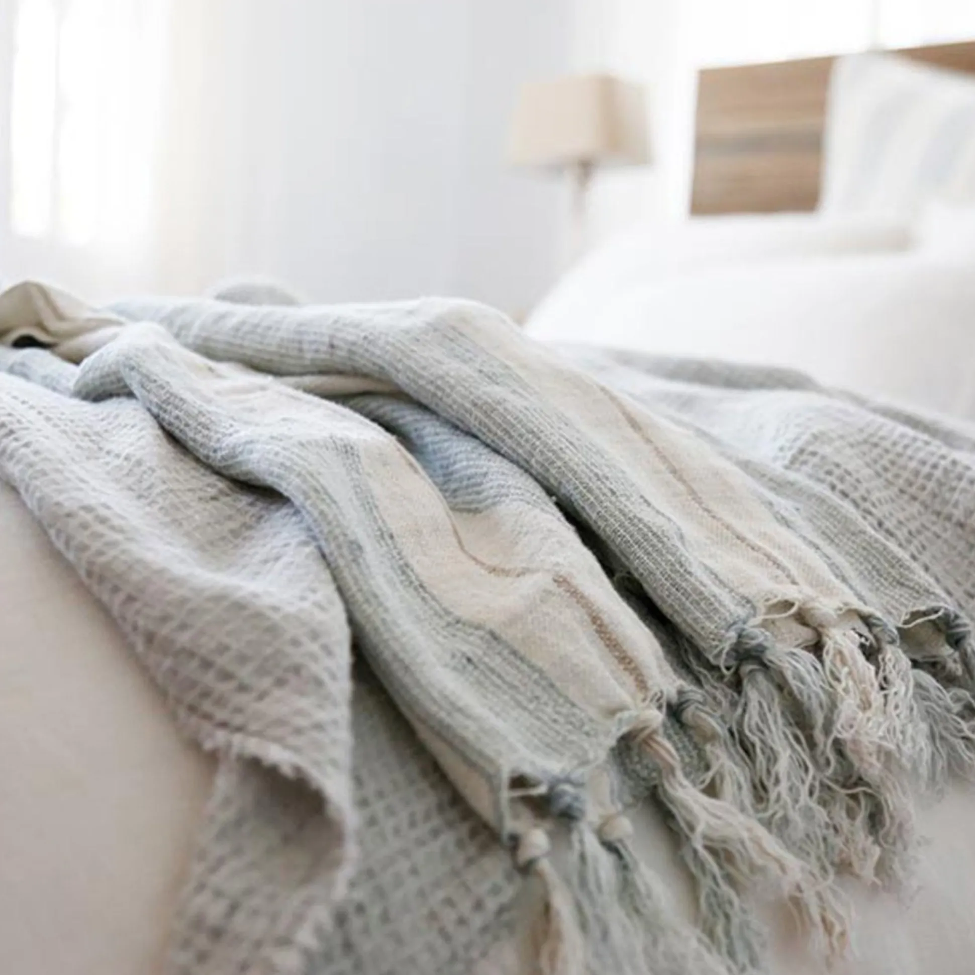 The soft, heavy knit linen Laguna collection is hand-loomed featuring alternating stripes in gentle hues to create a serene coastal feeling.