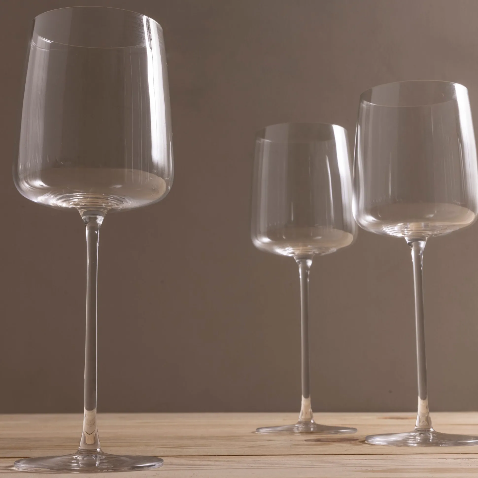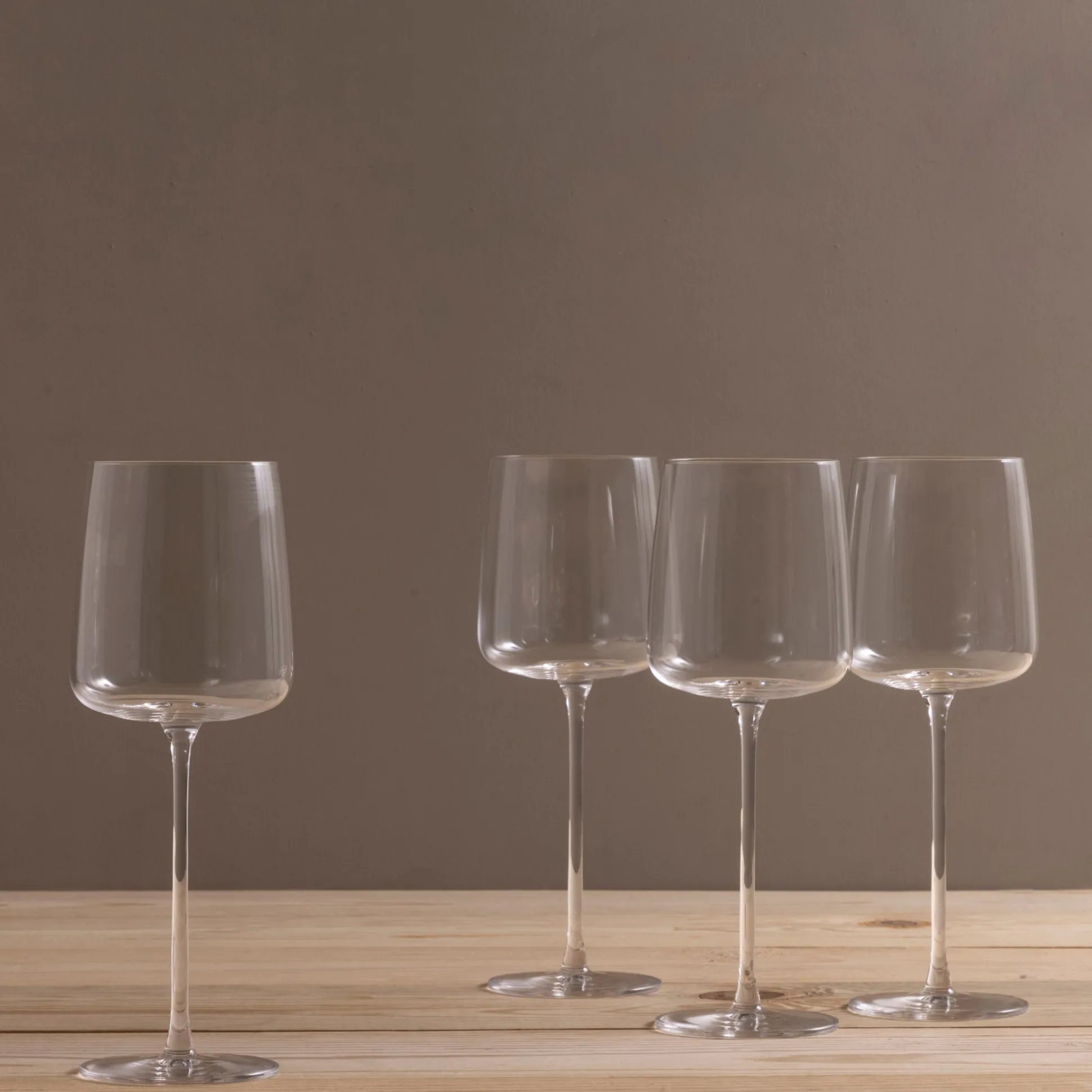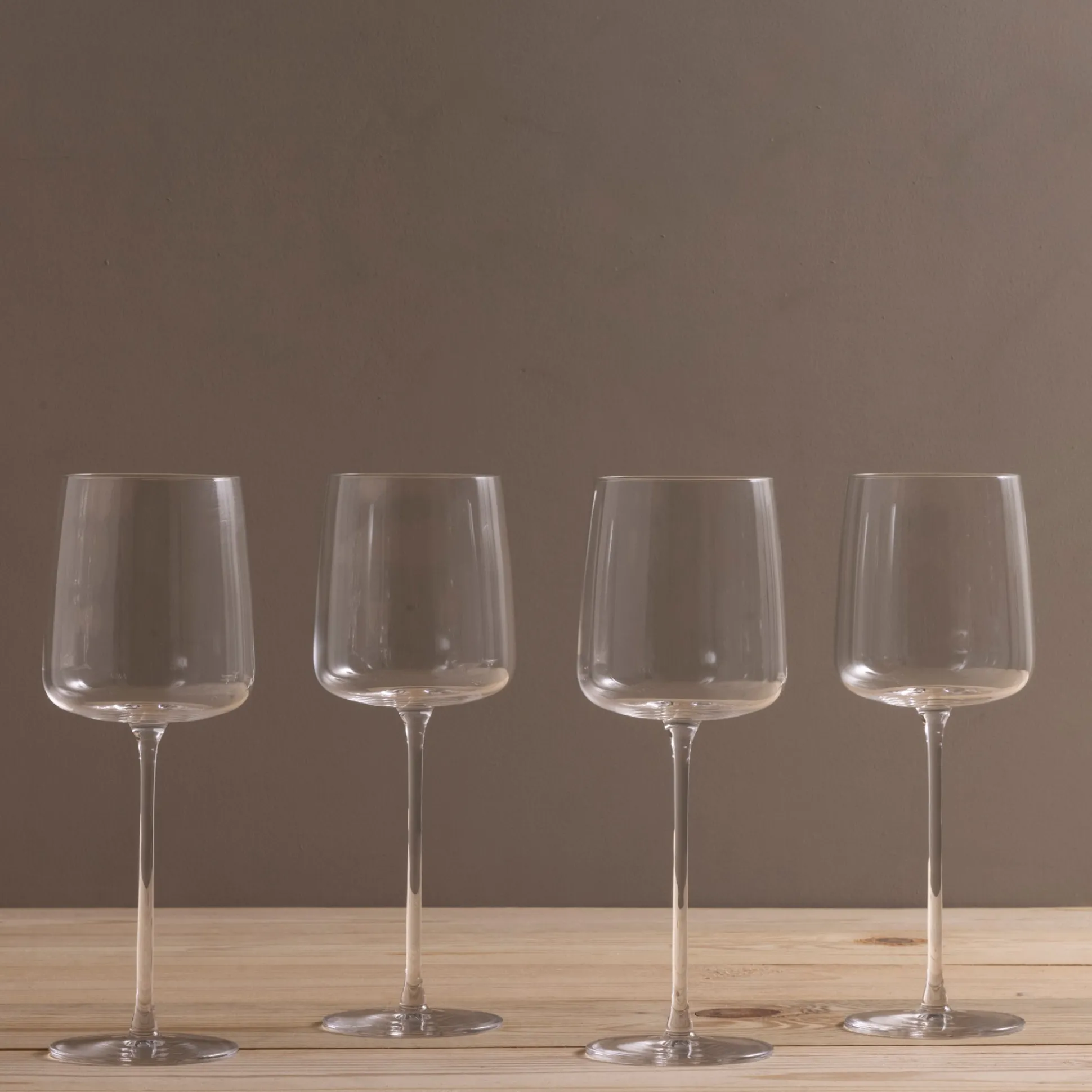 Set of four contemporary wine glasses with tall, elegant stems. The generous angular bowl tapers towards a fine rim. Made from lead-free crystalline glass for clarity and strength.
