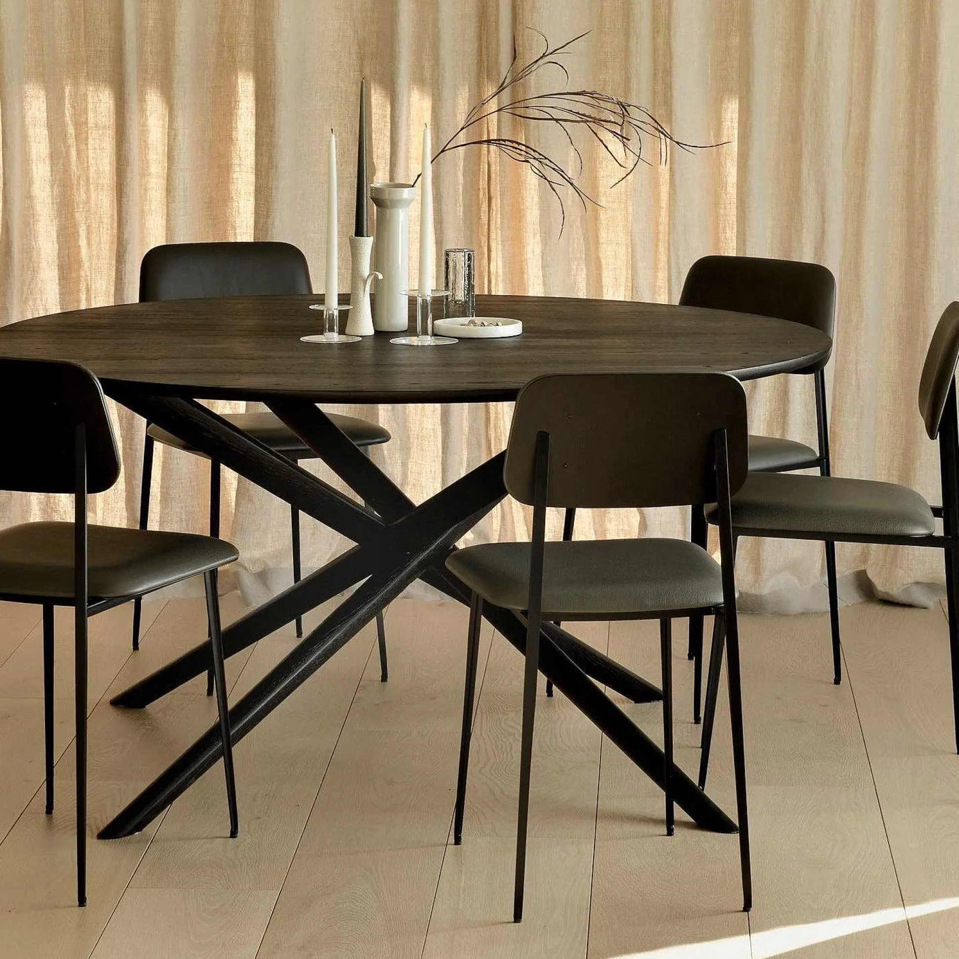 The Mikado dining table has been one of our most recognizable designs for years. For its round version, we kept the same eye-catching construction but aimed for a visually lighter design. In an exercise of balance and stability, the legs are thinner and more refined with round edges to fit the solid oak dining table’s new shape.