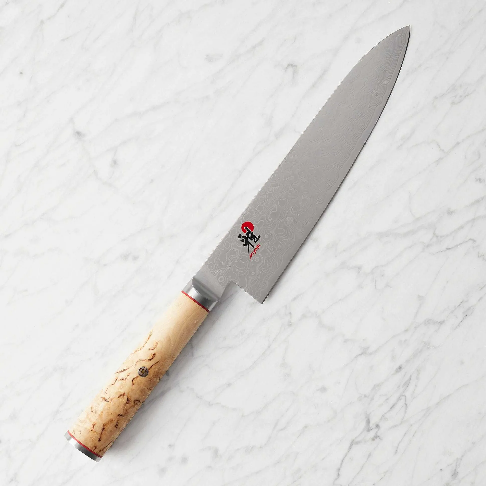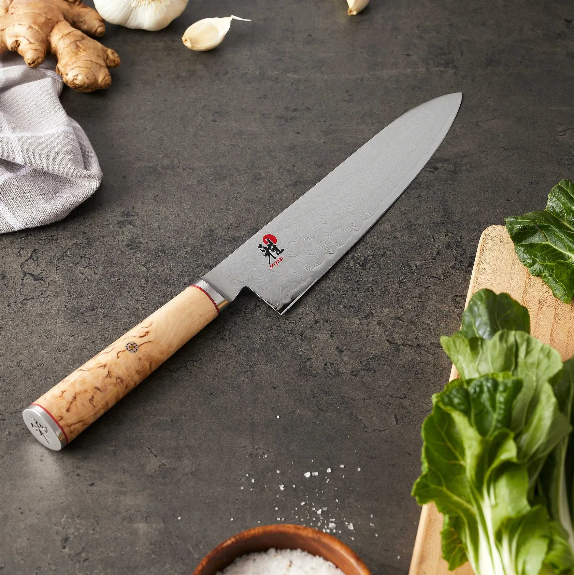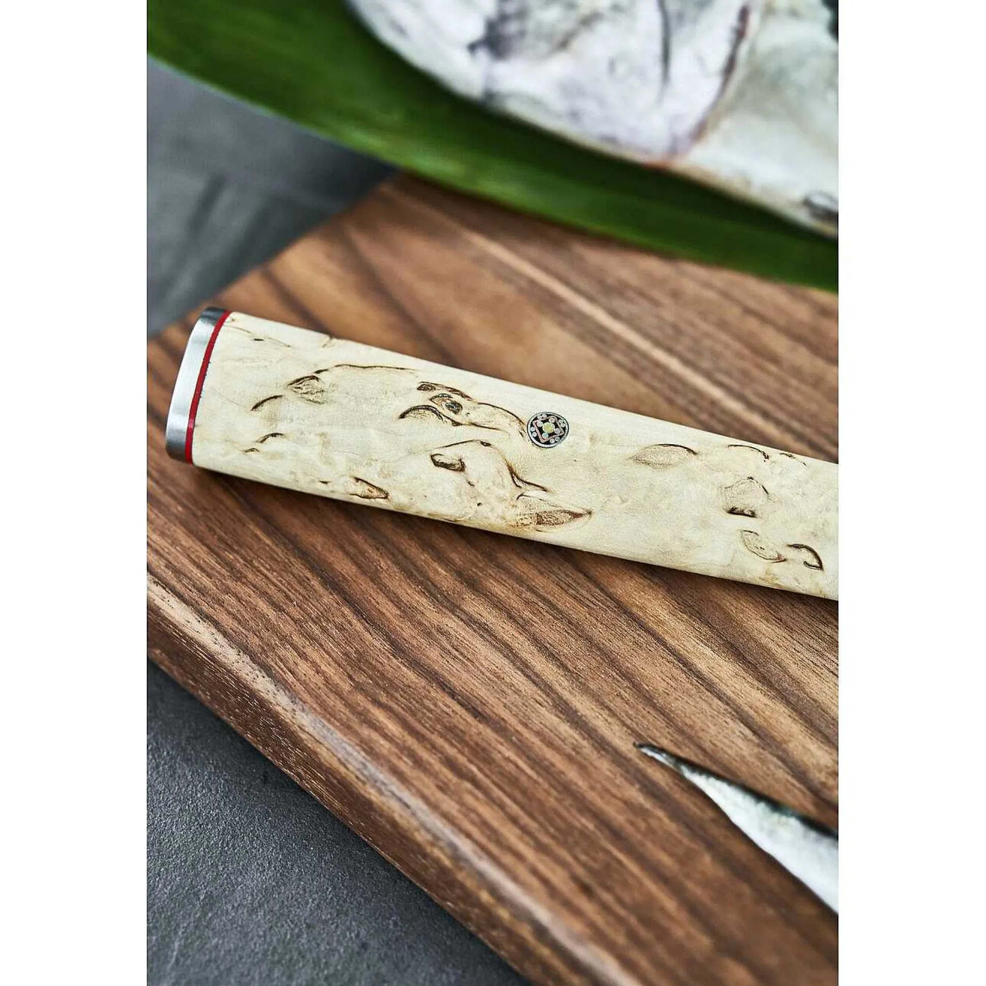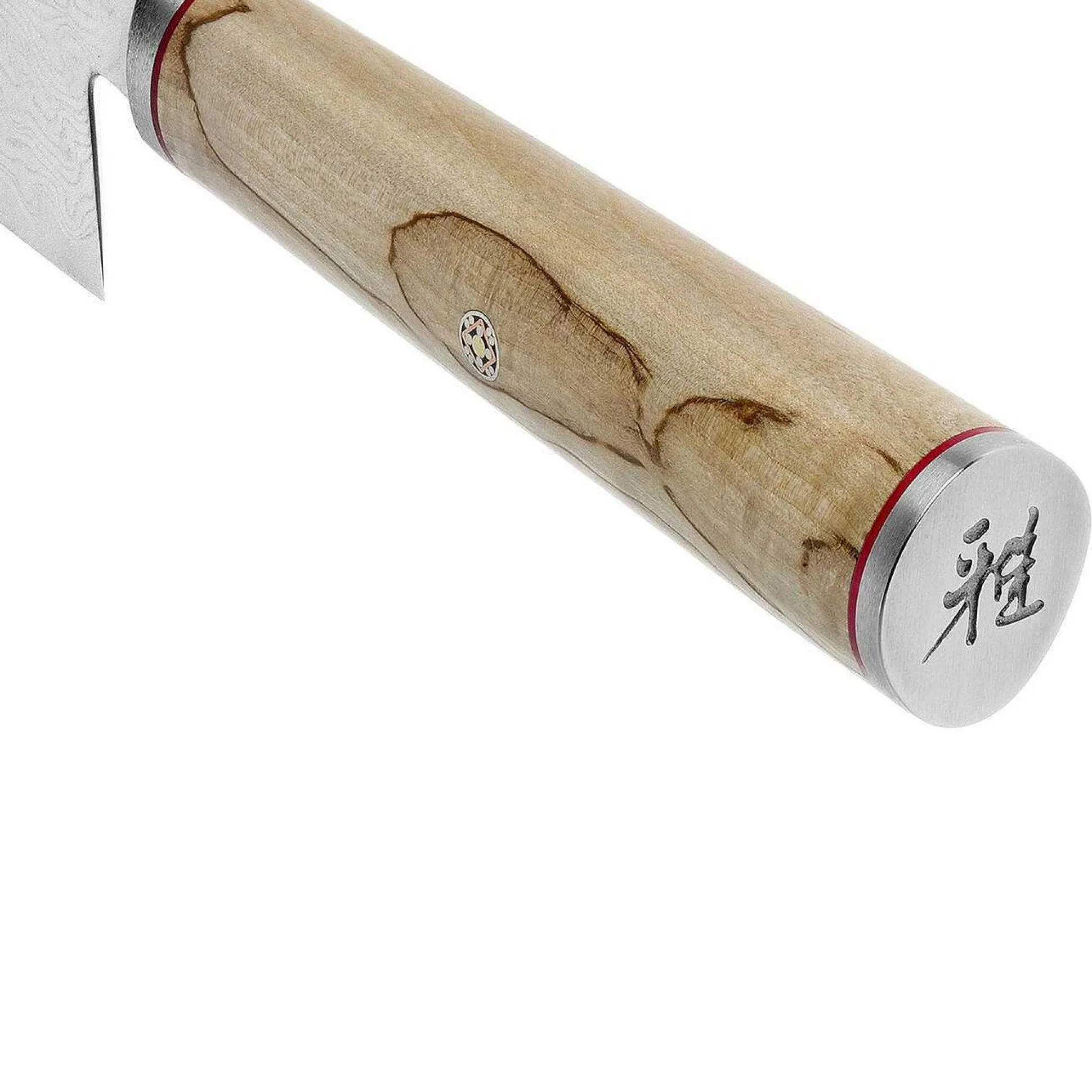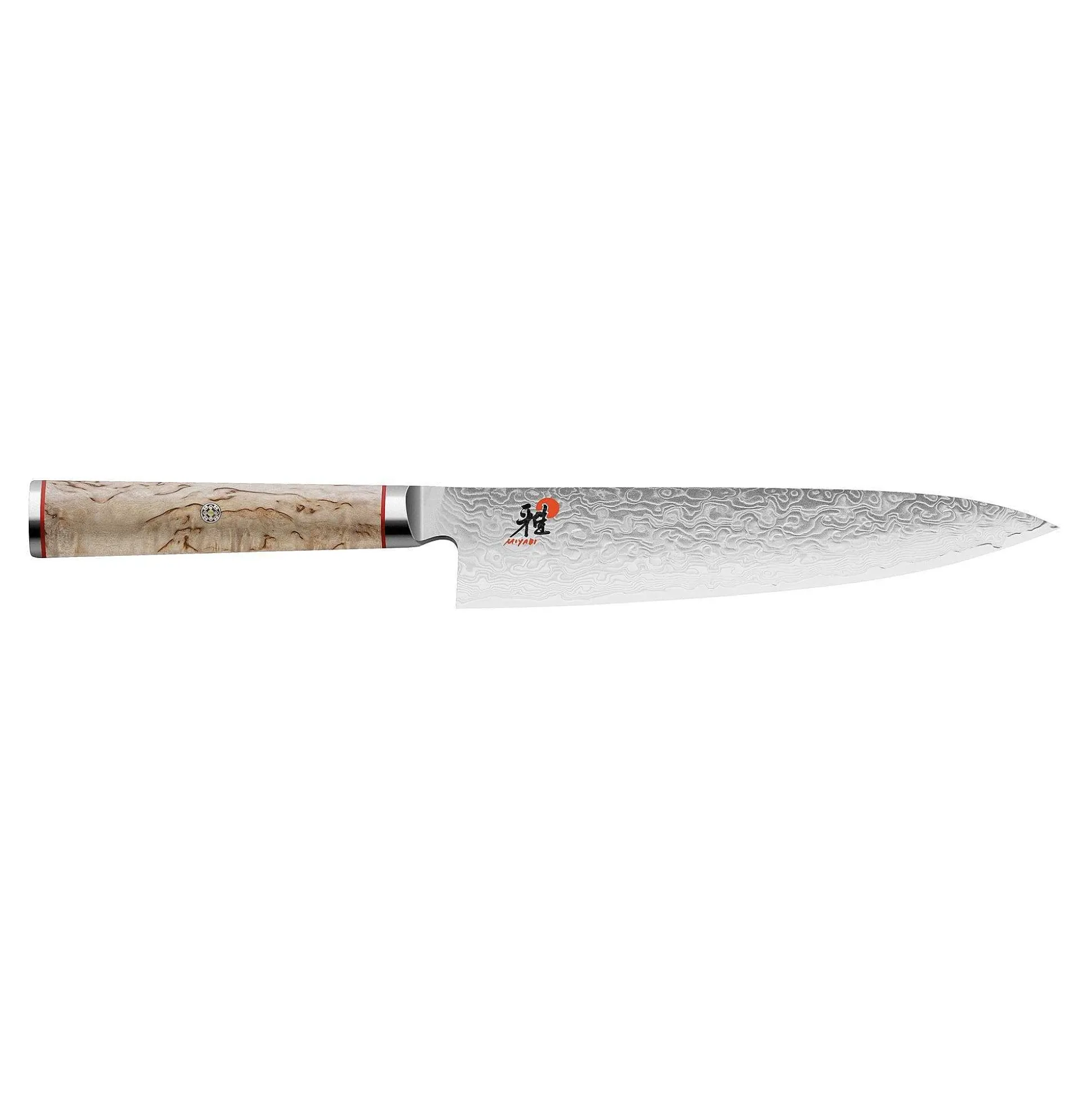 Top-of-the-line MIYABI Birchwood is a work of culinary art. Both blade and handle are crafted from the most precious materials, which shape their striking appearance.More than meets the eye, the potent core of SG2 micro-carbide powder steel is protected by 100 layers of steel. MIYABI’s innovative, ice-hardening process locks in the long-lasting sharpness of the CRYODUR blades. Beneath its beautiful exterior, the flower Damascus pattern provides added durability.The scalpel-like blade is complemented by an equally striking Karelian (Masur) Birch handle. A prized material for knife handles, Karelian Birch is also the only wood ever used in a Faberge egg. Exquisite and ergonomic, MIYABI Birchwood knives feel as good as they look.Handcrafted in Seki, Japan