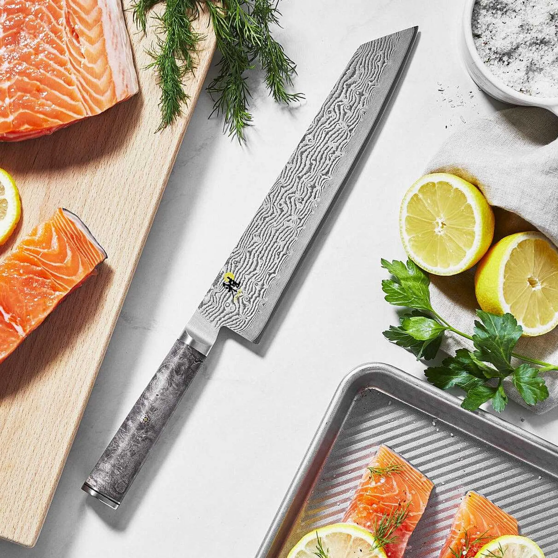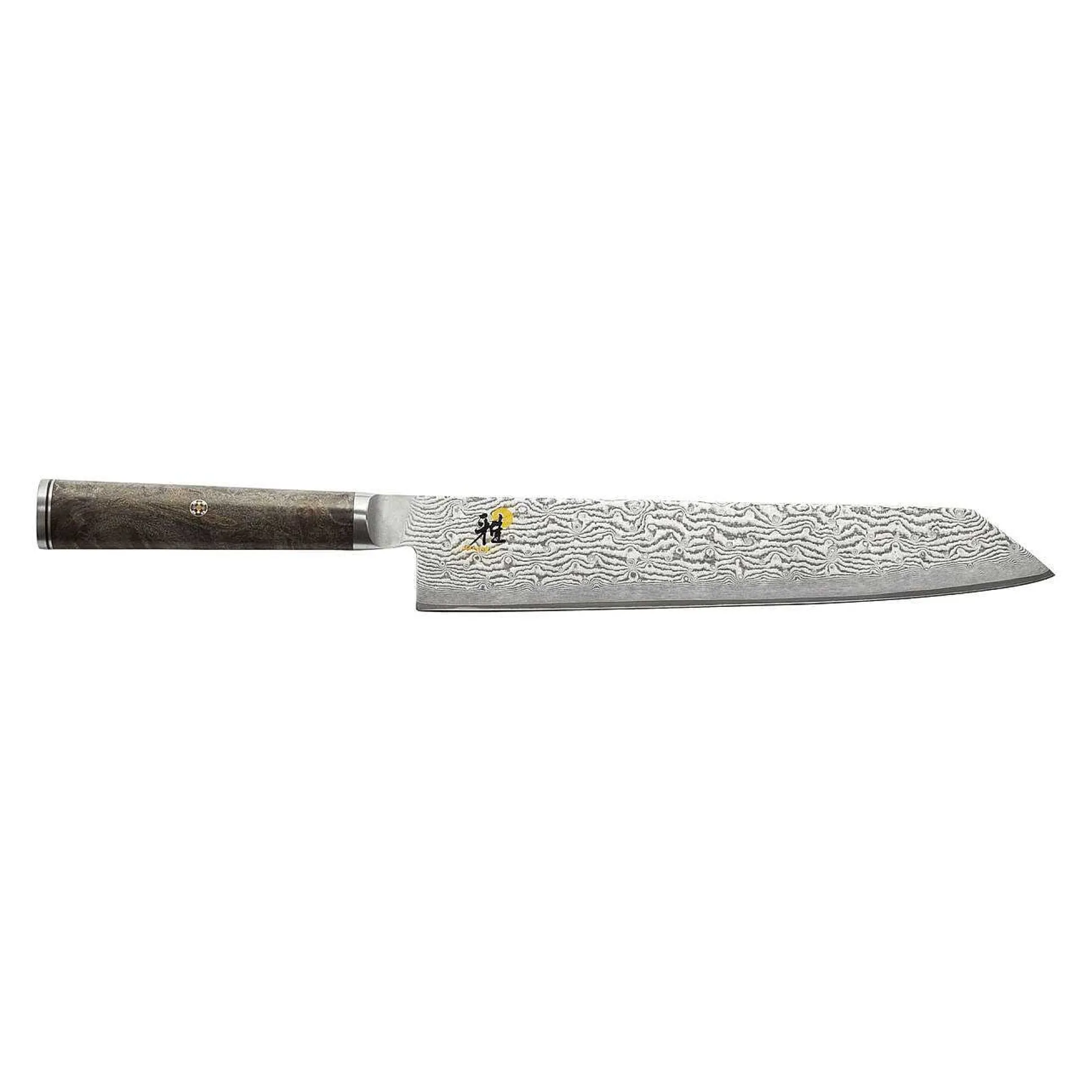 The Miyabi Black 5000MCD is a true work of art. The blade is constructed of micro-carbide powdered MC66 steel, which is ice-hardened to an impressive 66 HRC. This results in an exceptionally sharp and lasting edge. The blade is wrapped in 132 additional layers of steel, resulting in a beautiful flower damascus pattern. The handle of the Miyabi Black series is made from unique wood, black maple. The grain and color of the black maple contrasts with the damascus of the blade. The handle is crafted in a traditional “D” shape, providing optimal ergonomics for fatigue-free cutting in the kitchen. Handcrafted in Seki, Japan.