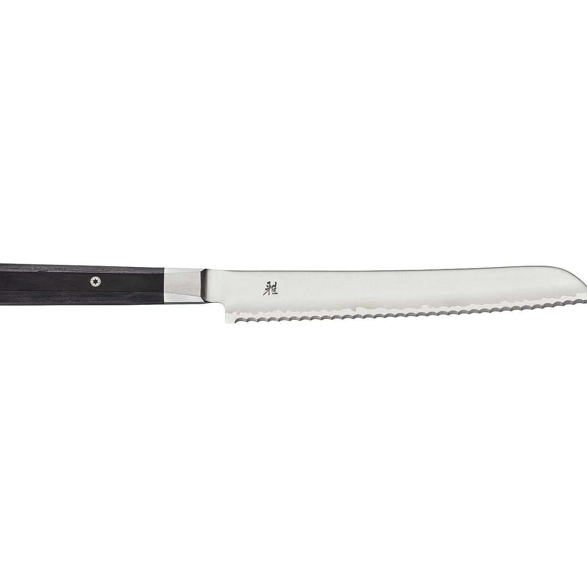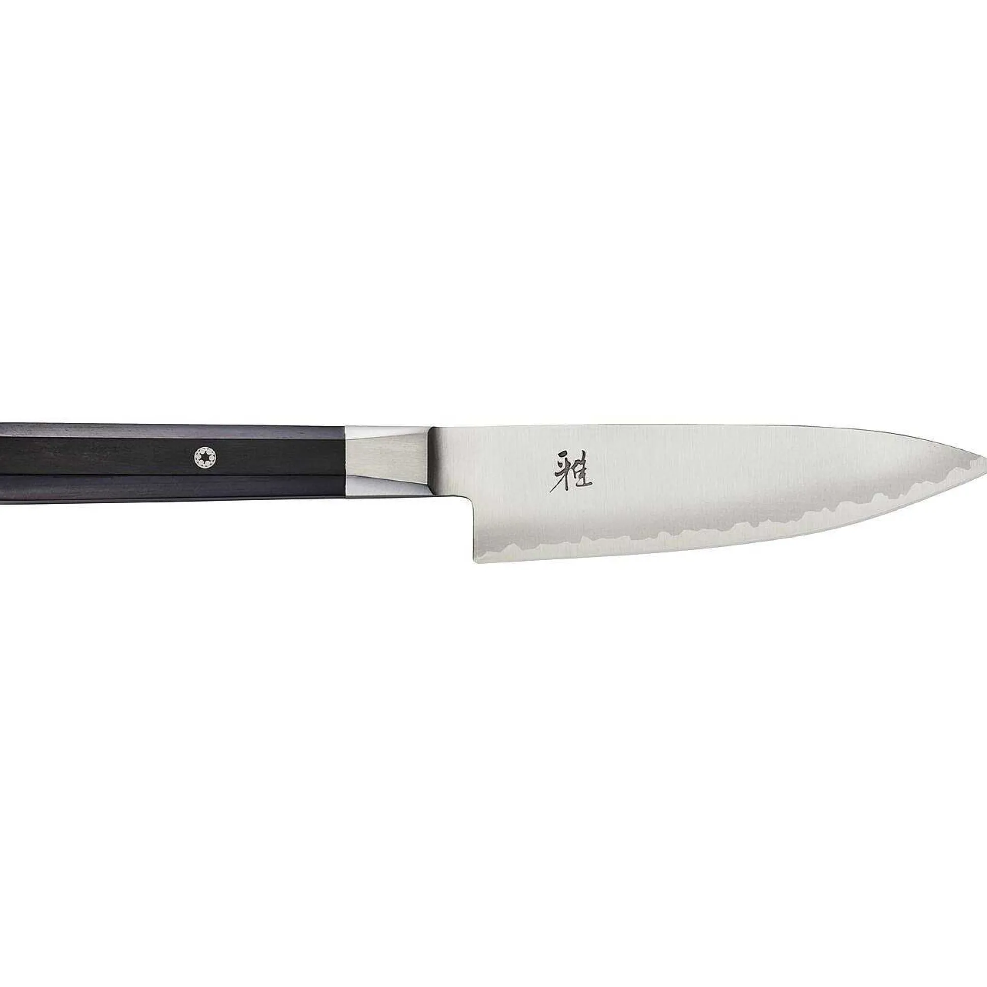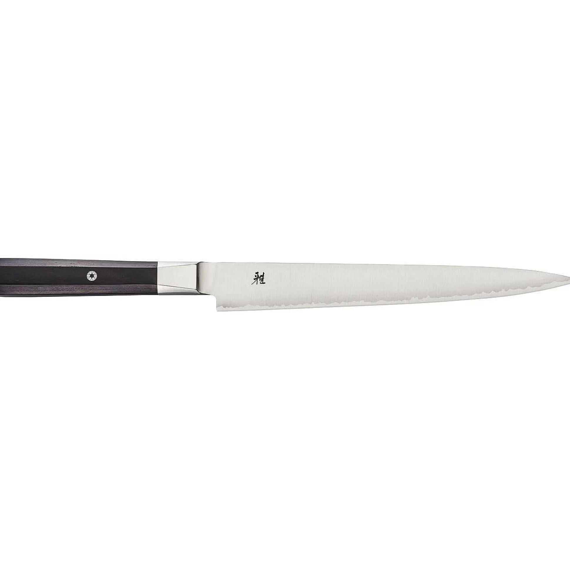 - Mirror-polished blade features Japanese design details: sandblasted katana edge and embossed MIYABI logo