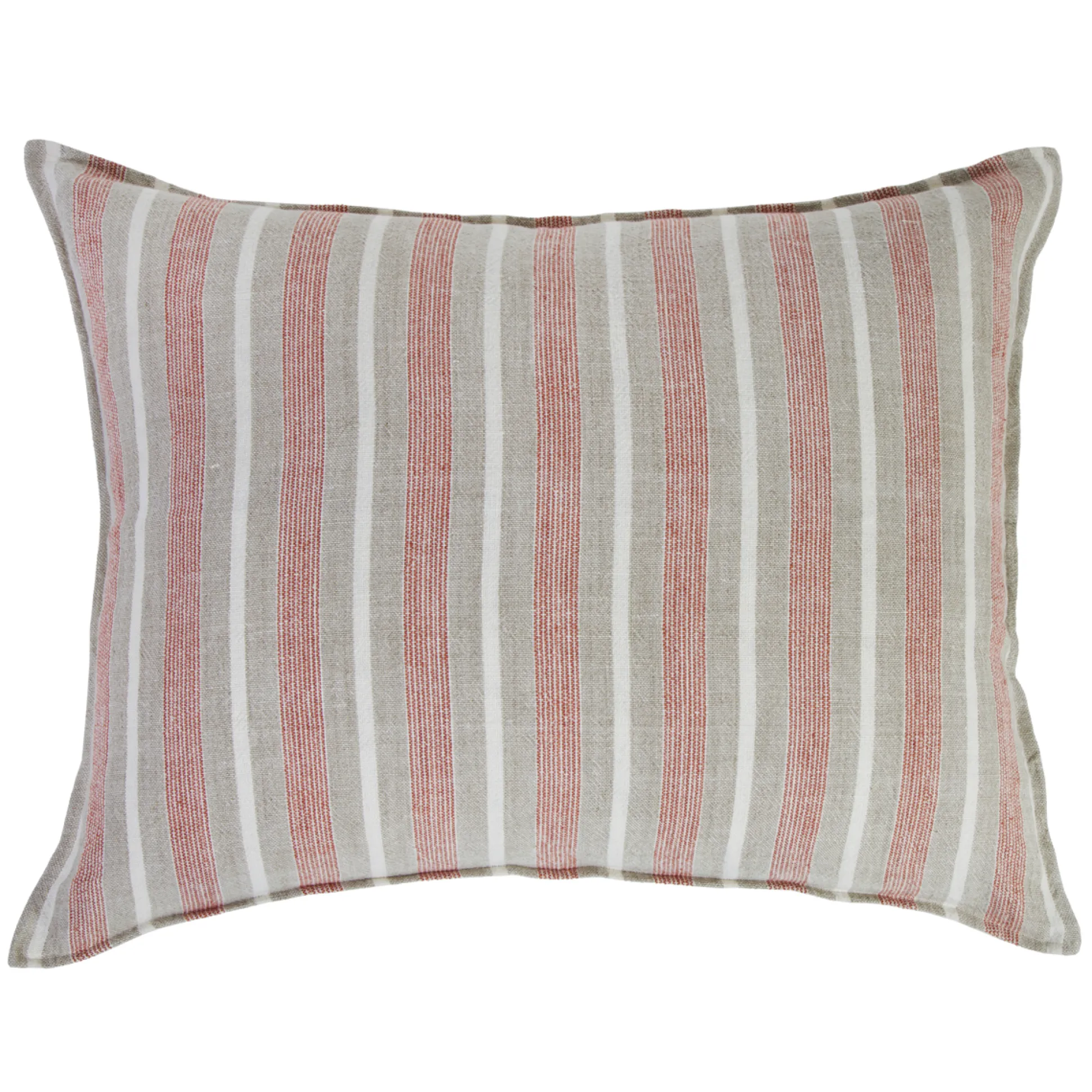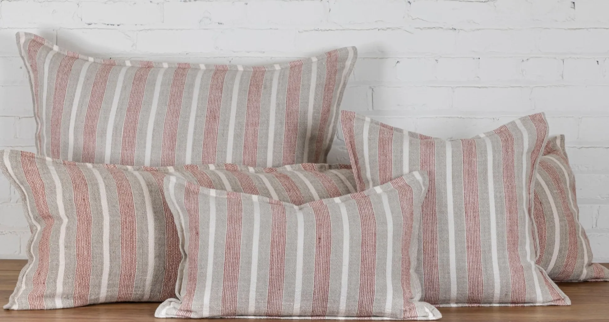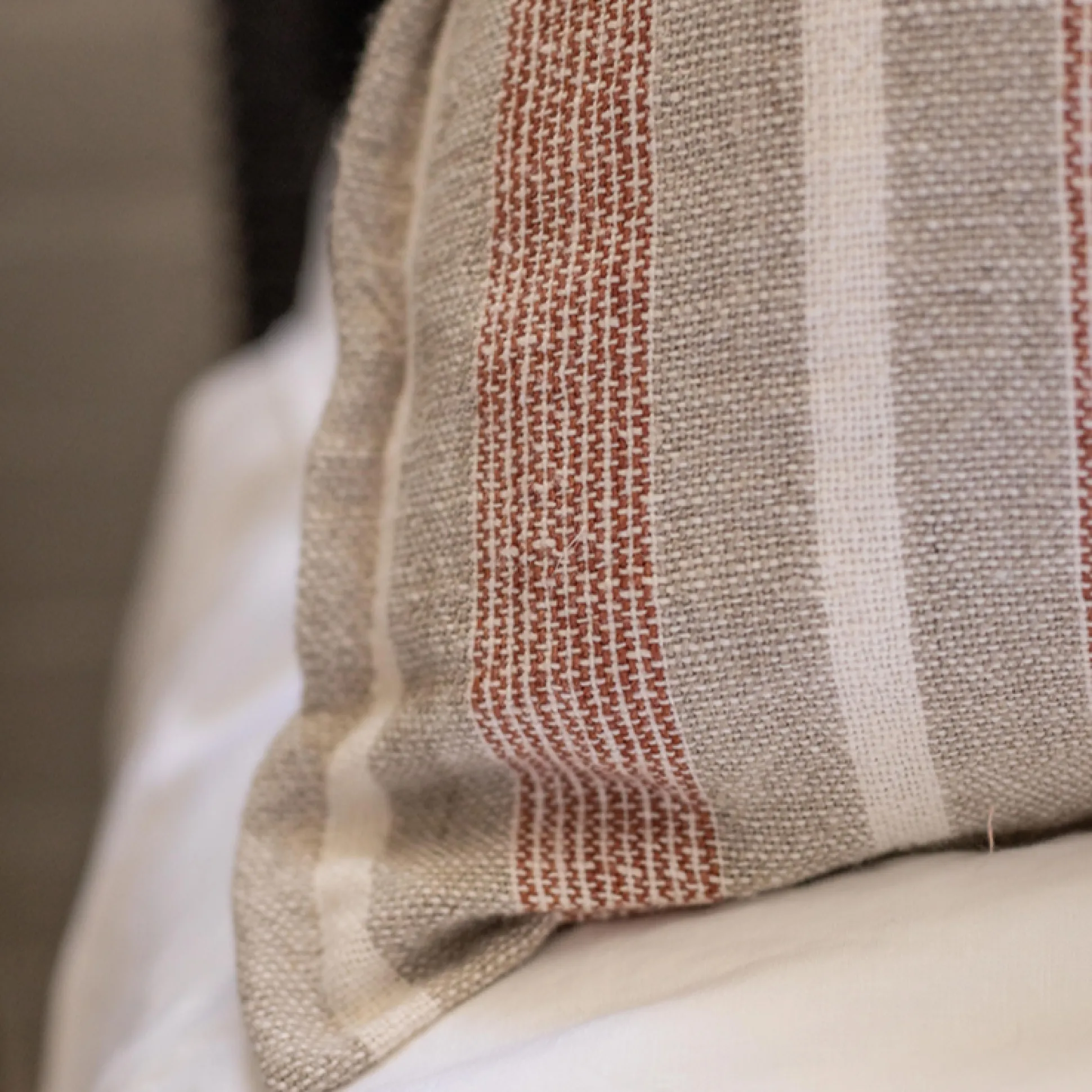The Montecito collection is a 100% heavy weight hand loomed linen that features alternating thick and thin stripes in a warm color palette of terra cotta and natural surrounded by a 1/2” finished flange.