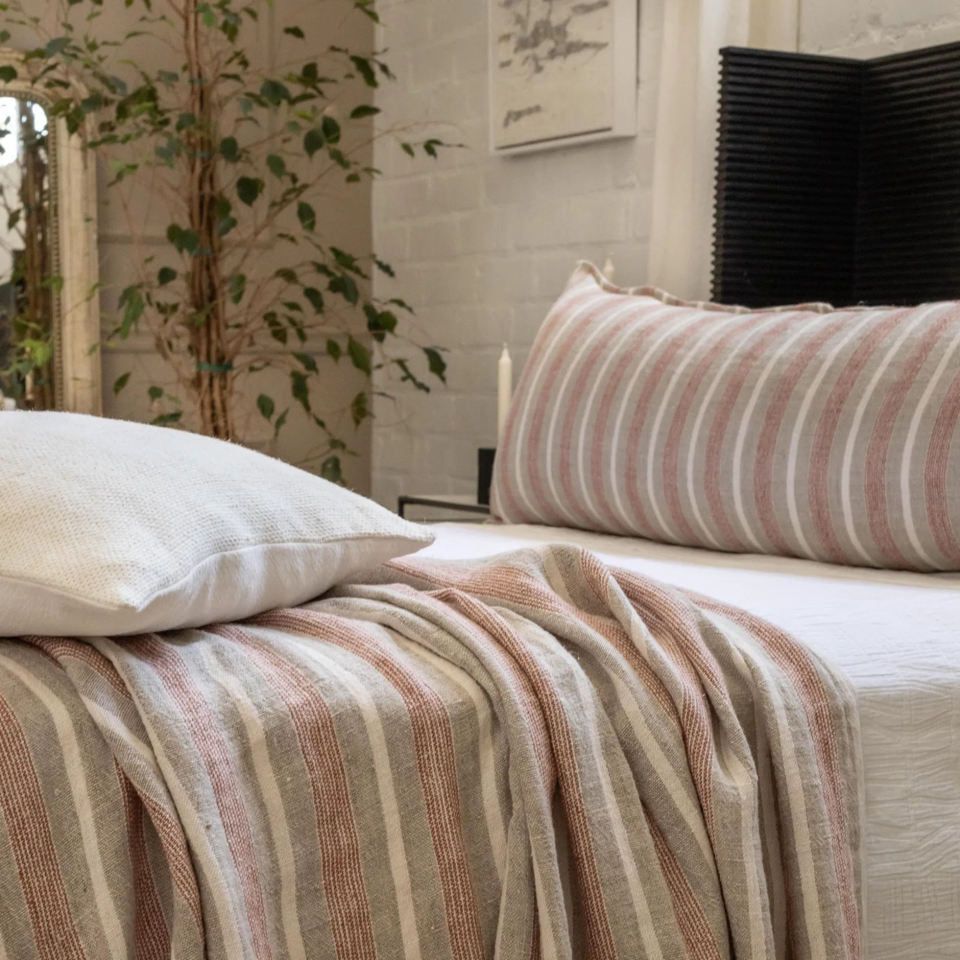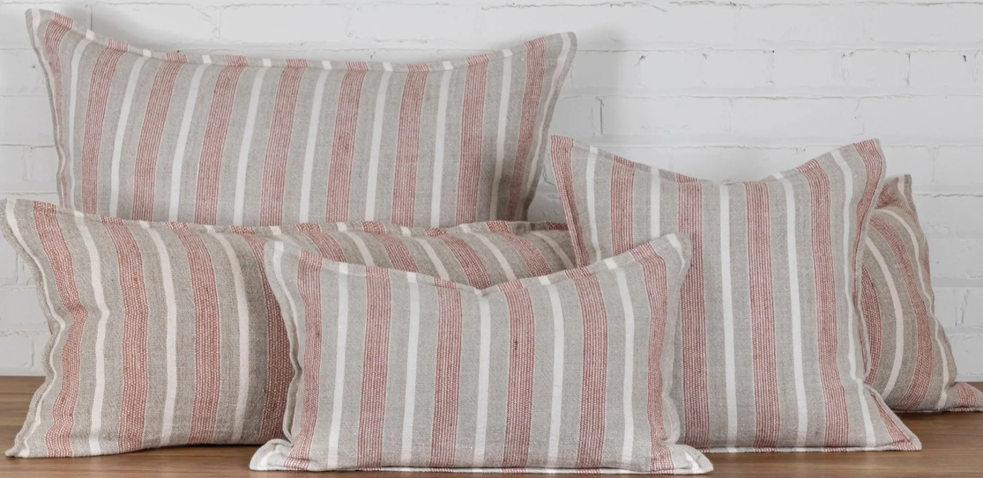 The Montecito collection is a 100% heavy weight hand loomed linen that features alternating thick and thin stripes in a warm color palette of terra cotta and natural surrounded by a 1/2” finished flange.