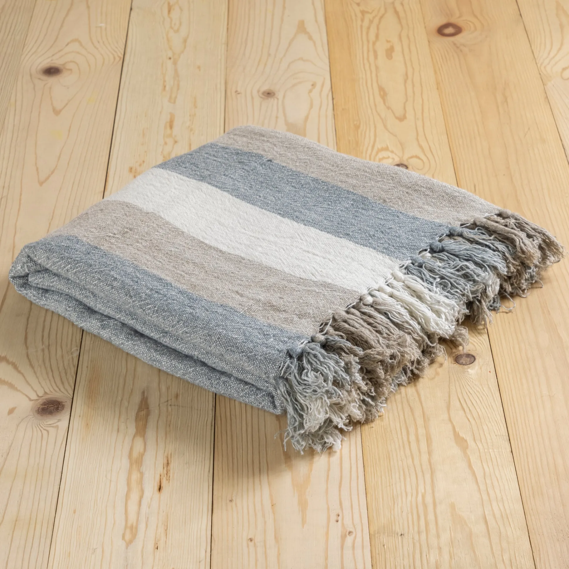 The Monterey collection is a 100% hand-loomed, heavy weight linen that features broad coastal inspired stripes surrounded by soft tassels.