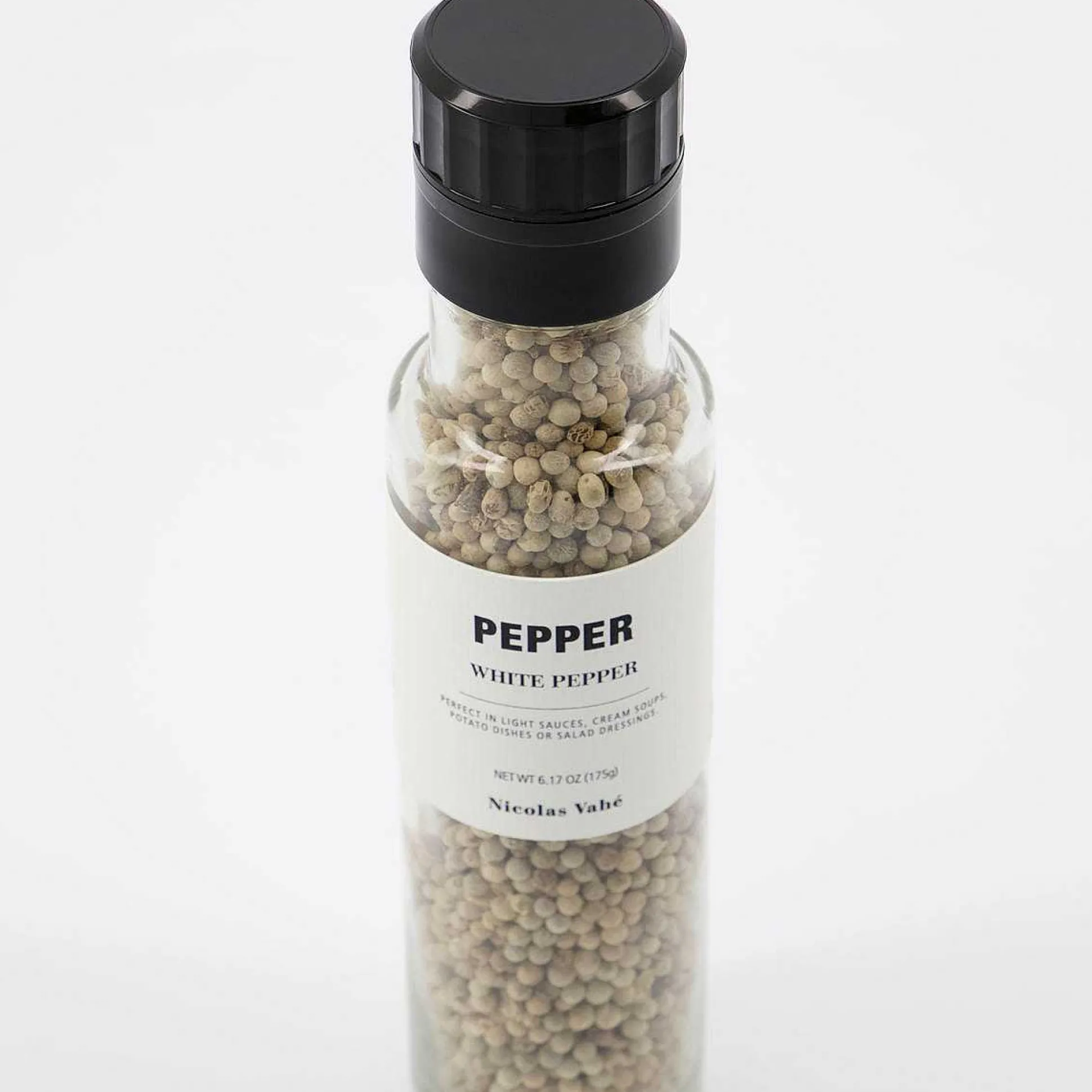 Enjoy the delicious and delicate white pepper from Nicolas Vahé that has a strong, distinctive flavour and a light aroma. Make the most delicious sauces with white pepper, or use it in soups, potato dishes and salad dressings to add extra flavour. The fine and bright peppercorns come in a beautiful and decorative grinder, so you can display it on your dining table or in your kitchen along with other spices.