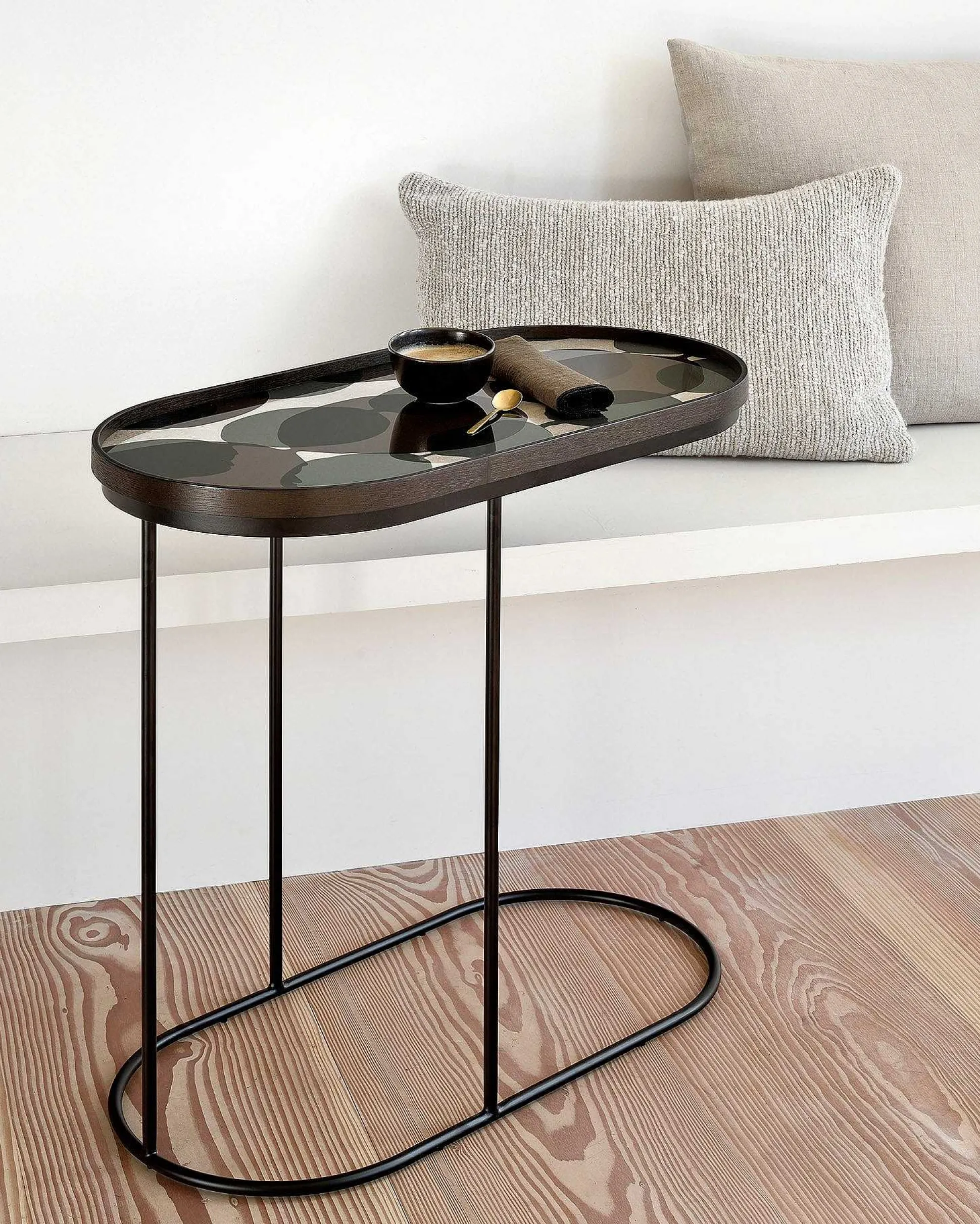 The oblong tray table is one of our most versatile pieces: while it serves its function as a side table, its ability to adopt different trays allows you to mix or match various colors and patterns, creating a personal piece that is uniquely yours.