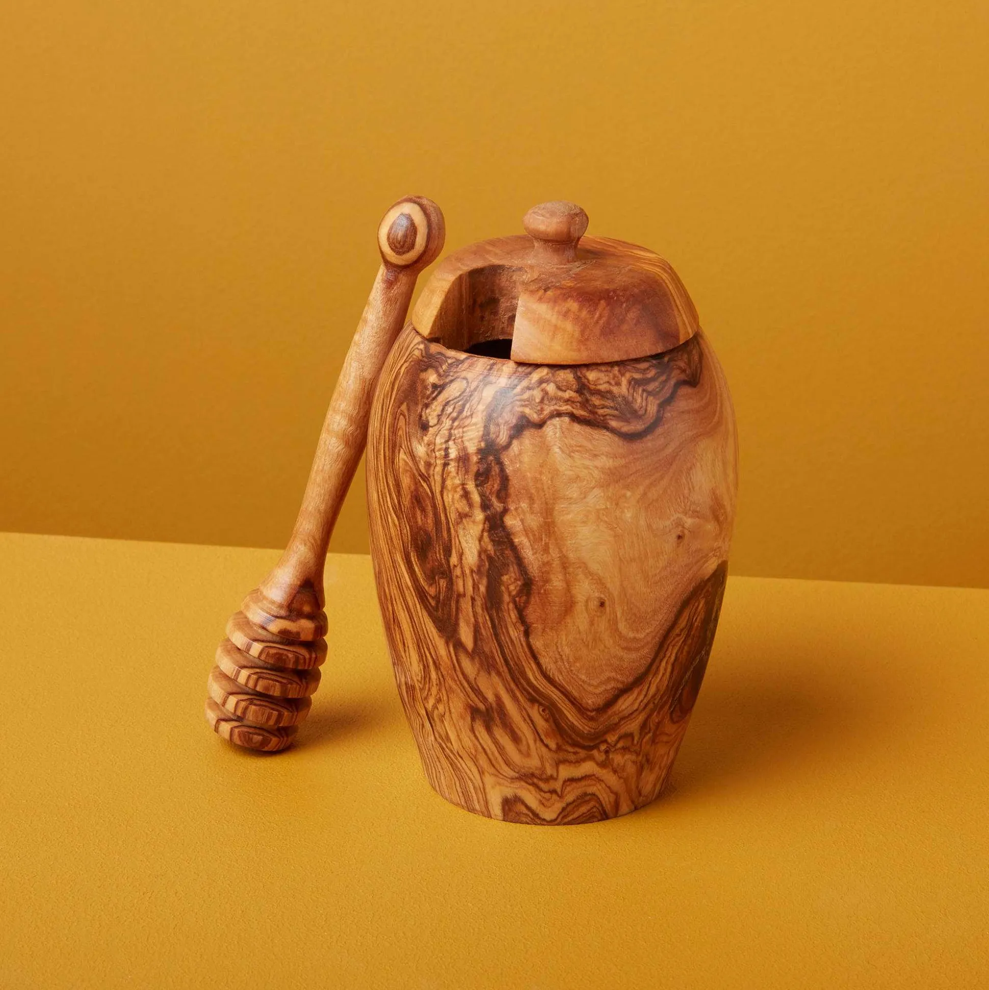 This one-of-a-kind Olive Wood Honey Jar will be the perfect addition to your tea station or kitchen countertop. Pull this organic beauty out at your next tea party to wow your guests with it’s exquisitely unique wood grain pattern.
