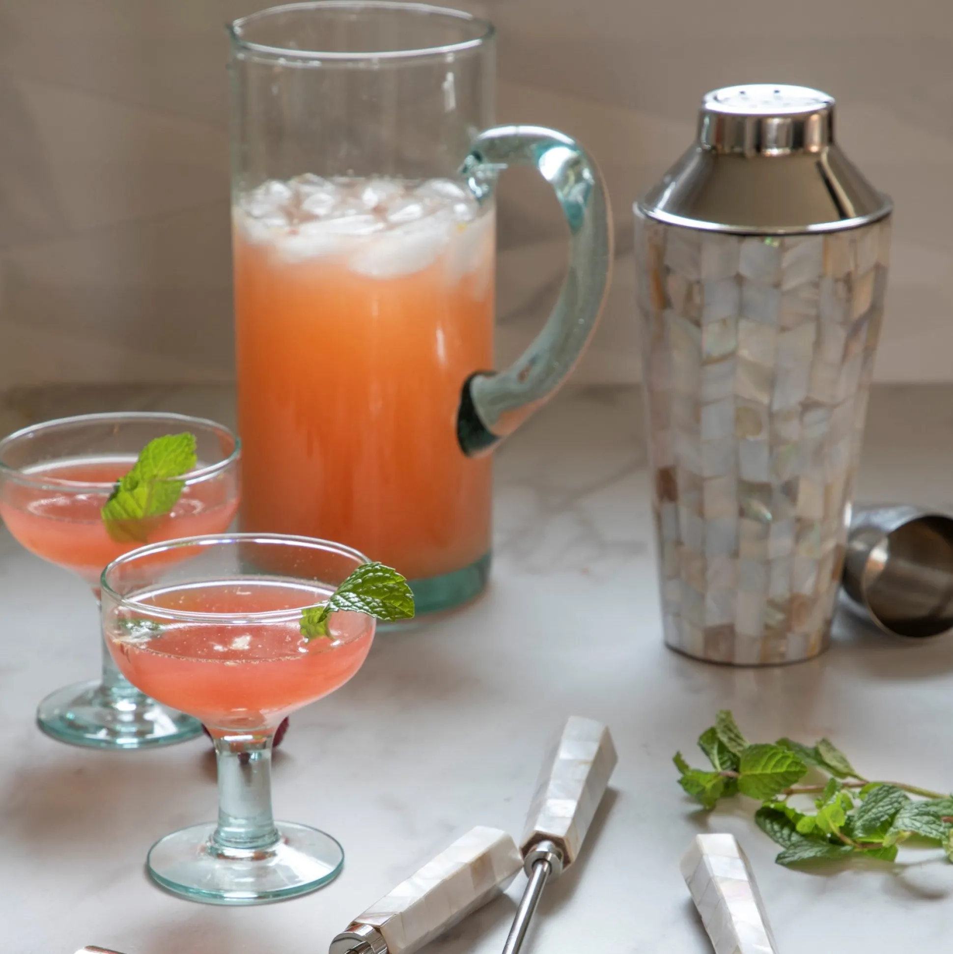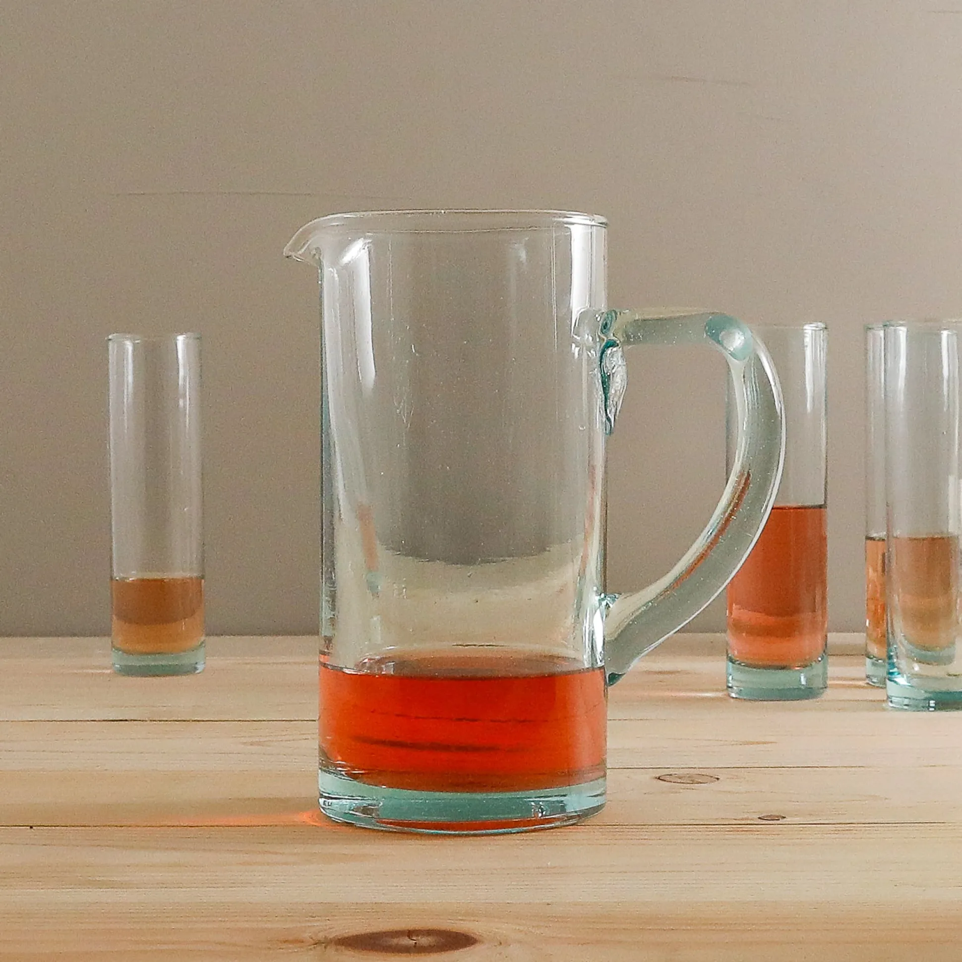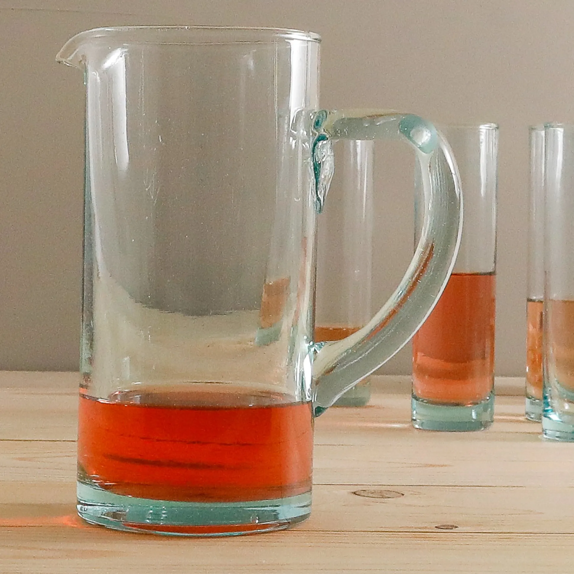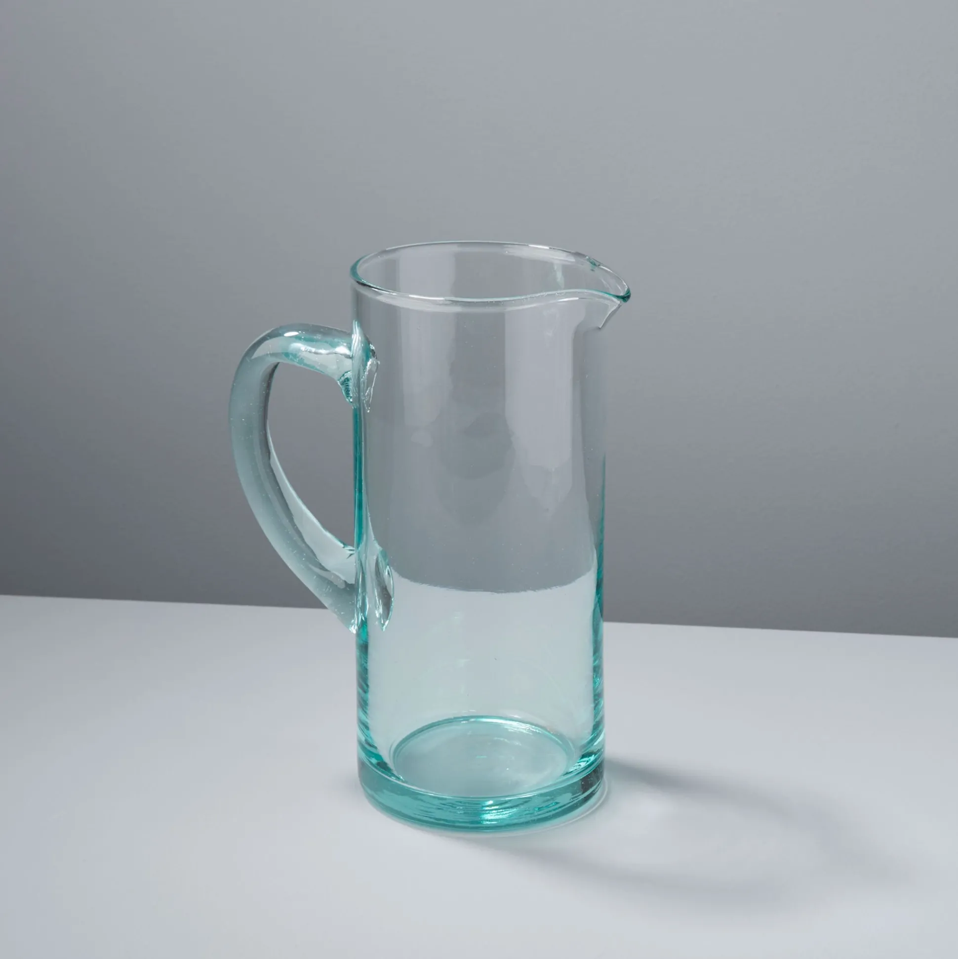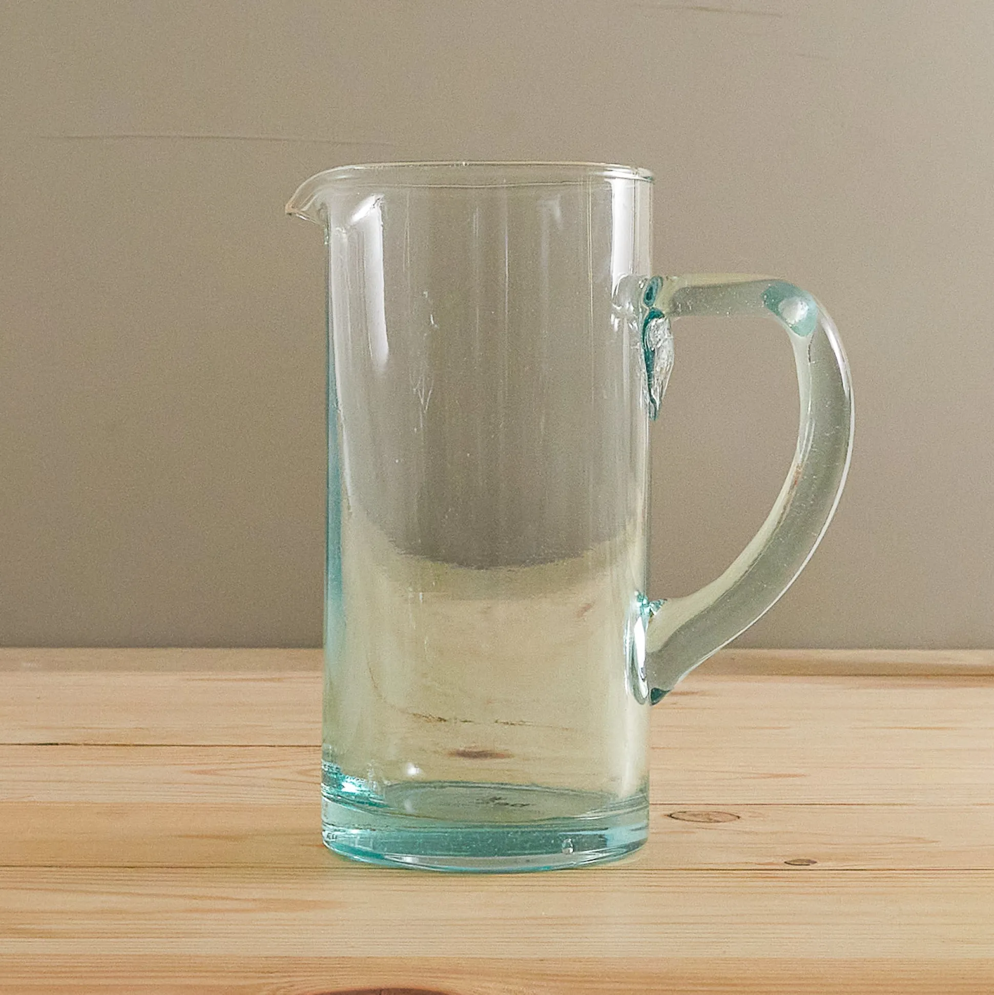 The premium recycled glass pitcher is a sleek, modern vessel for all your liquid desires. This handcrafted beauty is perfect for everyday use, from beverages at Sunday brunch, to midweek dinner mixers.