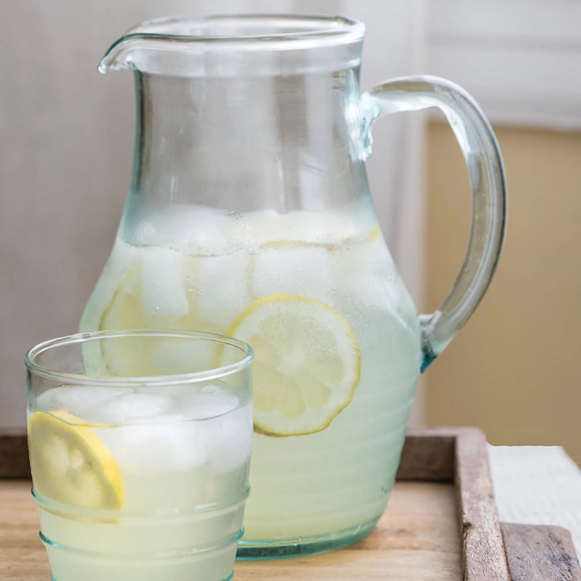 The premium recycled glass pitcher is a classic, yet sophisticated vessel for all your liquid desires. This unique collection adds a bit of texture to our traditional recycled glassware and truly feels good in your hand. Each of your guests will enjoy a one-of-a-kind beverage knowing no two pours will ever be the same.