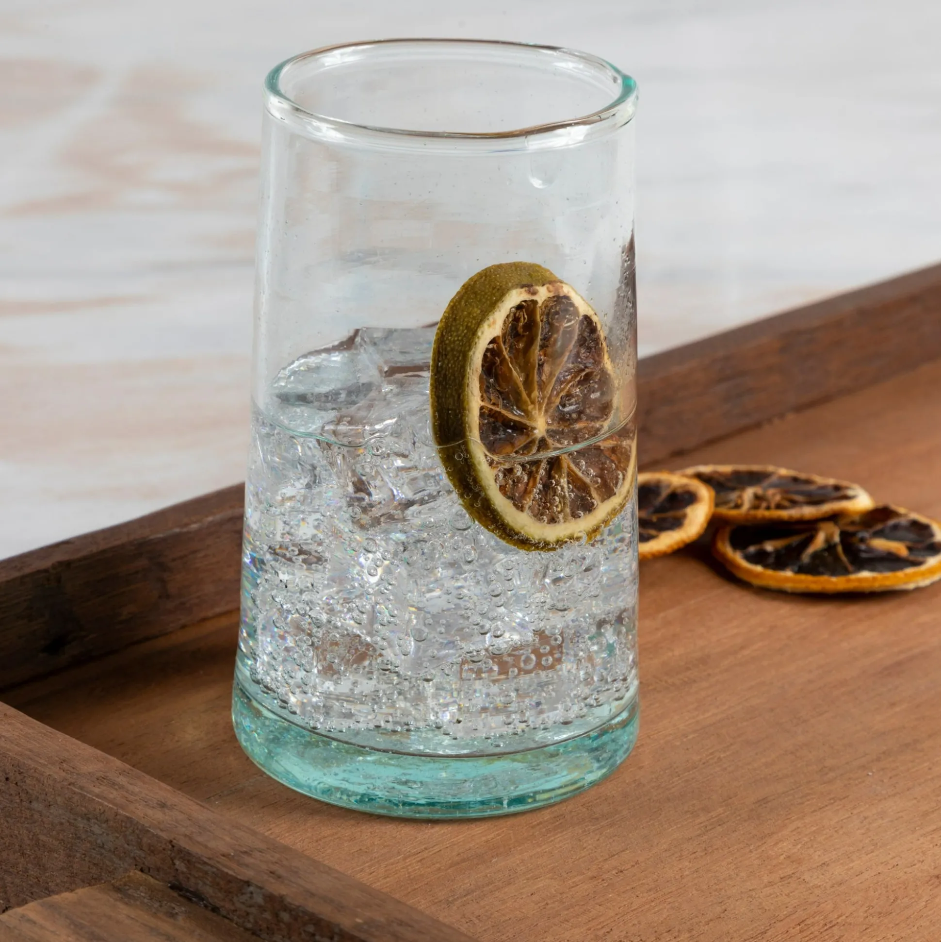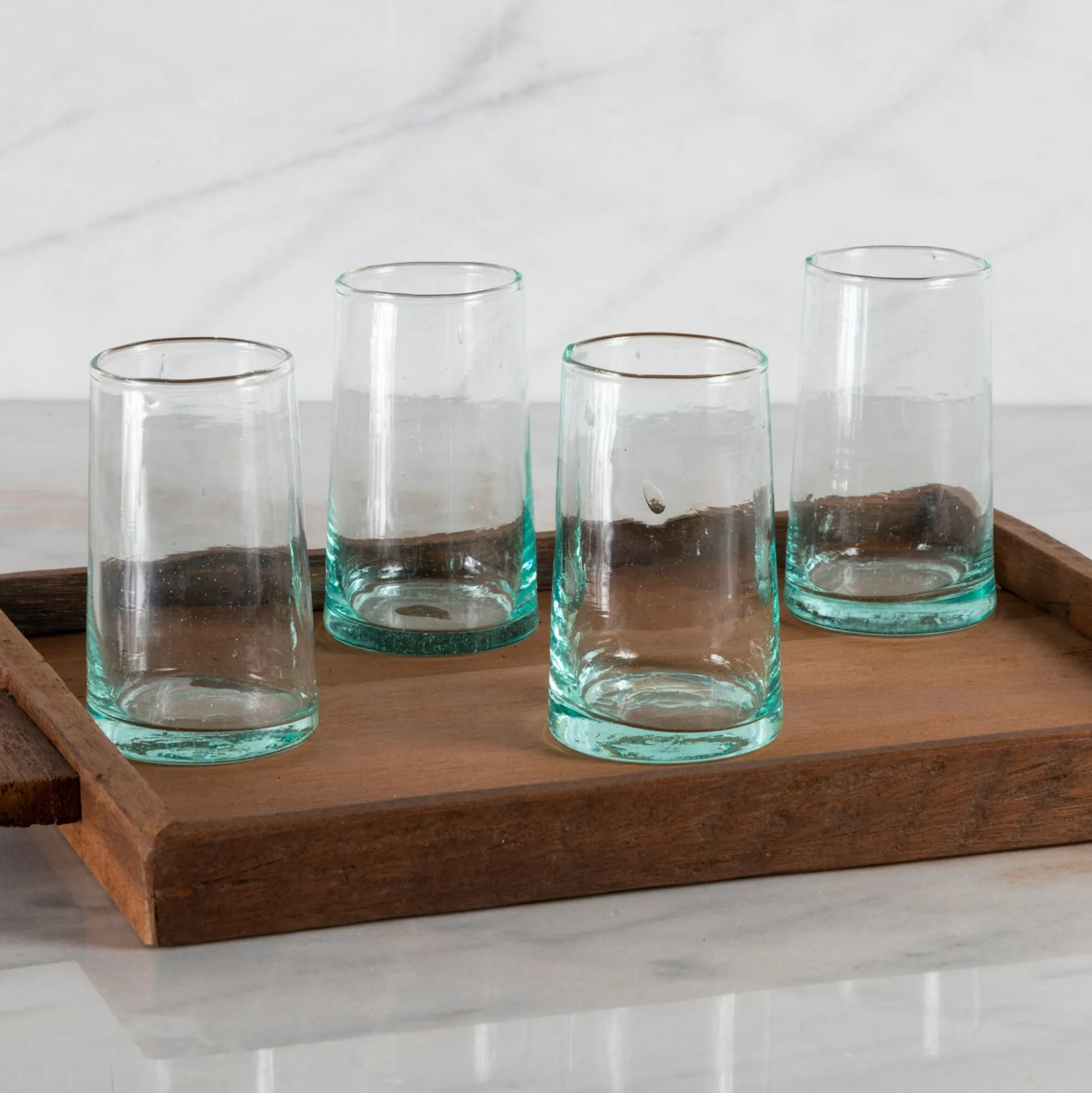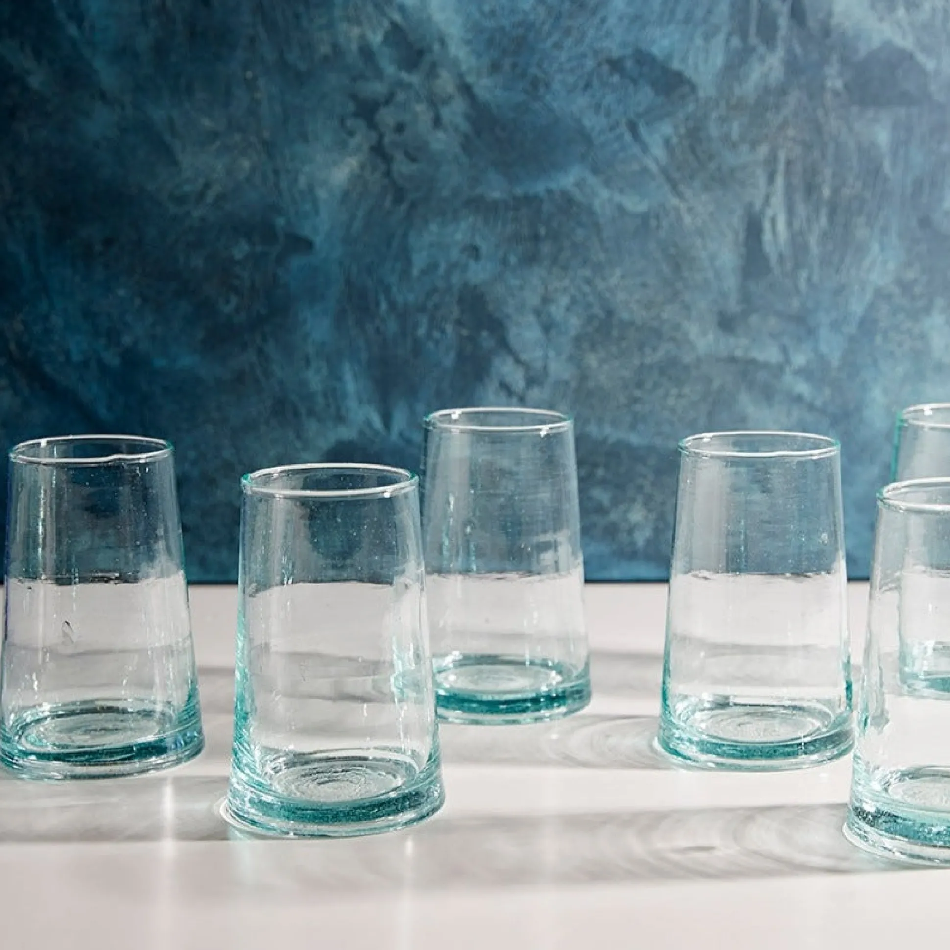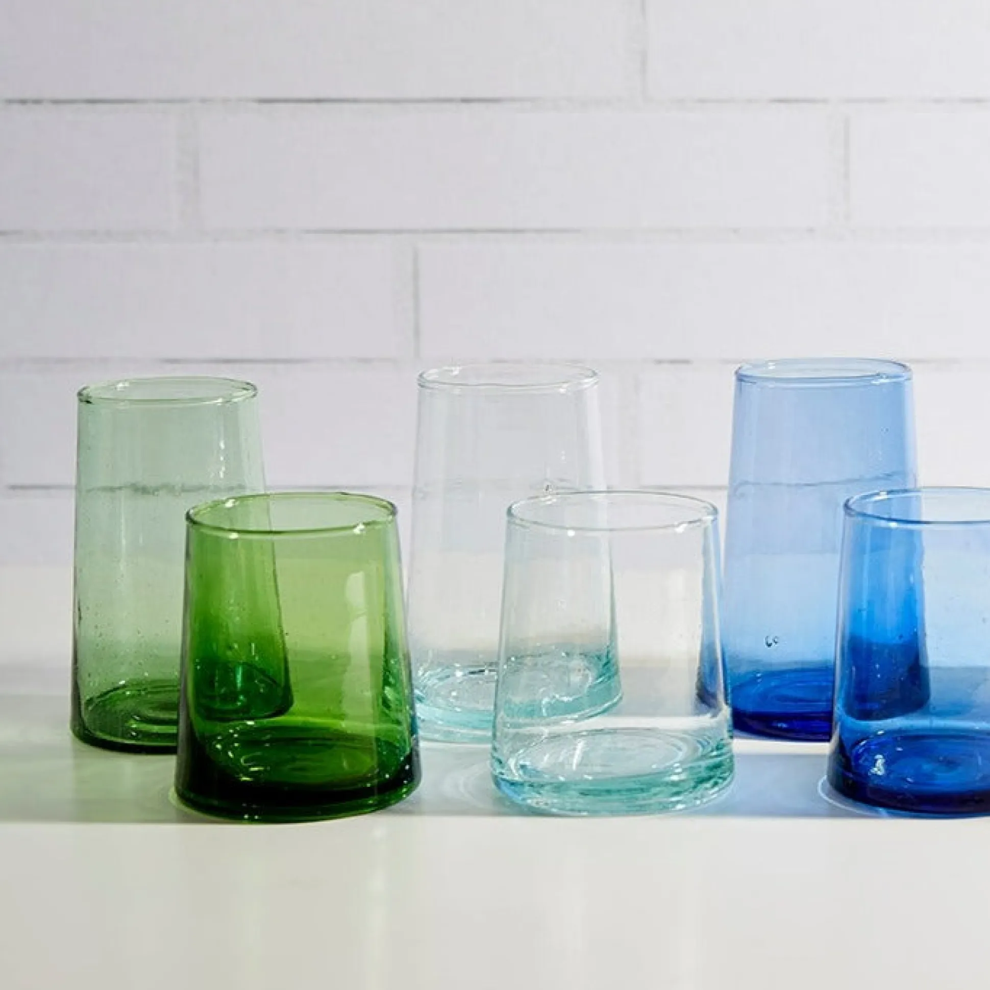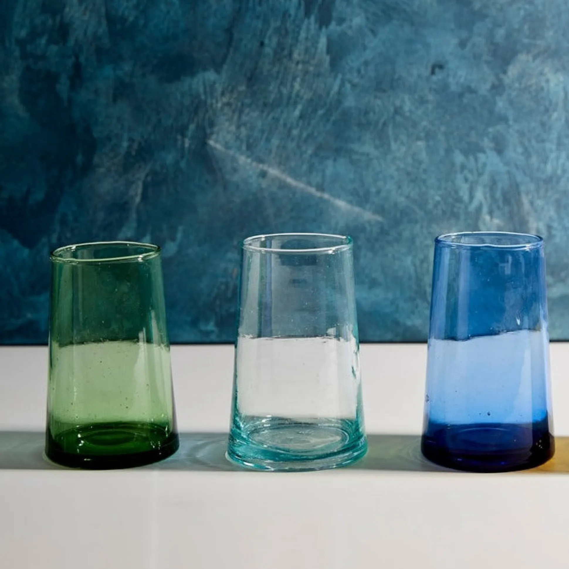 The sleek and simple design of these hand-blown cone shaped glasses are a testament to the style and skill of the artisans who make them. Used for all types of beverages or as little vases to decorate each table setting, you will enjoy the feel of them in your hand as you toast the joys of the day. Our Moroccan glassware sets come in three distinct shades of transparent glass (Clear, Blue & Green). The handblown construction is evident in the bubbles suspended in the glass itself, and the organic forms that the vessels take. Made from recycled bottles, these sets are a second act for glass that would otherwise be sent to landfills.