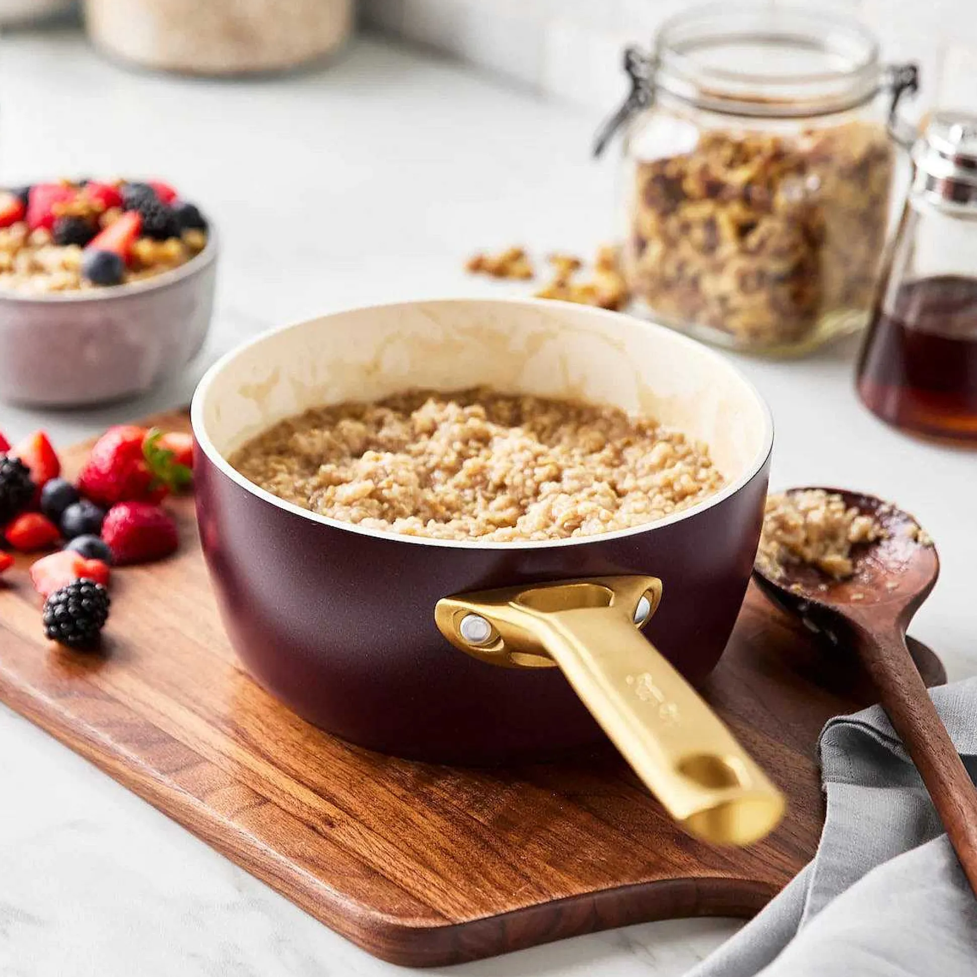 - Set includes: 8″ Frypan, 11″ Frypan, 2 qt. Saucepan with Lid, 3 qt. Saucepan with Lid, 3 qt. Sauté Pan with Lid, 5 qt. Stock Pot with Lid.