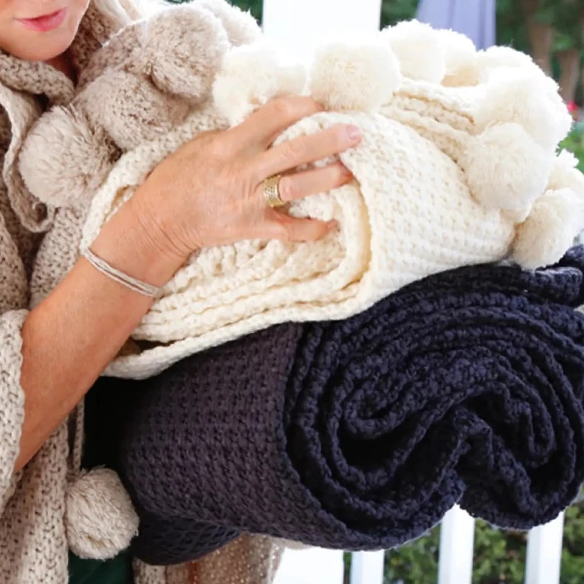 Super cozy with a tight knit, and soft pom pom along the edge.