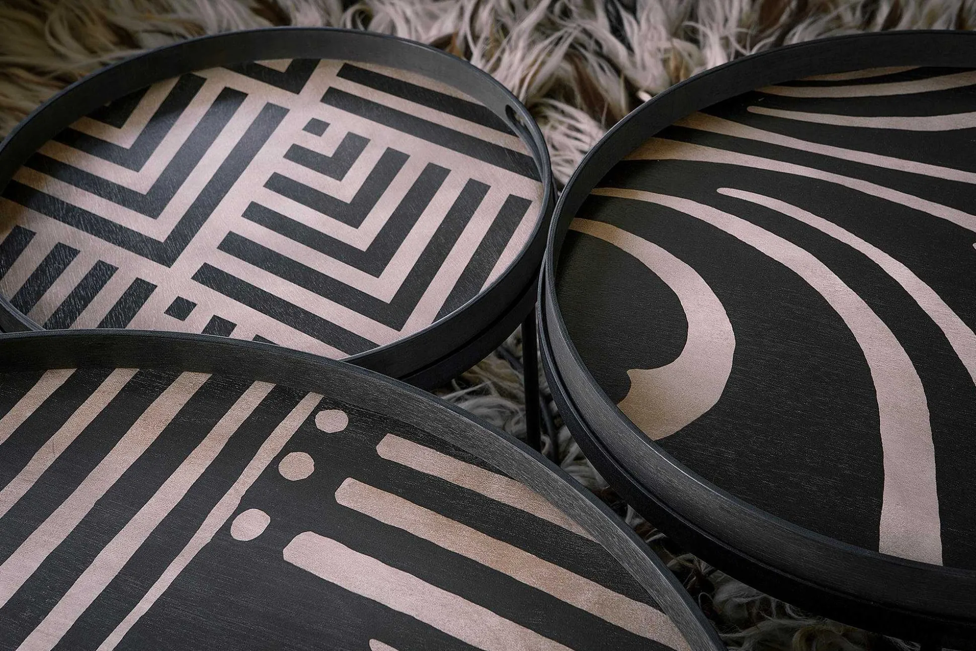 The Urban Geometry collection of trays is inspired by the Art Deco architecture and geometric patterns. Although streamlined with a monochromatic palette for the majority of the designs, you will find a burst of paprika, pumpkin, saffron and a dash of steel blue to balance out the collection. Add this wooden serving tray to any environment to add touches of color and interest throughout the space.