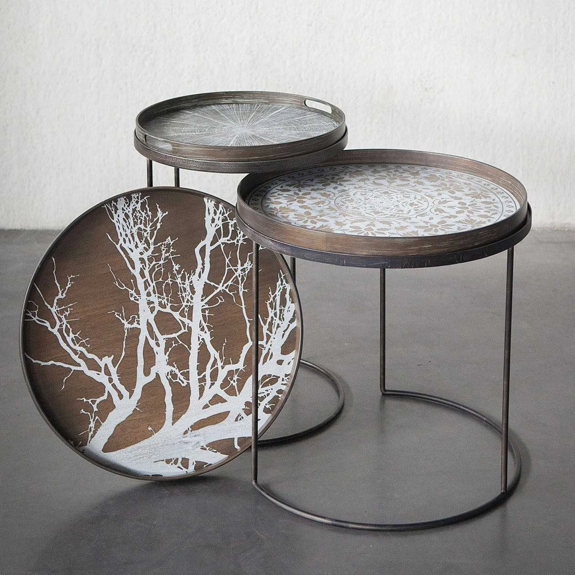The round tray table is one of our most versatile pieces: while it serves its function as a side table, its ability to adopt different trays allows you to mix or match various colors and patterns, creating a personal piece that is uniquely yours. And of course, a set equals twice the fun and creativity.