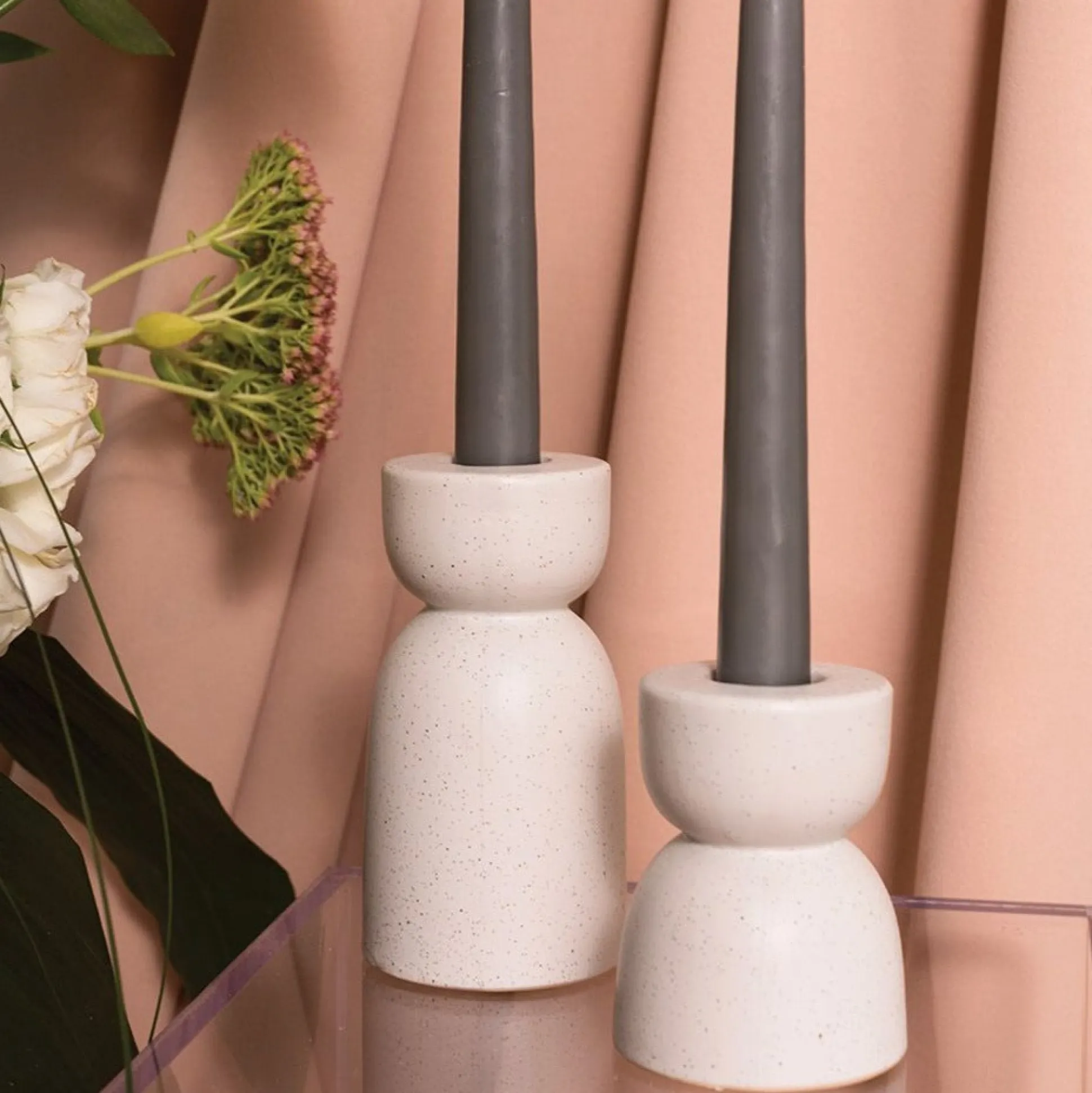 This chic candlestick pairing puts a modern spin on classic minimalism with smooth curves and subtly textured ceramic. Whether you are adorning a mantle or setting the table, this stunning duo is sure to set the mood.