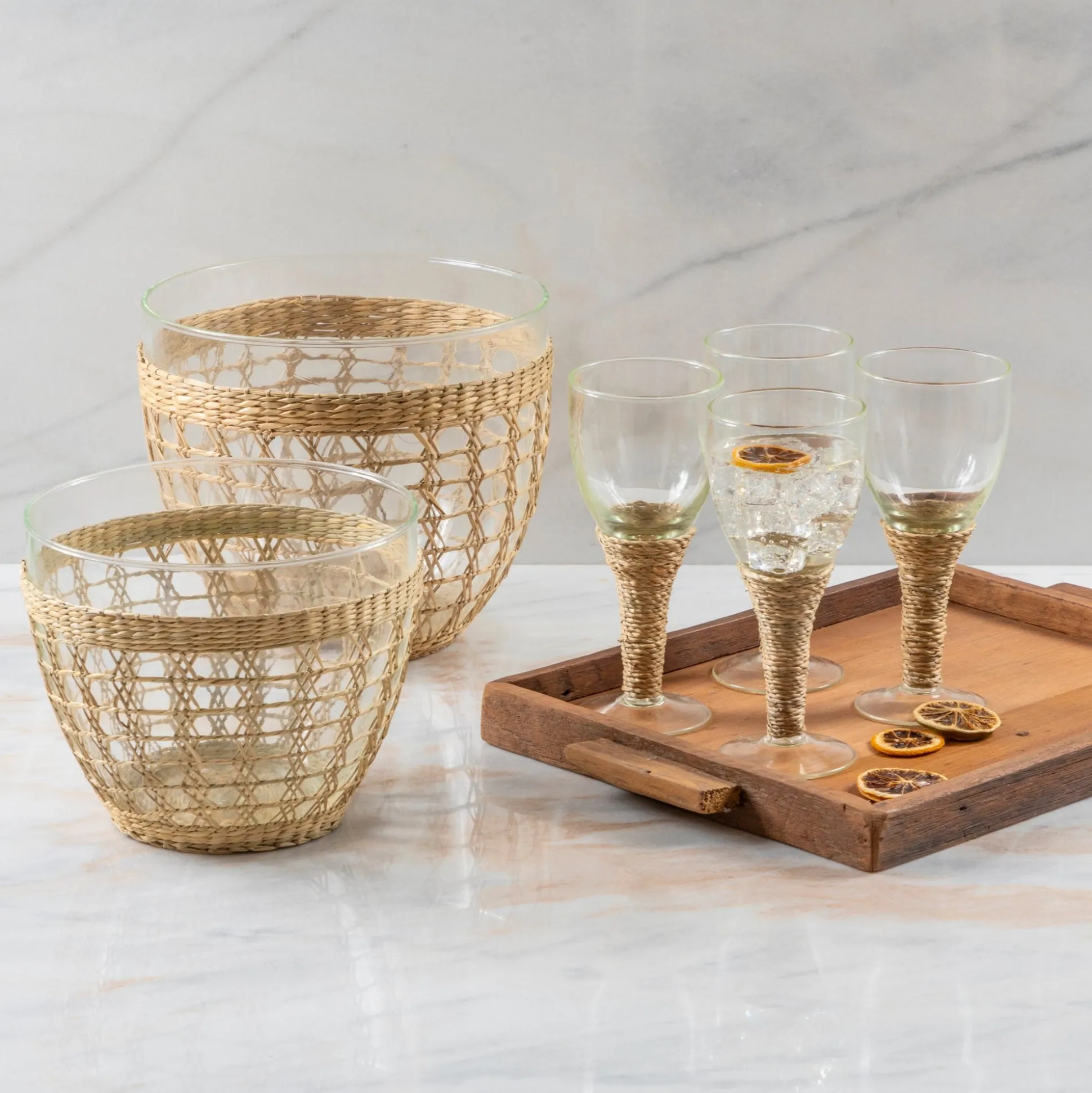 Seagrass meets glassware in this collection, which is an update on an old favorite. Natural wraps on pitchers and matching glassware make festive pieces for indoor and outdoor drinking and dining.