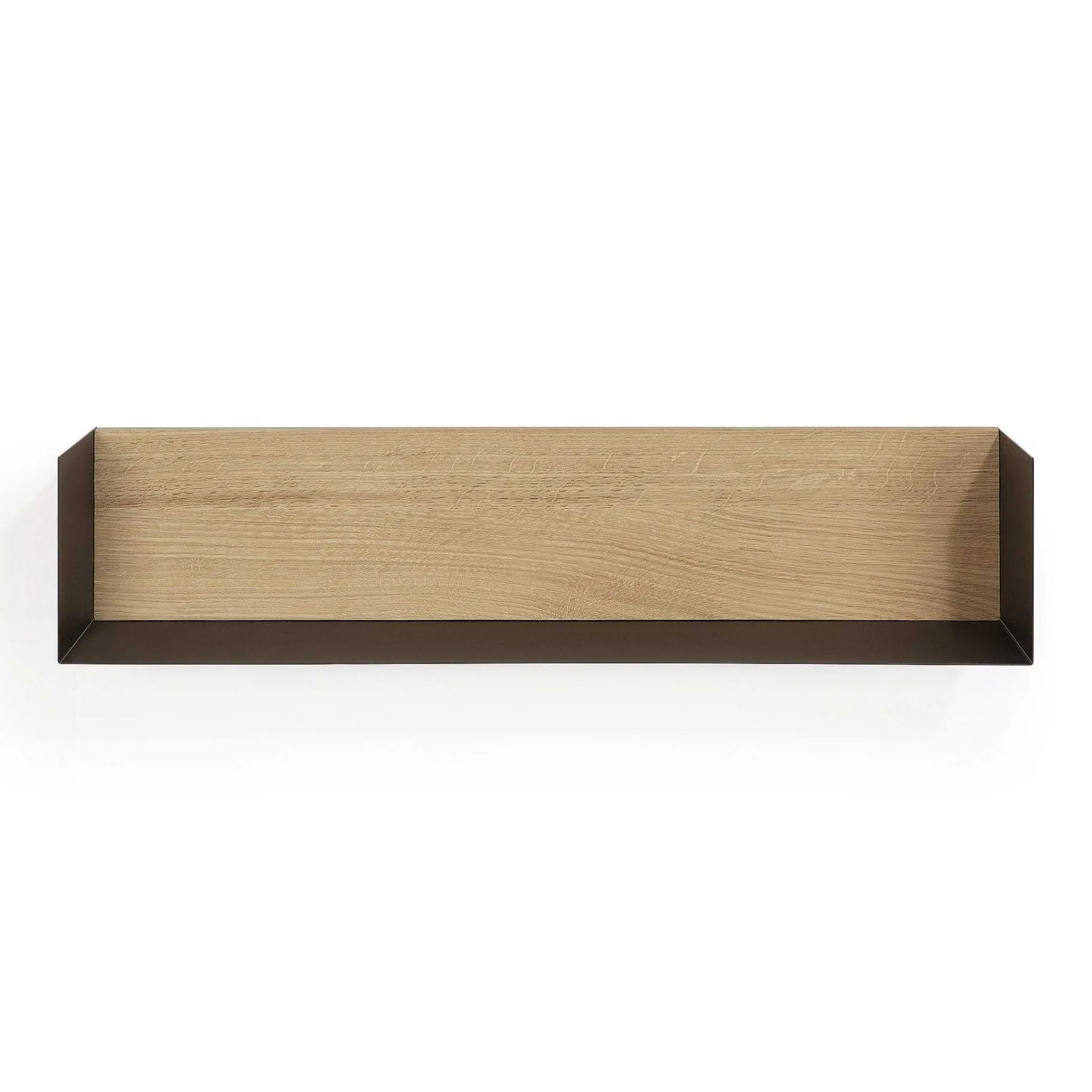 The silhouette of the Oak U wall shelf goes along the wall like a thin sharp line. The back in solid oak allows an easy and secure fixing on the wall, while the mix with thin metal makes a high quality and durable product. The invisible fixing on the wall makes the shelf appear airy.