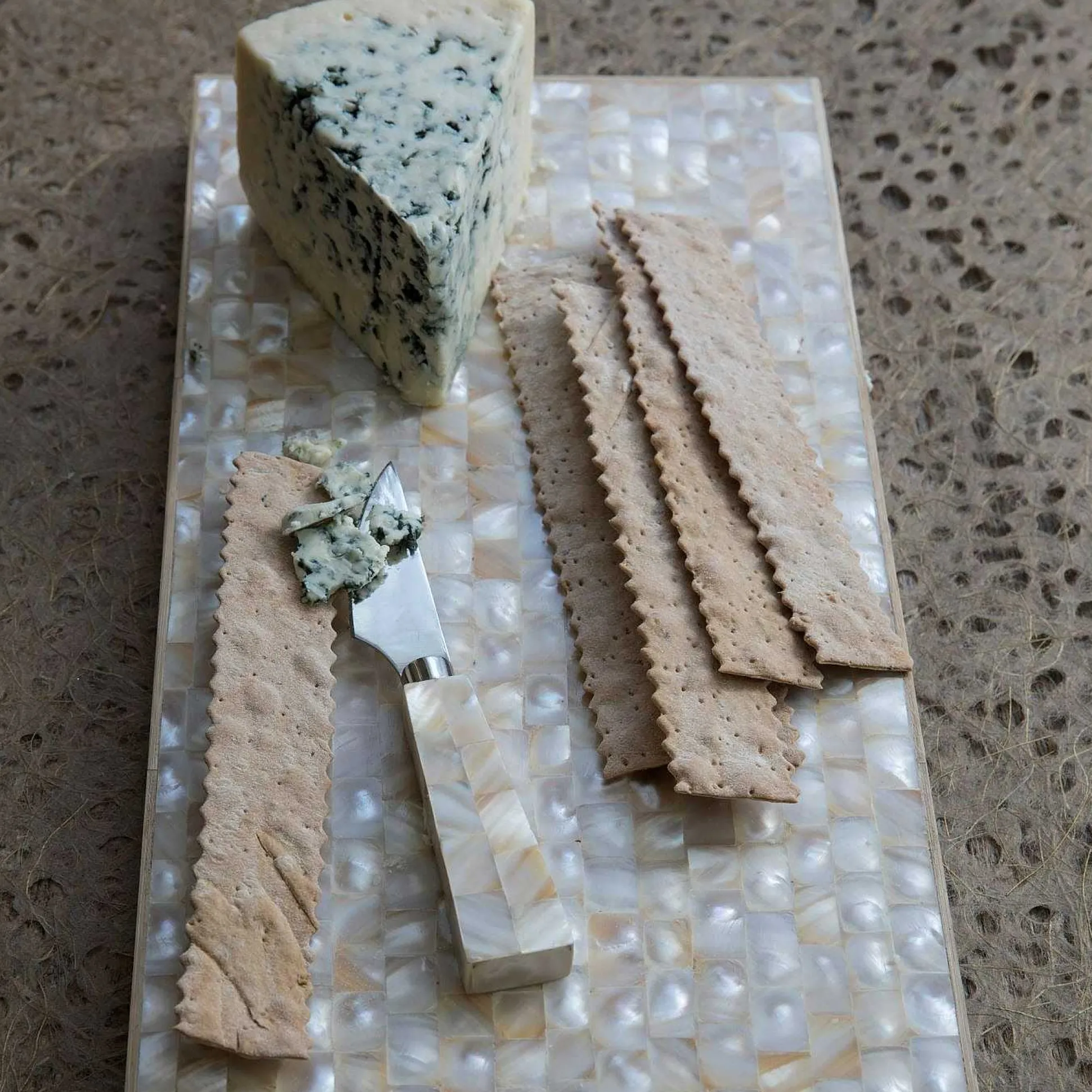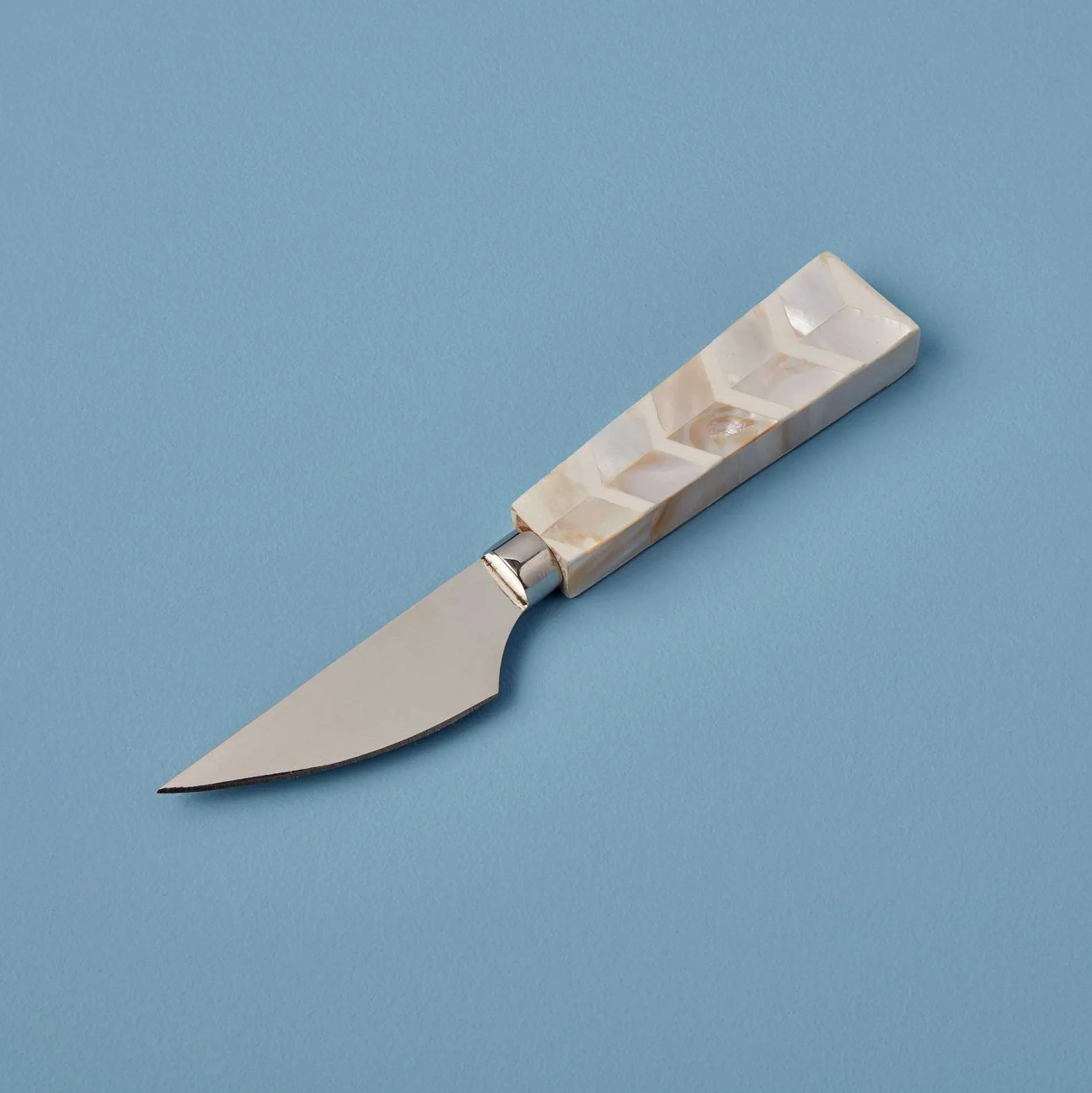 Featuring the iridescent tones of pearl, pink, and gray of our Shell, and shimming stainless attachments, our Stainless Steel & Shell Mosaic Cheese Knife is for the chic cheese aficionado. Slice and spread your favorite dairy delicacies with style and ease. Pair with our Shell Mosaic & Bamboo Rectangular Board for a dazzling duo!