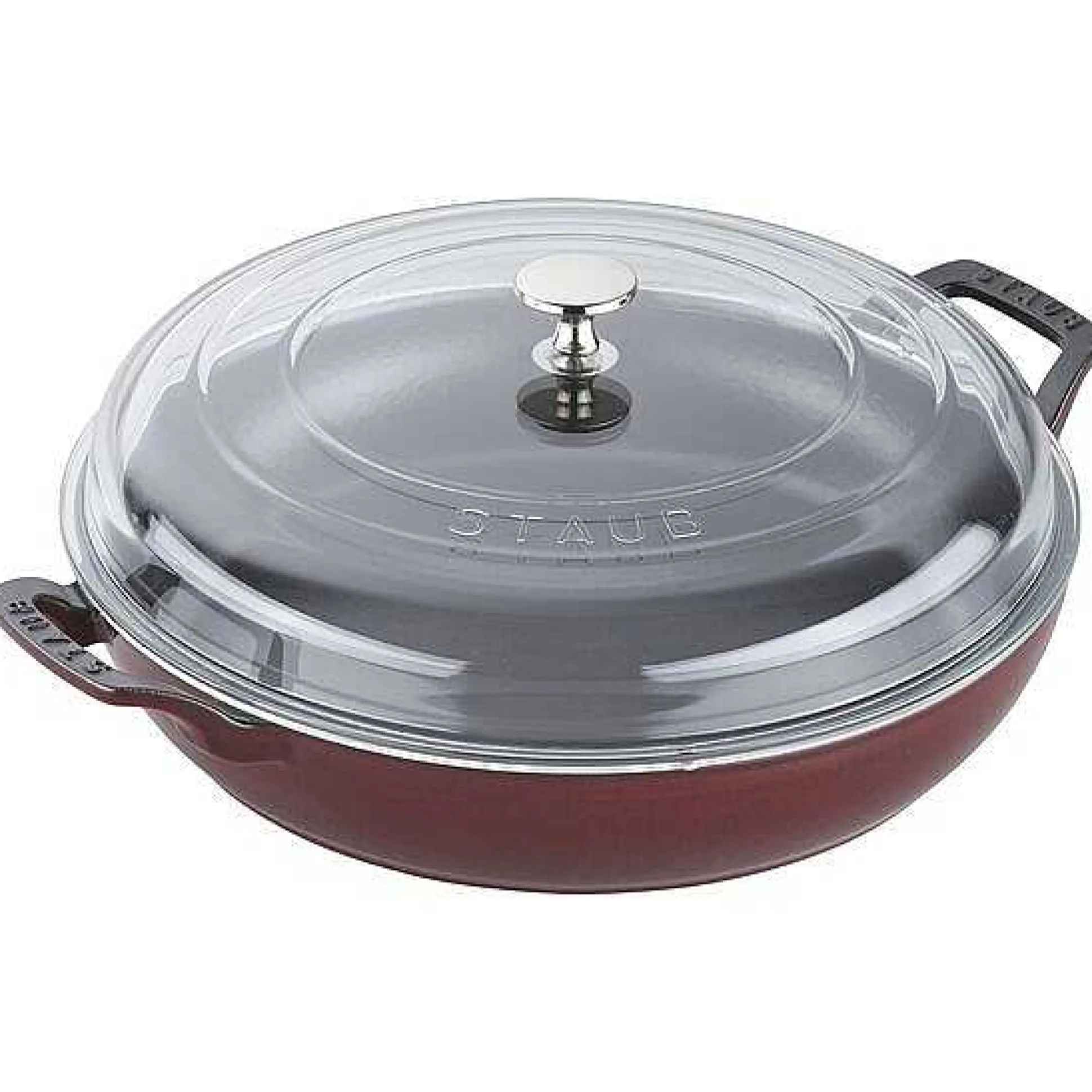 The STAUB 3.5-quart braiser with glass lid is the perfect cookware for one-pot dinners, slow-cooked braises, and simmered soups. The heavyweight, domed glass lid locks in moisture and accommodates large cuts of meat. STAUB cast iron possesses exceptional heat-retention qualities, so the pot heats evenly throughout. The textured black matte enamel interior ensures exceptional browning and requires no seasoning.