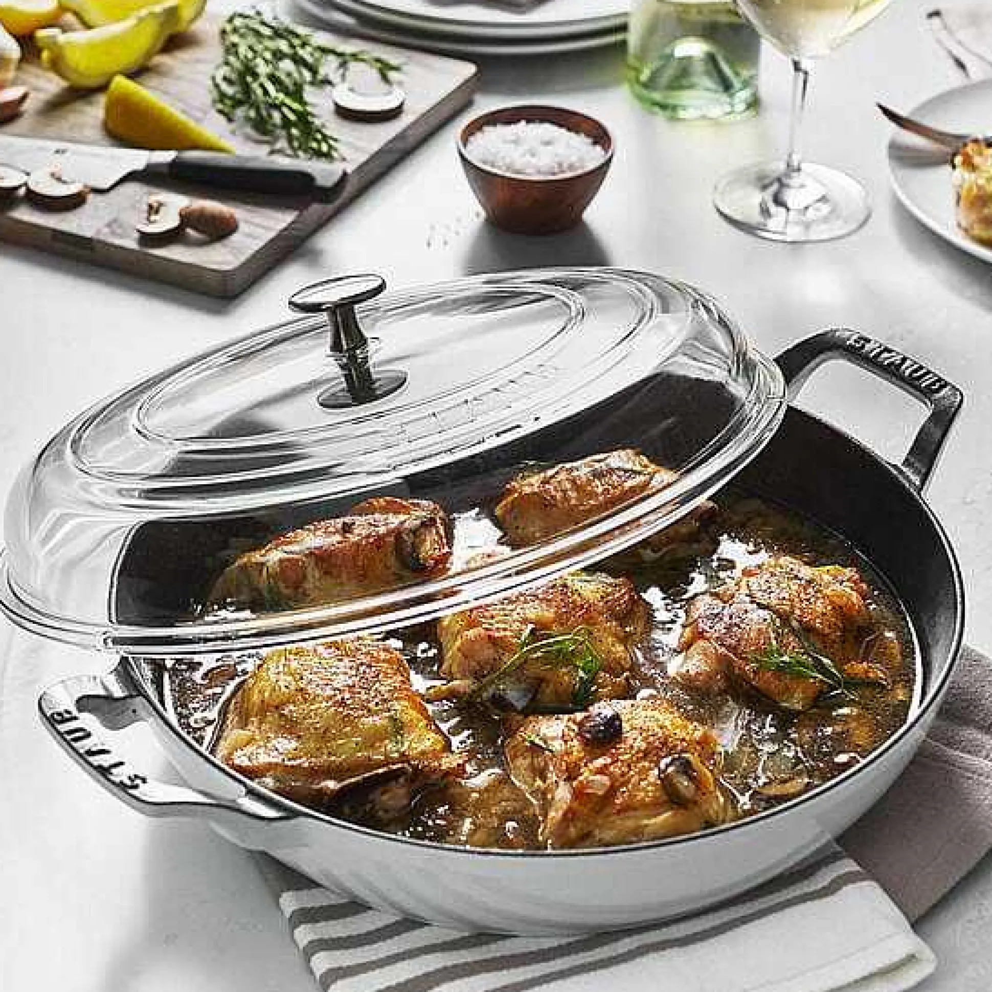 The STAUB 3.5-quart braiser with glass lid is the perfect cookware for one-pot dinners, slow-cooked braises, and simmered soups. The heavyweight, domed glass lid locks in moisture and accommodates large cuts of meat. STAUB cast iron possesses exceptional heat-retention qualities, so the pot heats evenly throughout. The textured black matte enamel interior ensures exceptional browning and requires no seasoning.